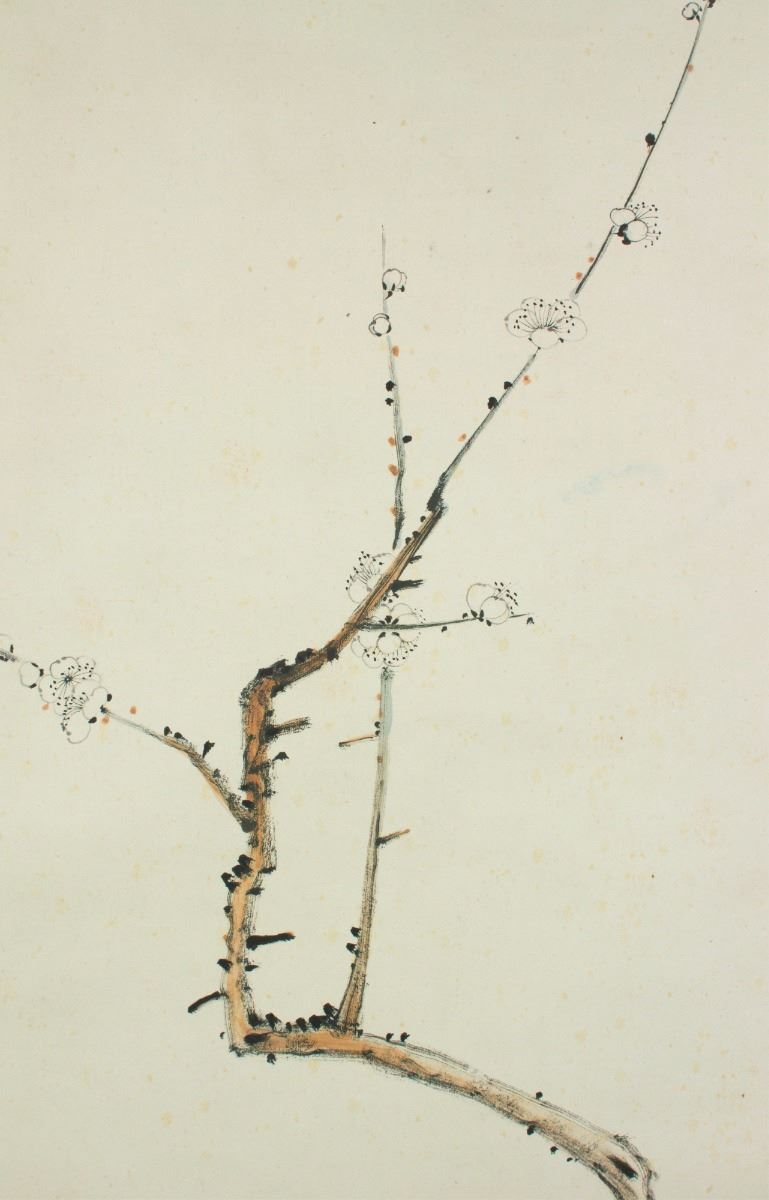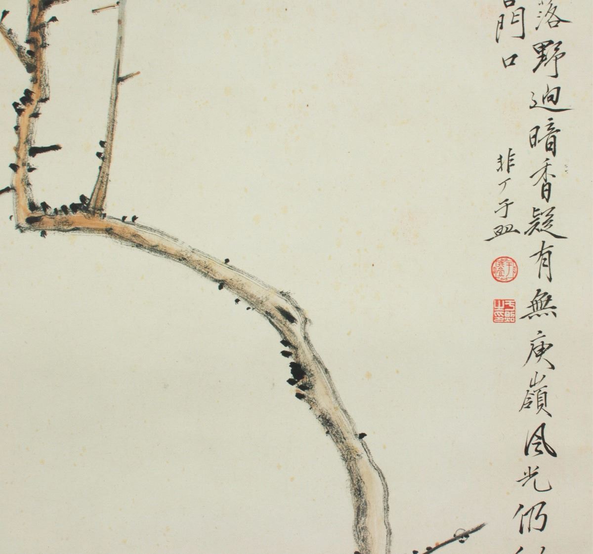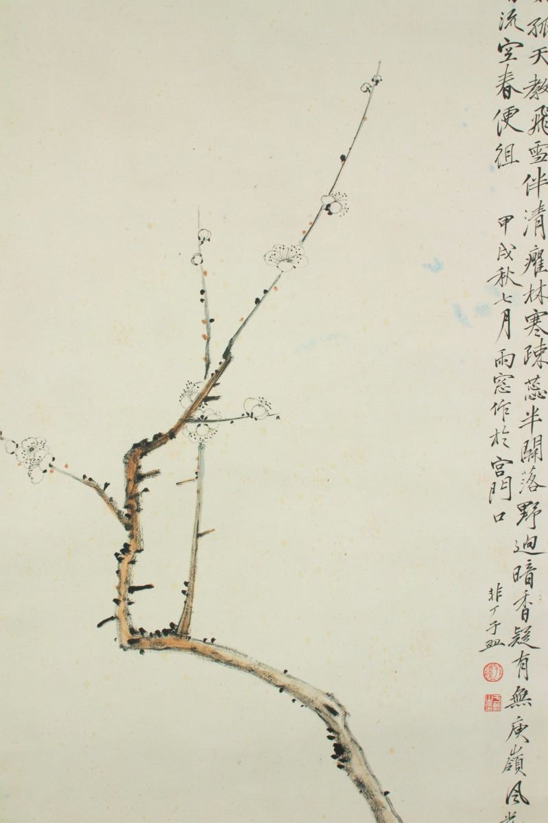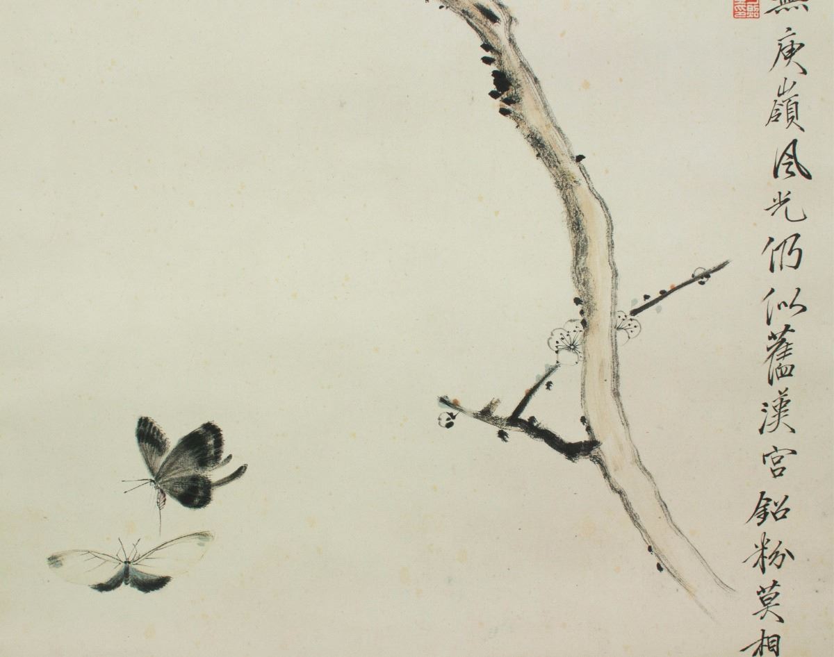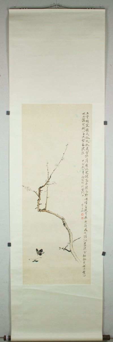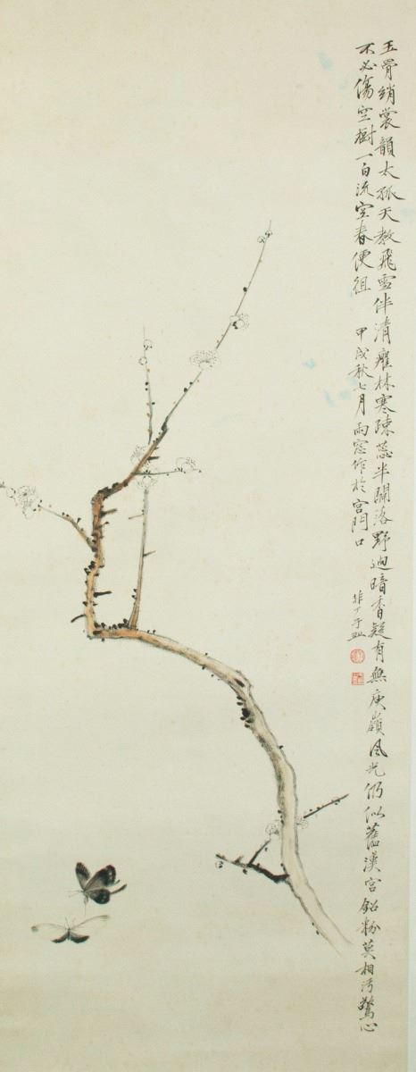 Butterfly and plum blossom branches, hanging scroll, Chinese ink and watercolour painting on paper, signed and sealed by Yu Fei'an. 115.5 cm X 44cm
