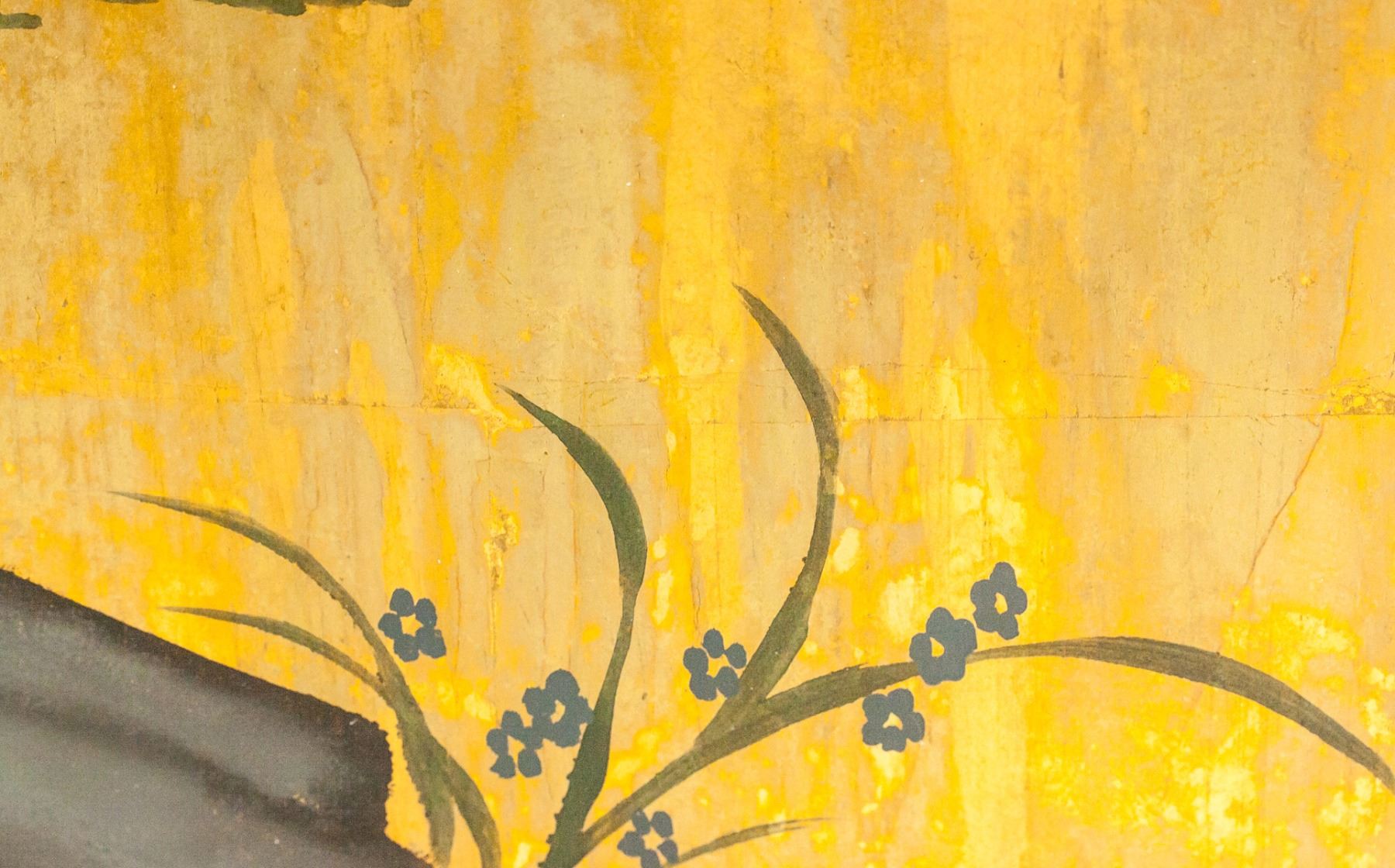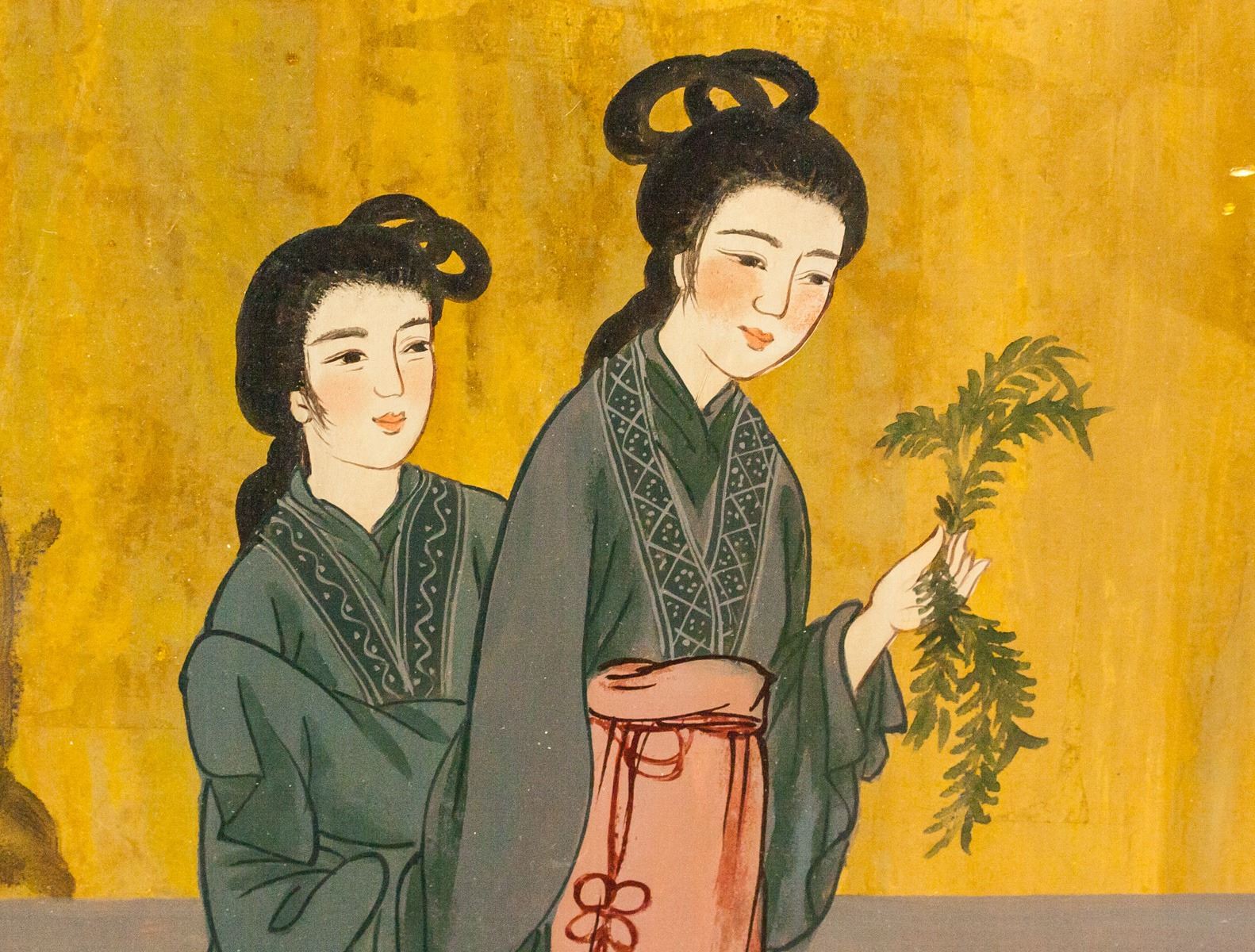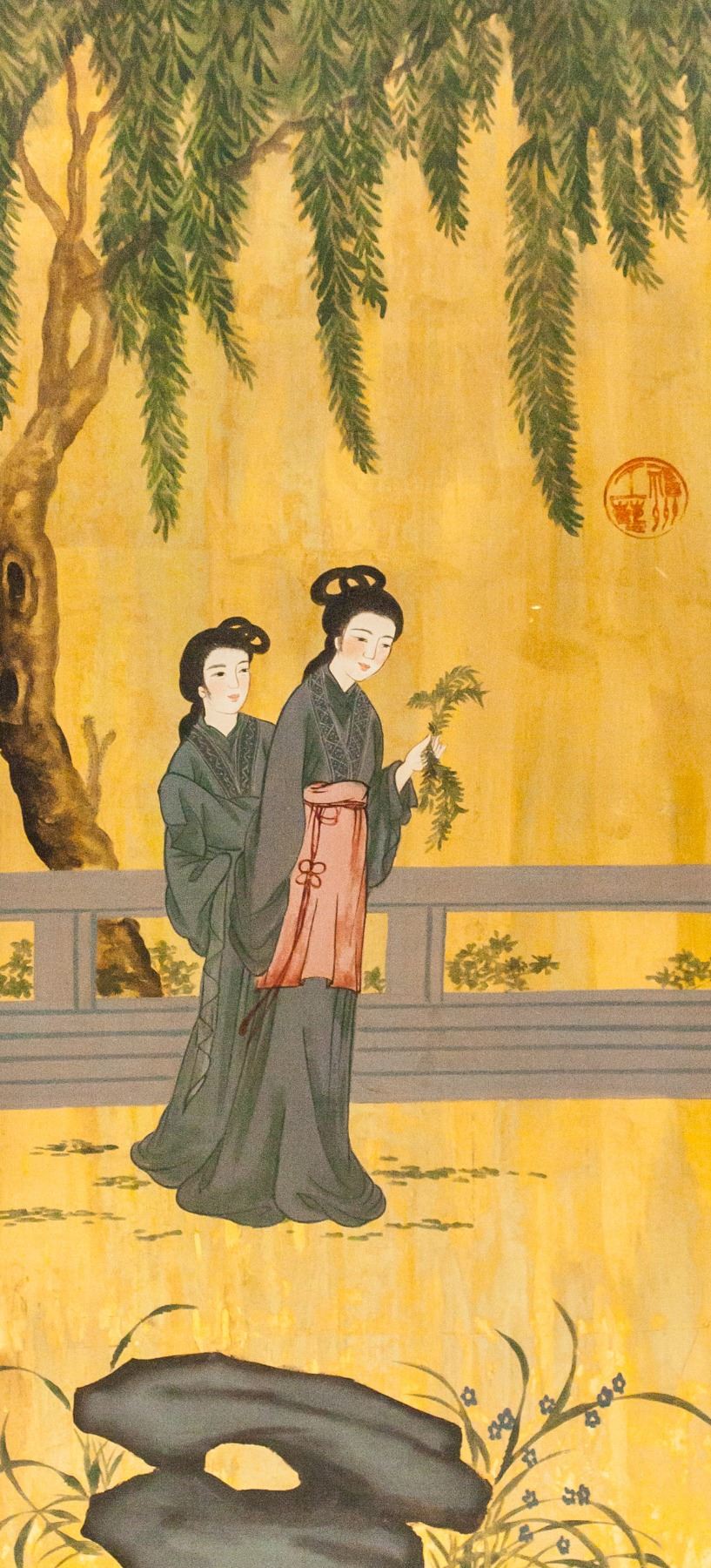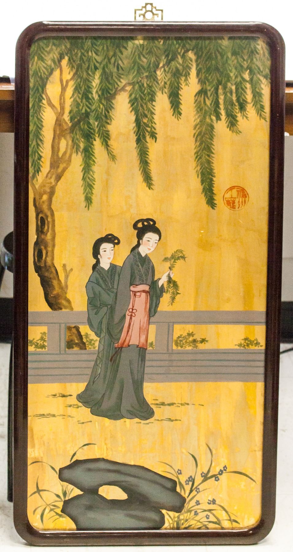 Chinese painted wood panel. Featuring two women in a garden. Inscribed with one seal. Frame: 91.5 x 46 cm.