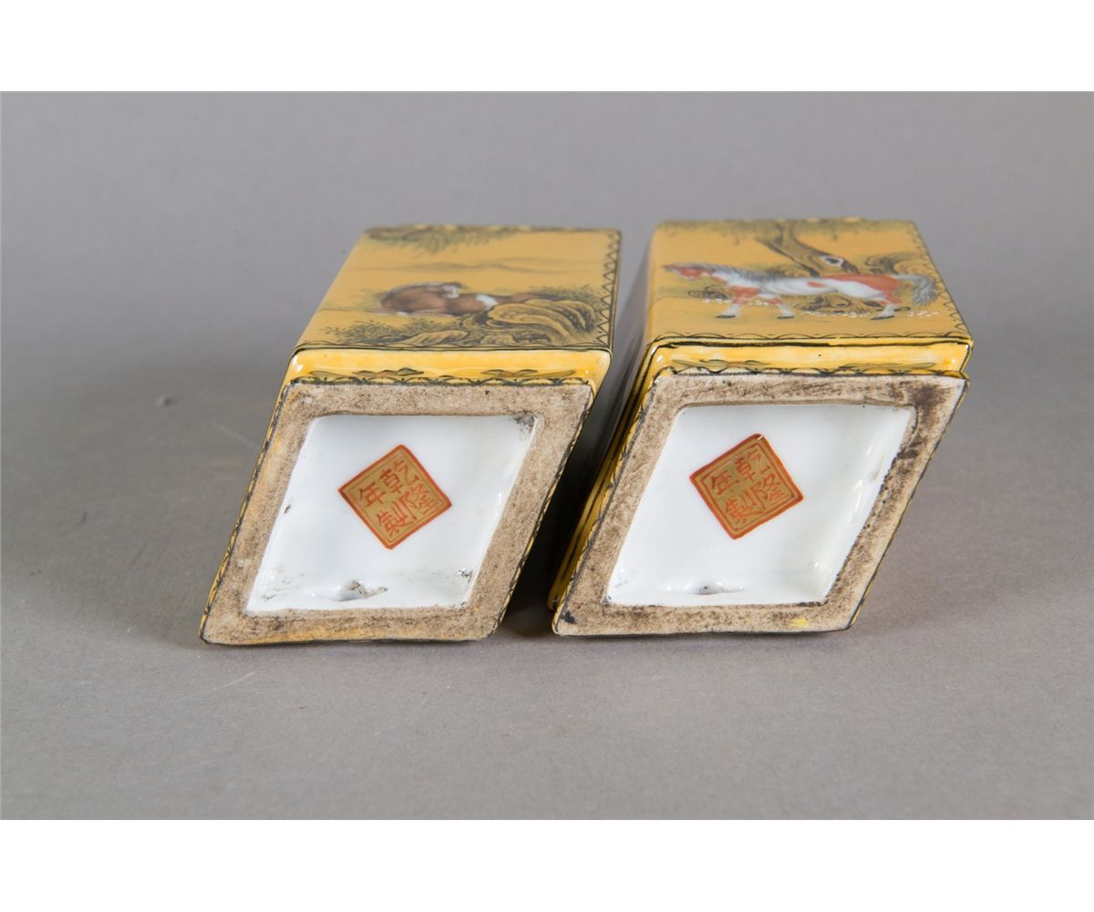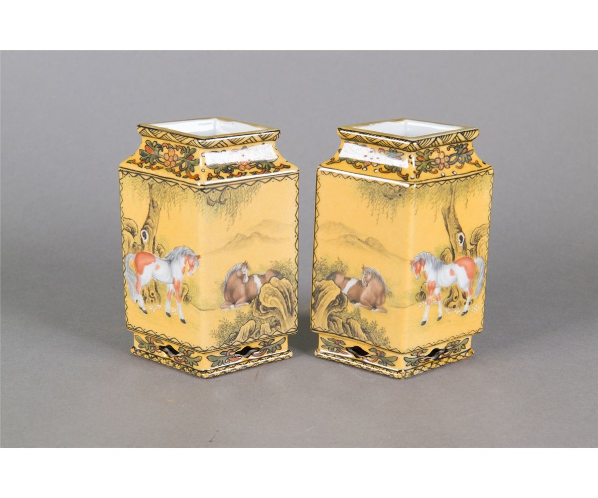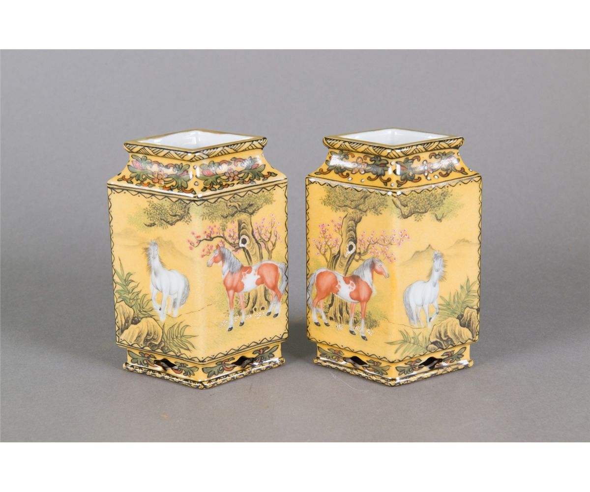 Pair of Chinese square vases; featuring eight horses painting on yellow ground; four-character Qianlong mark on base; H: 11 cm, W: 8 cm, 220 grams each
