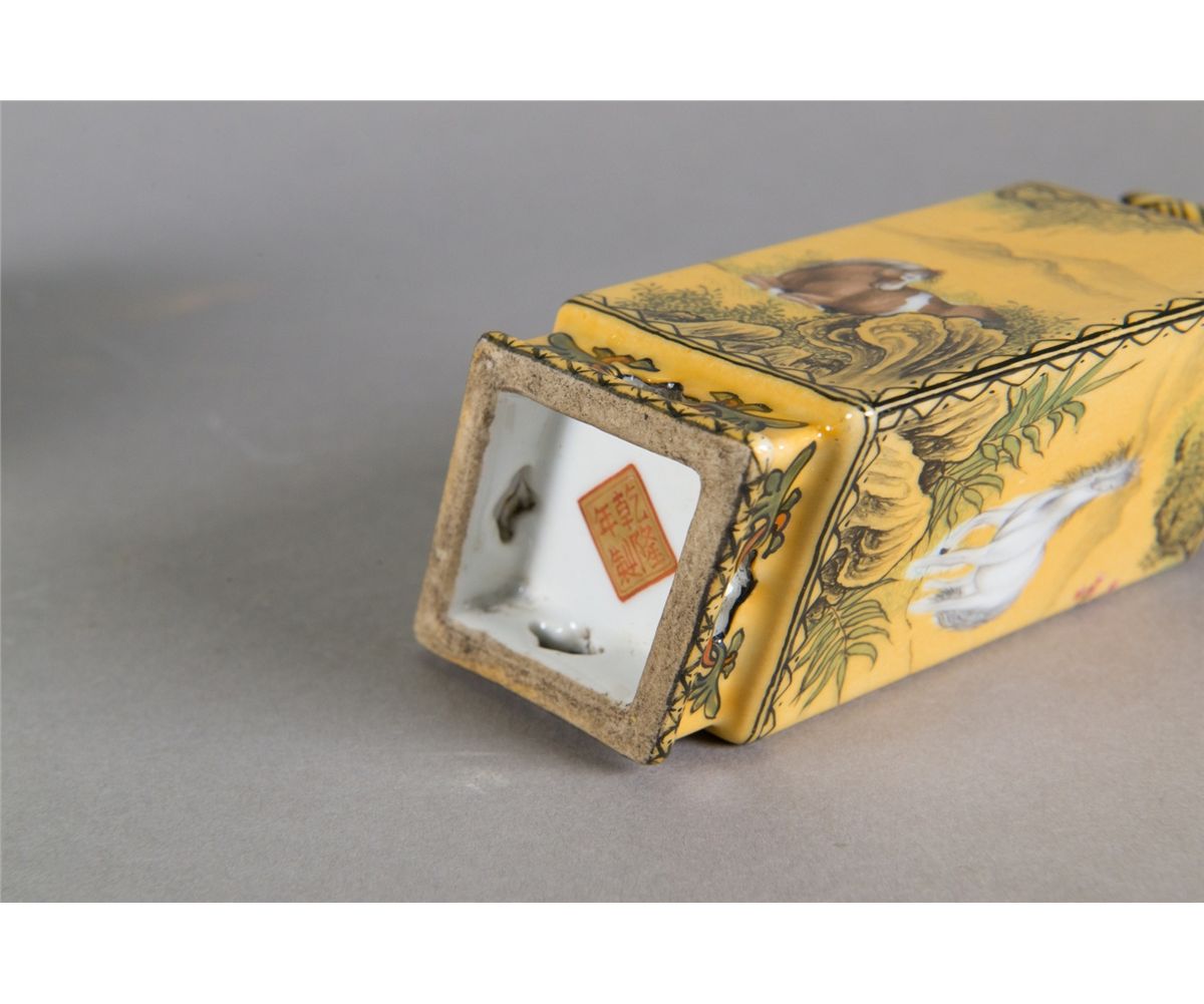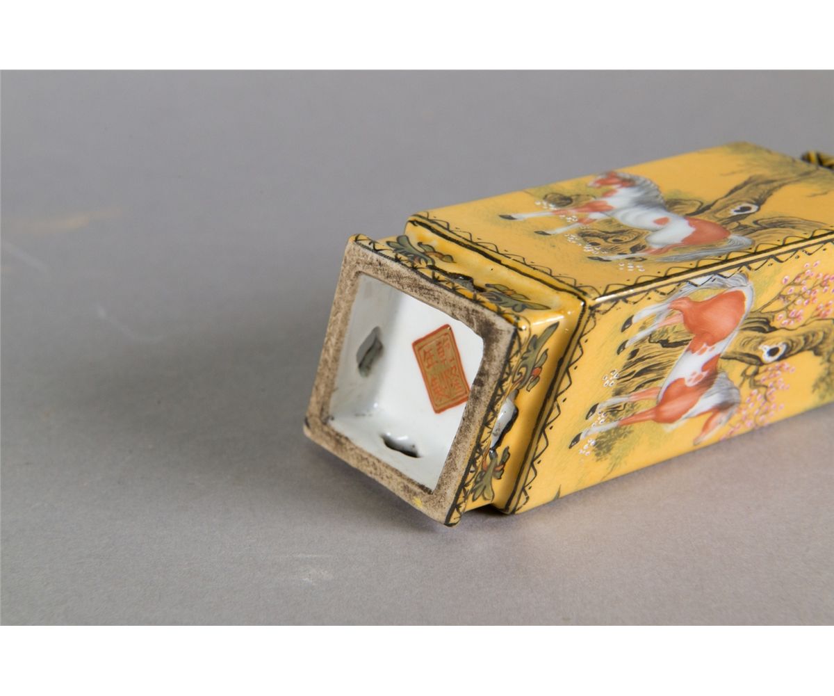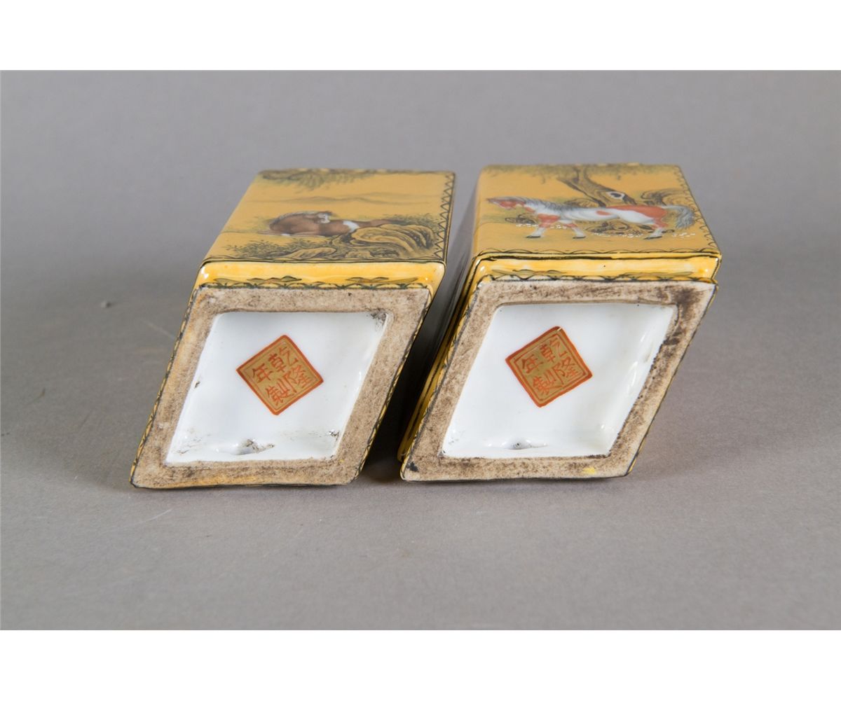 Pair of Chinese square vases; featuring eight horses painting on yellow ground; four-character Qianlong mark on base; H: 11 cm, W: 8 cm, 220 grams each