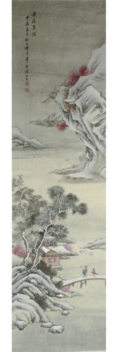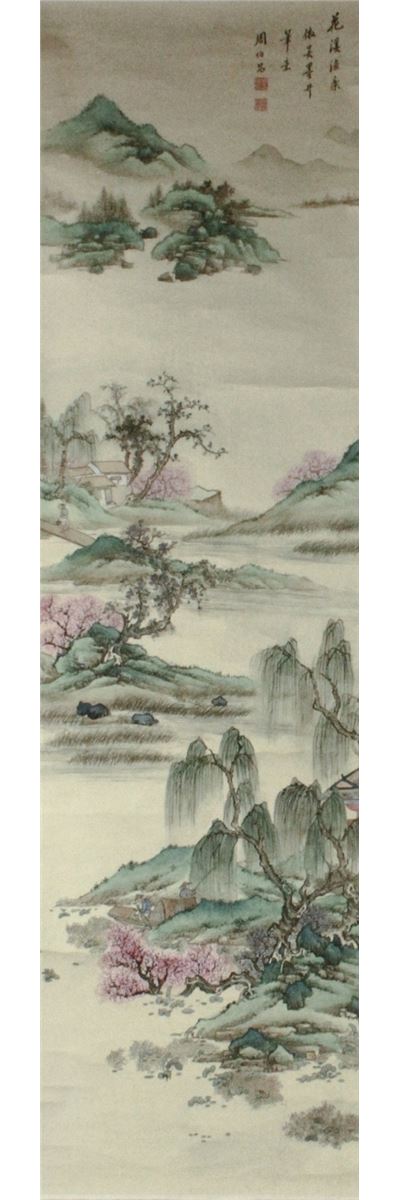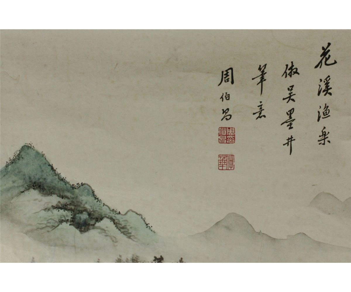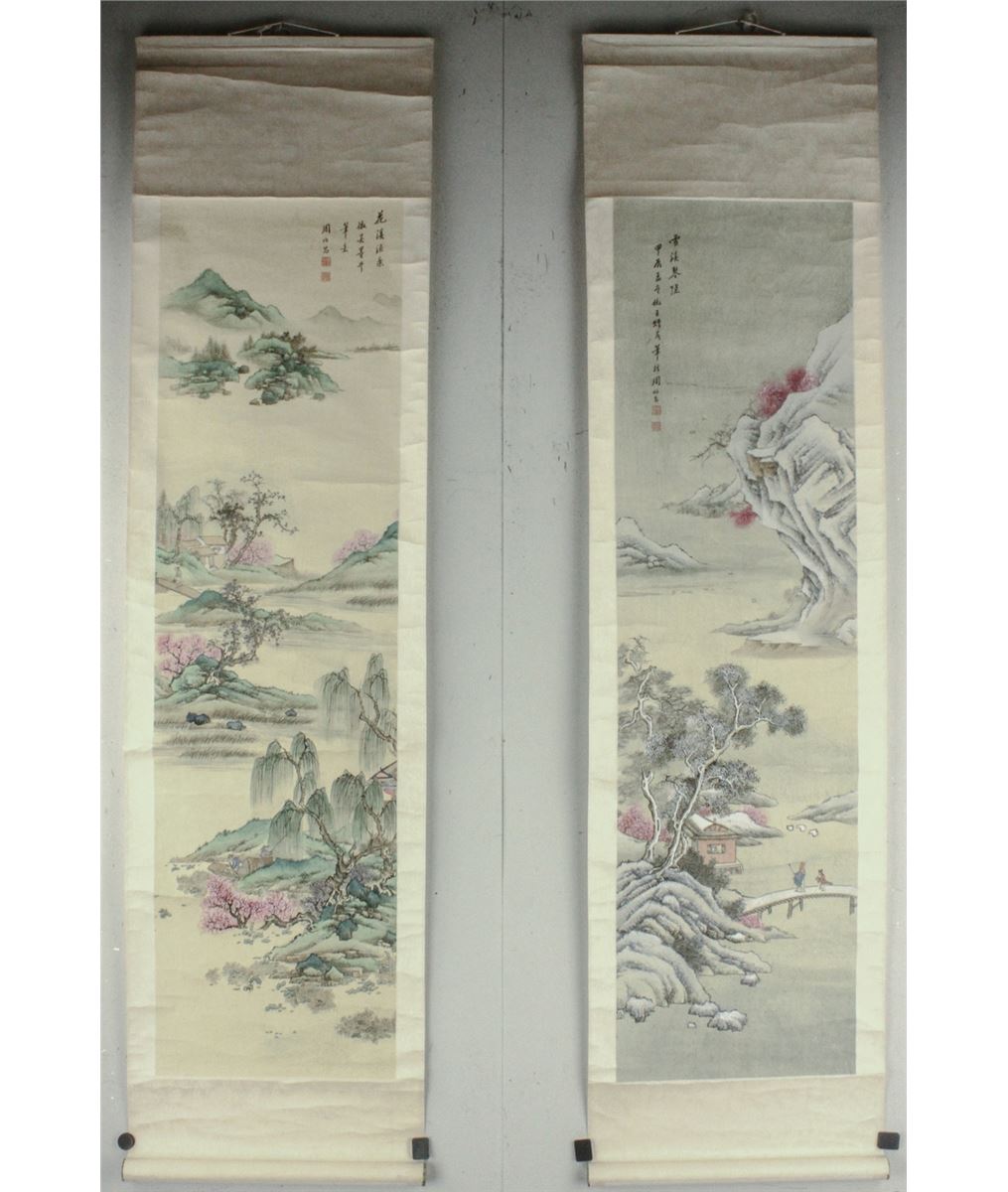 Pair of Landscape paintings; Chinese ink and watercolour on paper; hangning scroll; signed Zhou Bochang and inscribed with two seals on each; 102 cm x 38 cm each. Property of a Toronto collector brought to Canada in 1950's