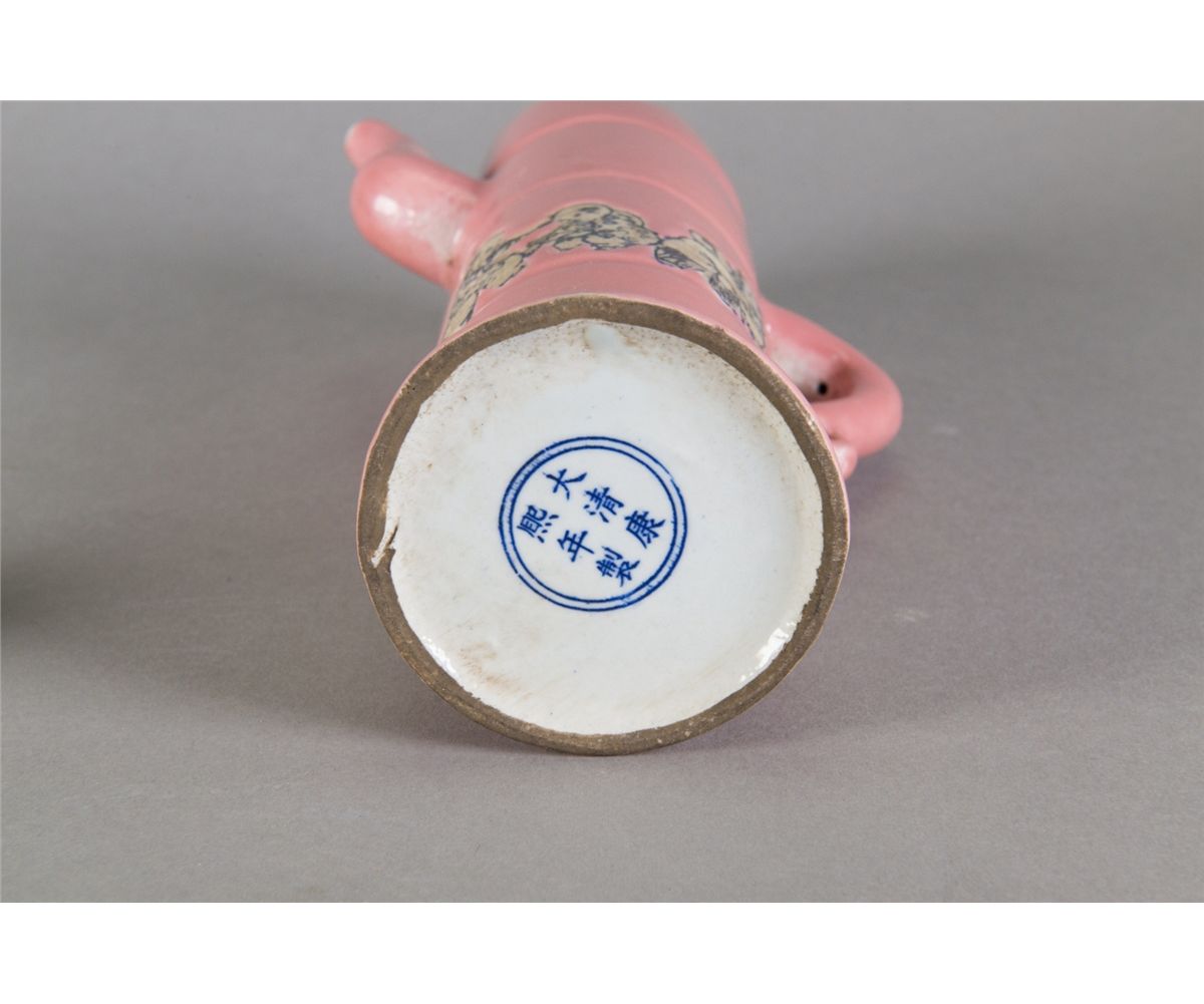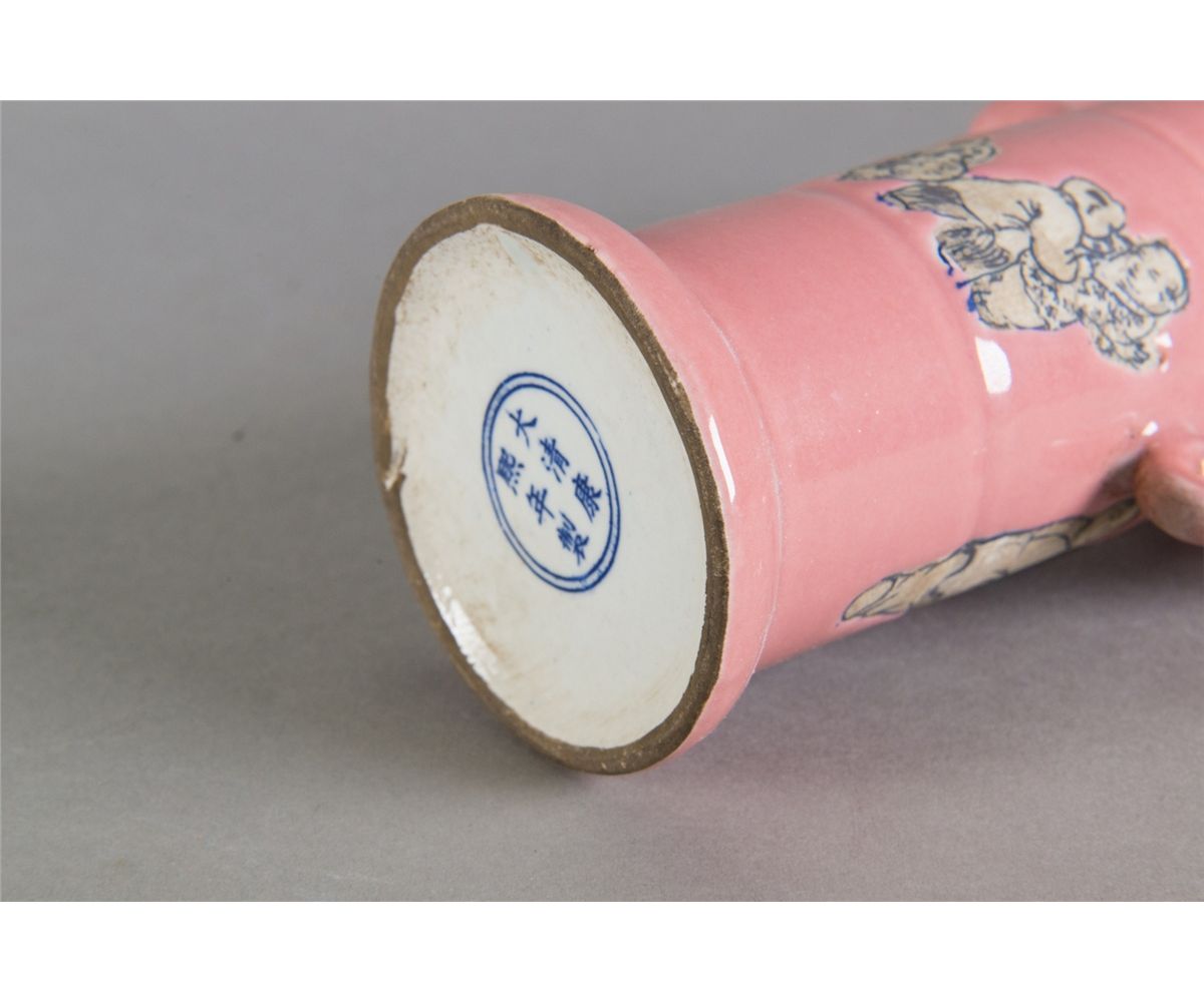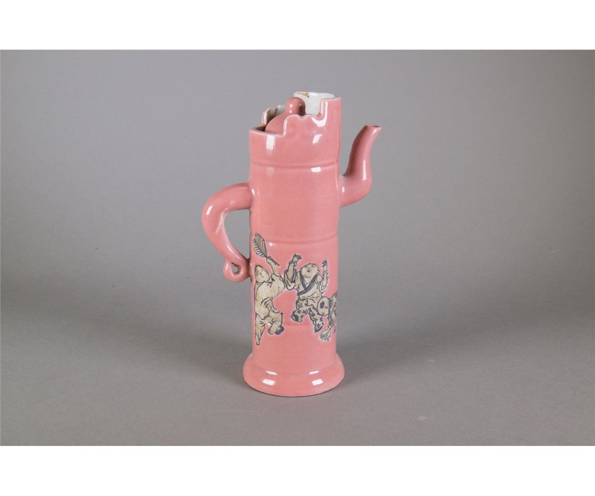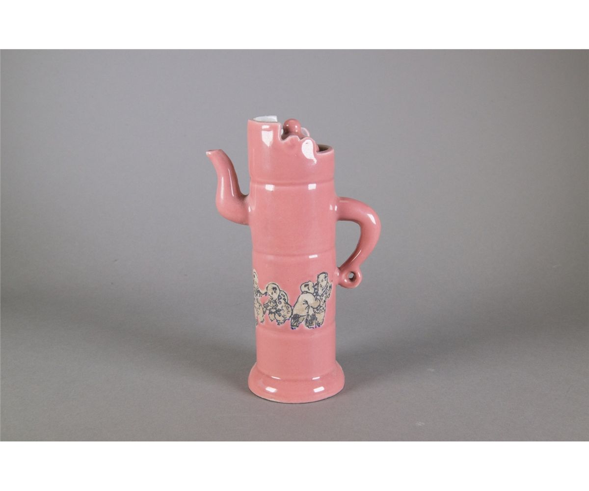 Chinese peach bloom porcelain waterpot; featuring a cylindrical body with a handle and a spout; featuring underglazed painting of children playing scene on body; six-character Kangxi mark on base; H: 22 cm, W: 13 cm, 592 grams