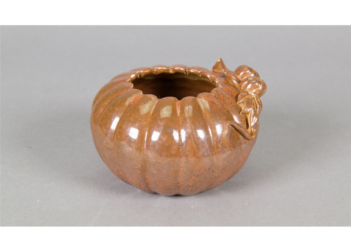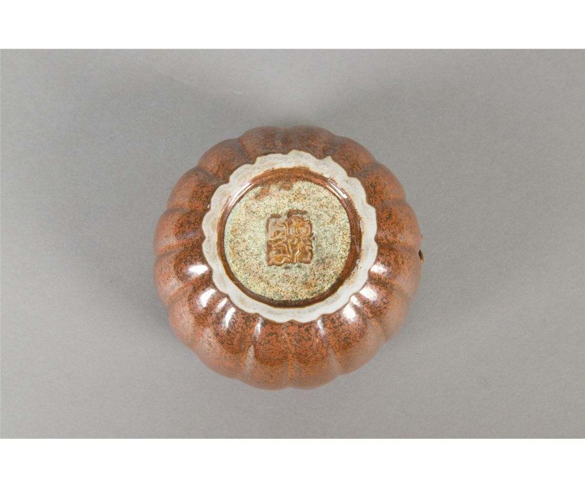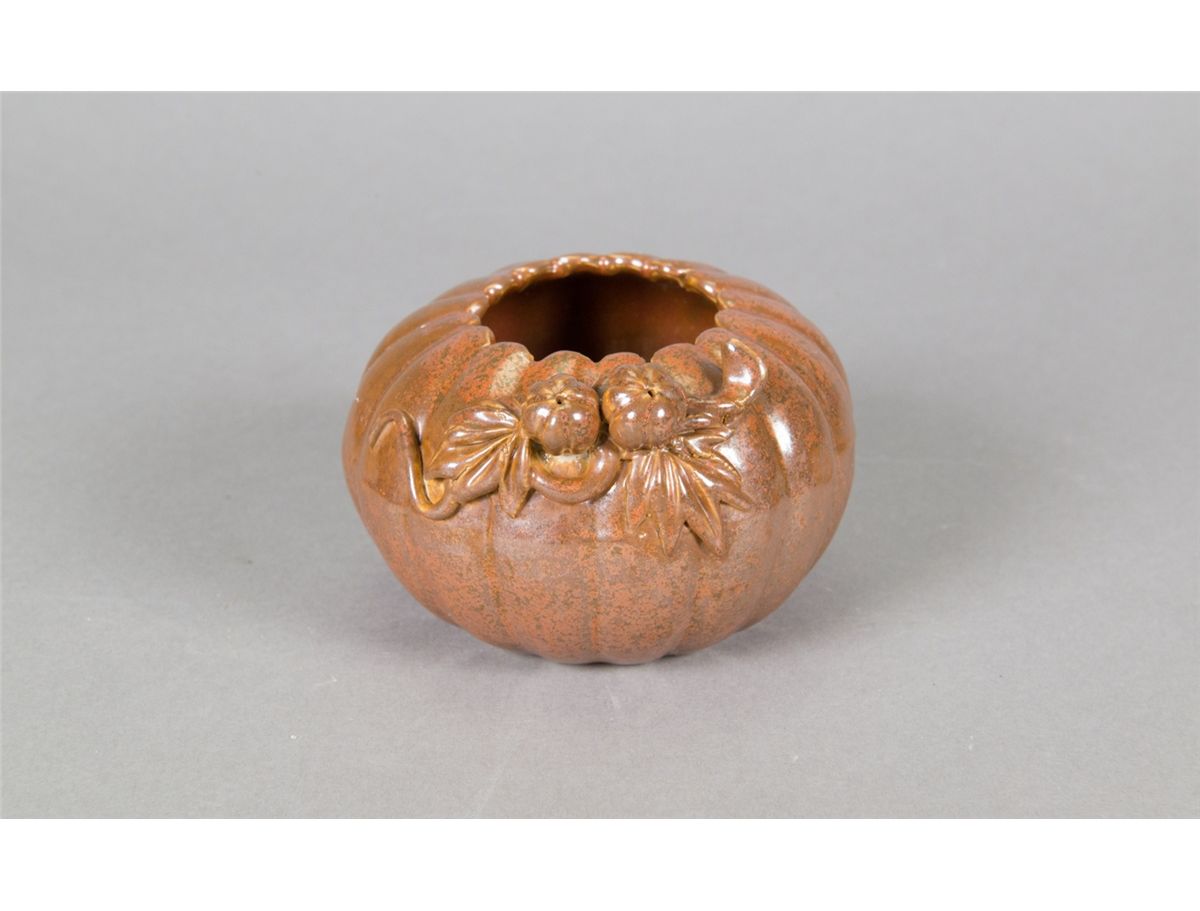 Chinese peach-bloom melon porcelain waterpot; of melon-shape with high-relief fruits; four-character mark on base; H: 5.5 cm, D: 11 cm, 268 grams