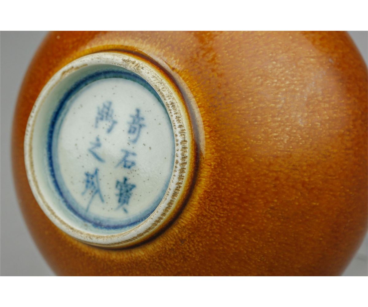 Chinese peach bloom glazed porcelain vase; of globular body with long neck; six-character Qi Shi Bao Ding Zhi Zhen mark on base; 18th century; H: 16.5 cm, W: 10 cm, 304 grams