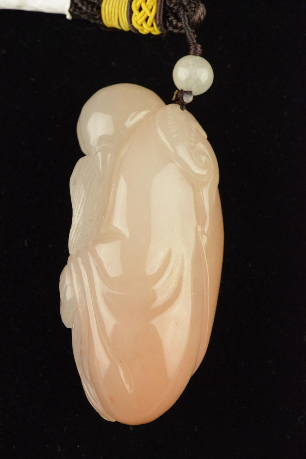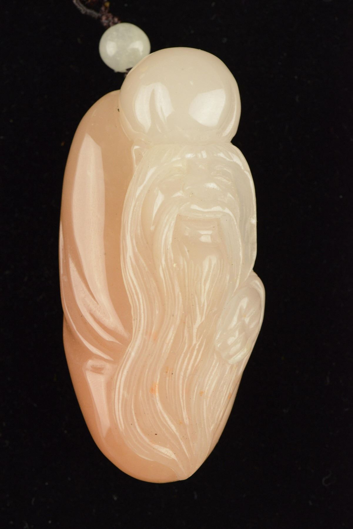 Chinese hardstone toggle, of translucent white and peach tone, carved serene longevity man with long beard. Suspending onto brown string with white stone bead. H: 8 cm, W: 3.3 cm, 141 grams. Provenance: T. Ng Collection Toronto.