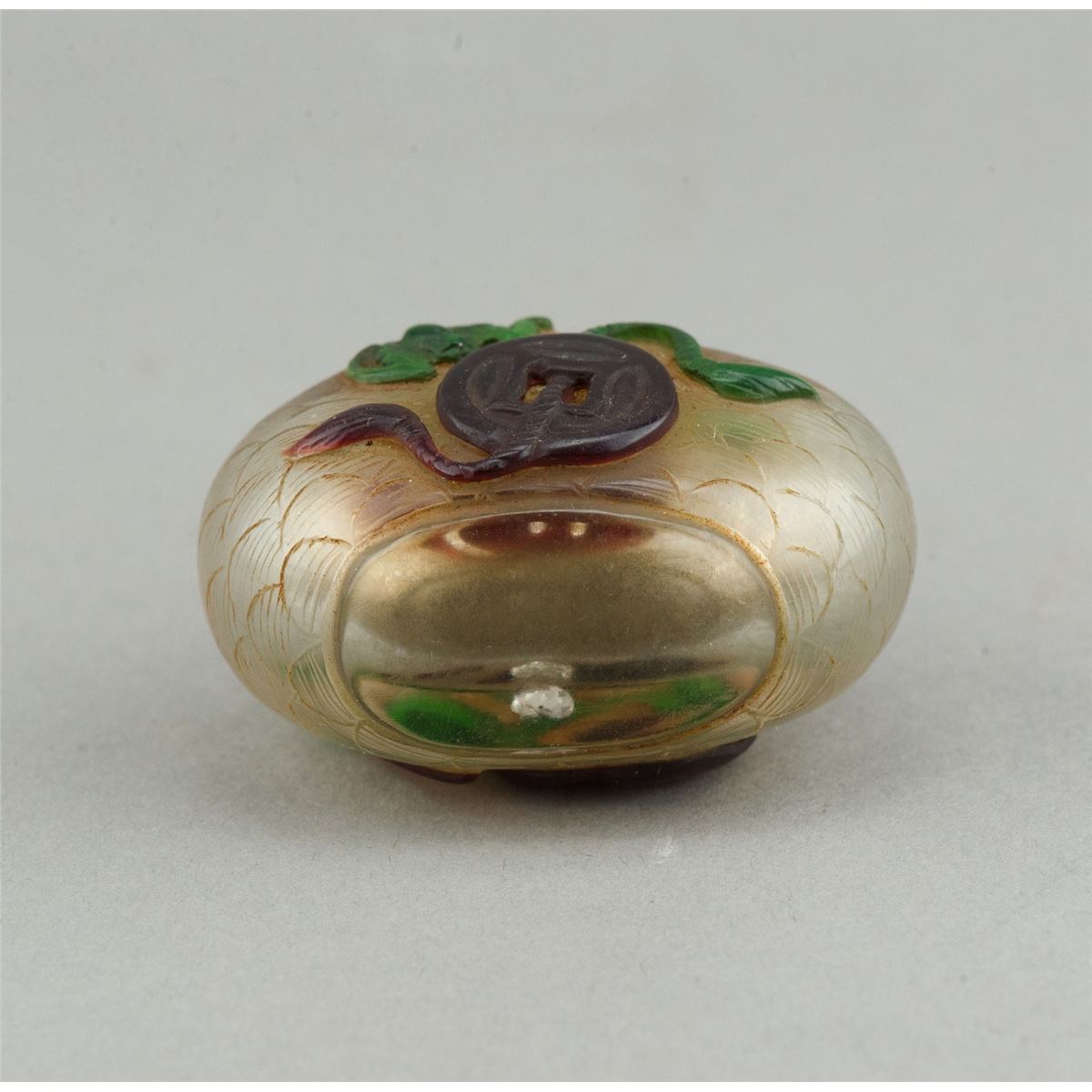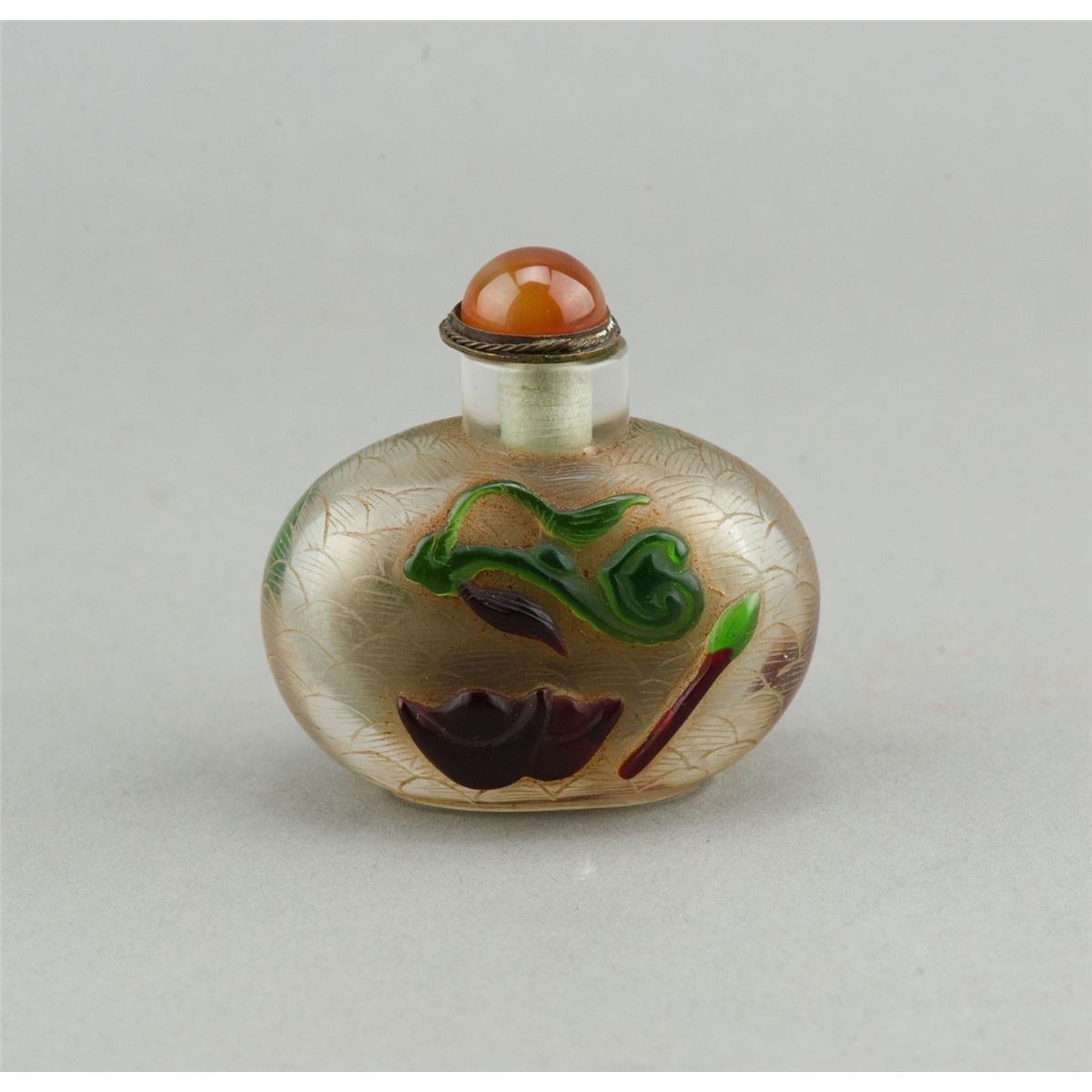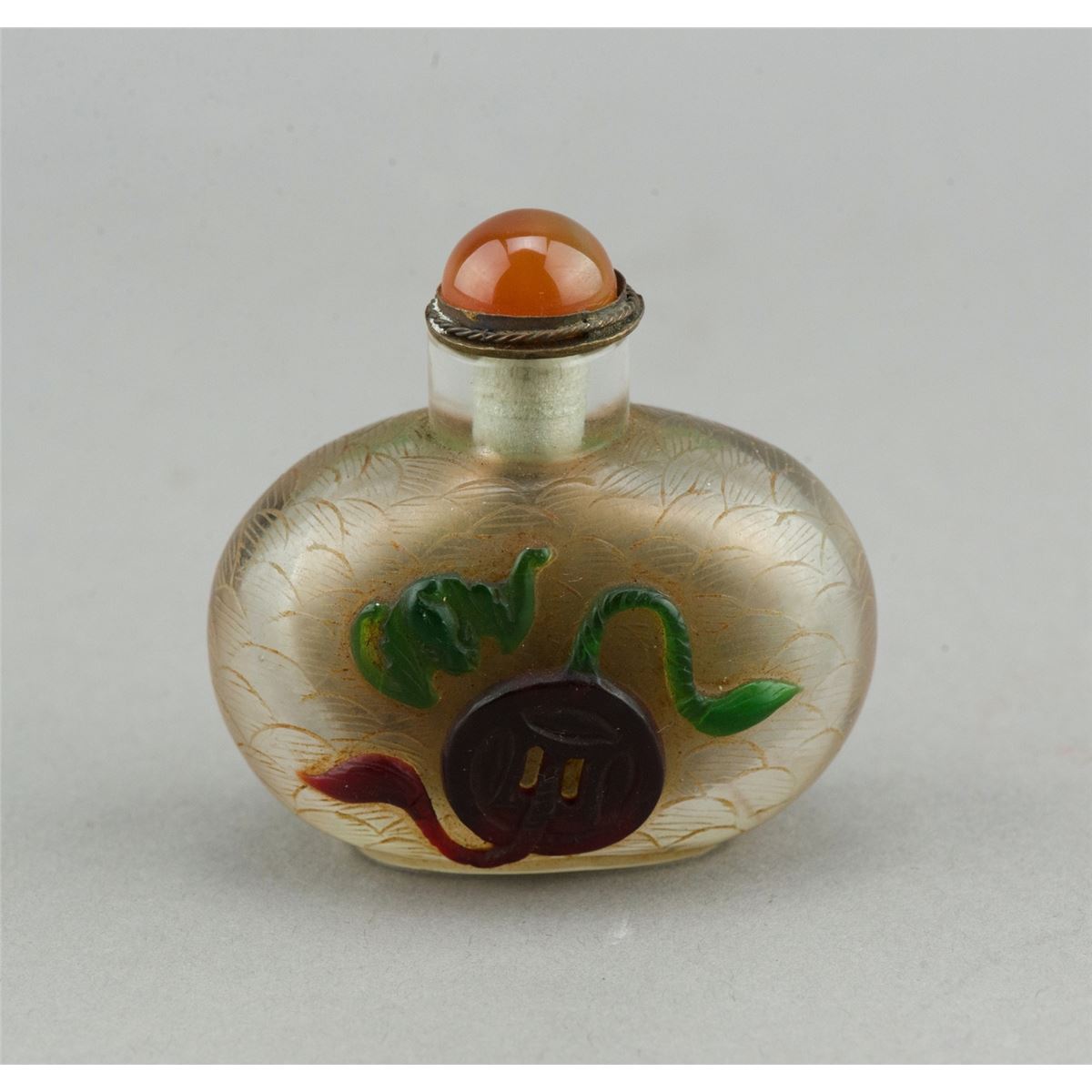 Chinese Peking glass carved snuff bottle, of flattened flask form, decorated with group of auspicious objects. H: 5.5 cm, W: 6 cm, 94 grams.