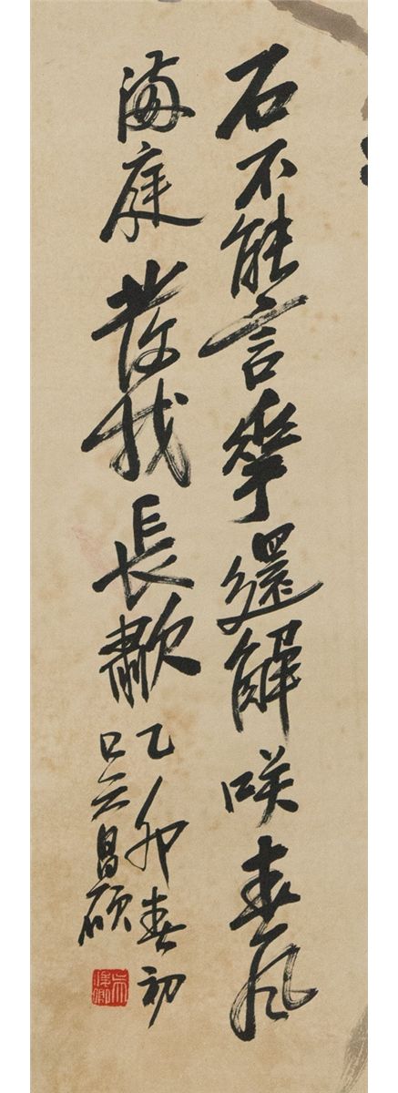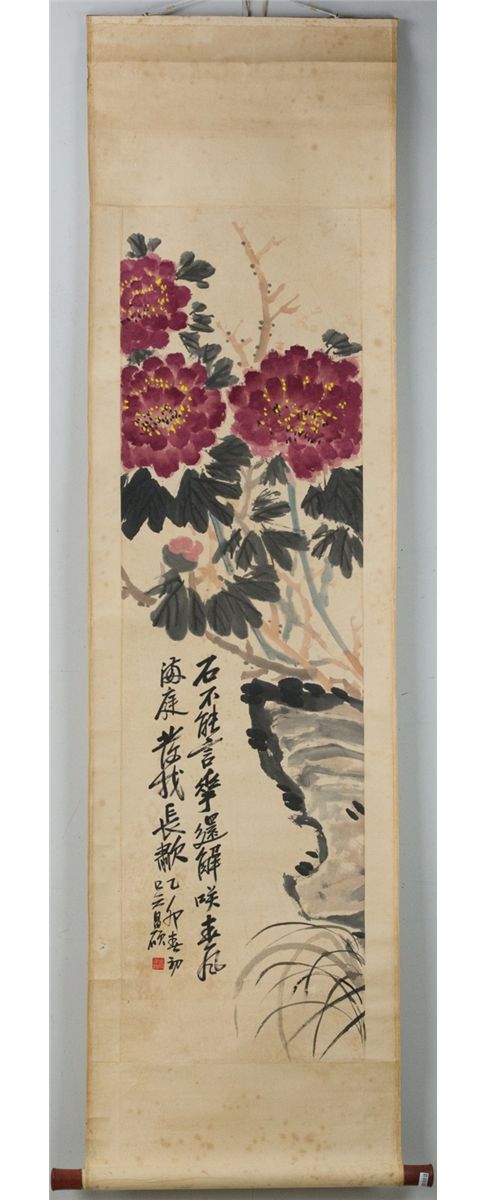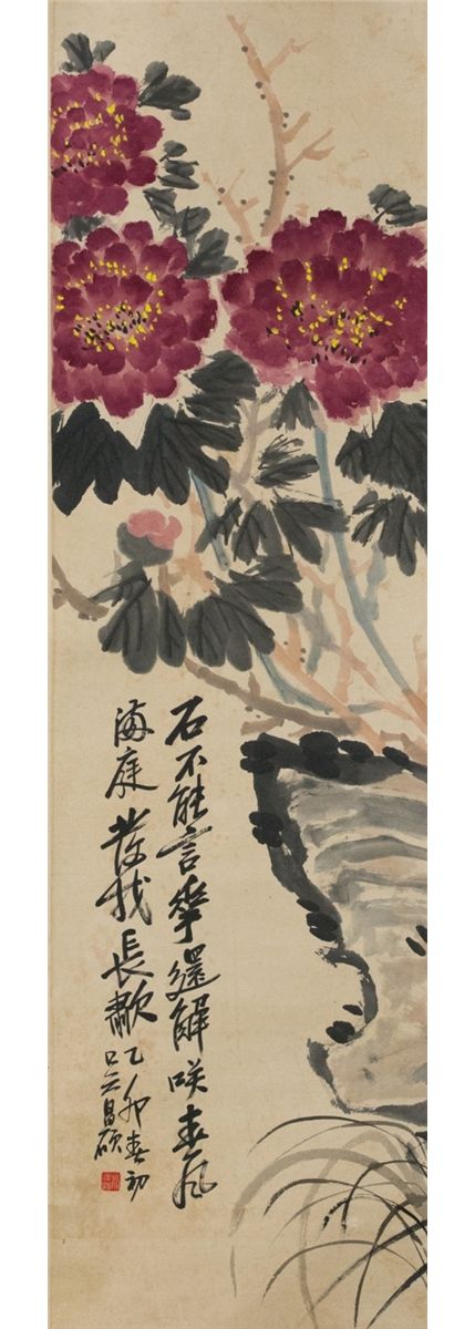 Peonies, hanging scroll, Chinese ink and watercolour on paper, signed and sealed Wu Chang Shao; 133 cm x 37 cm.