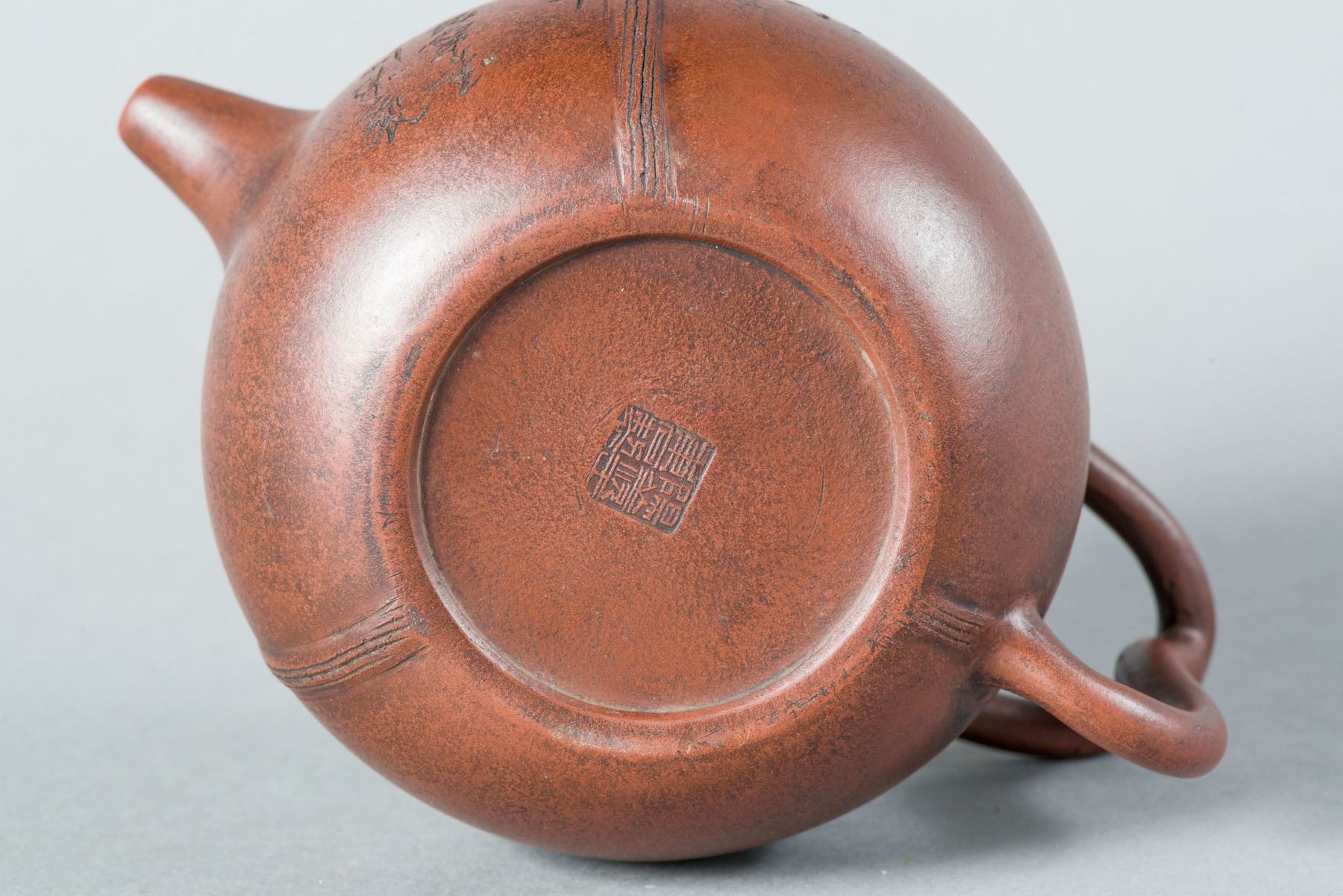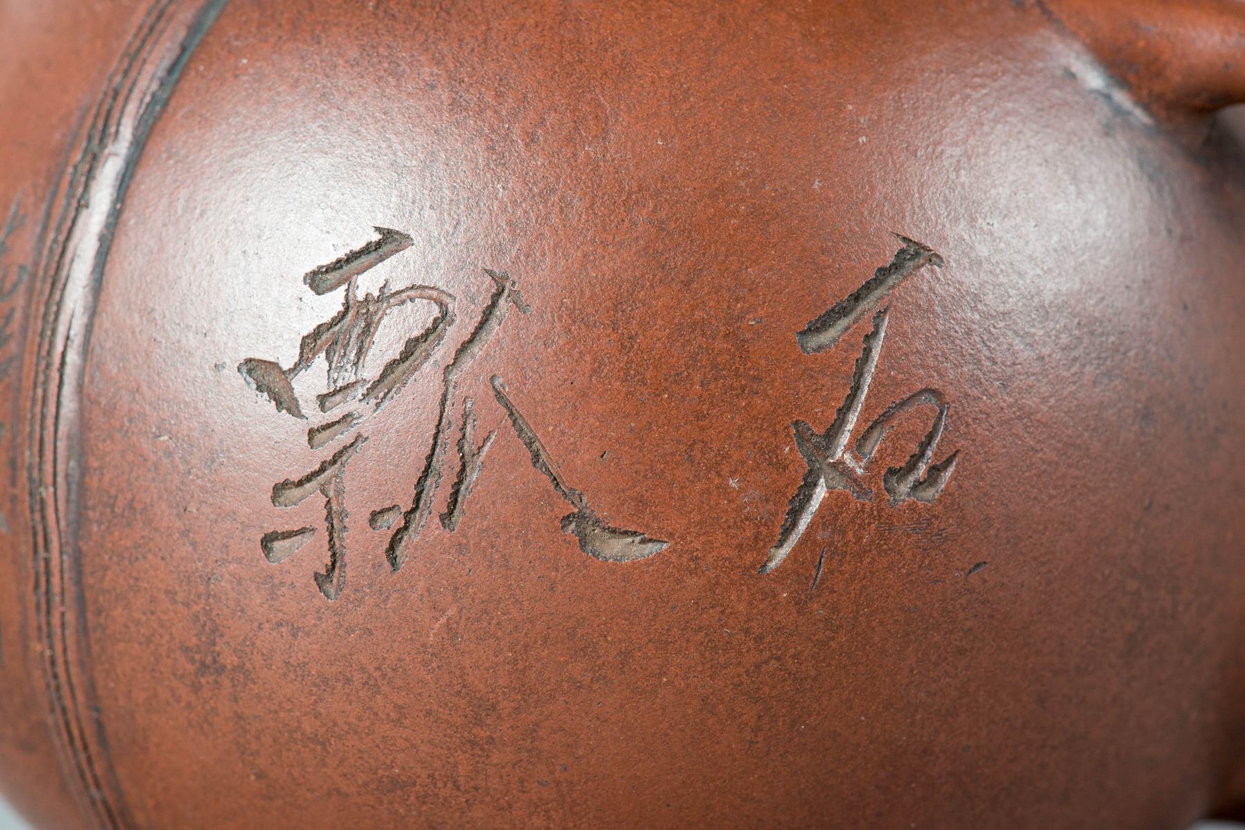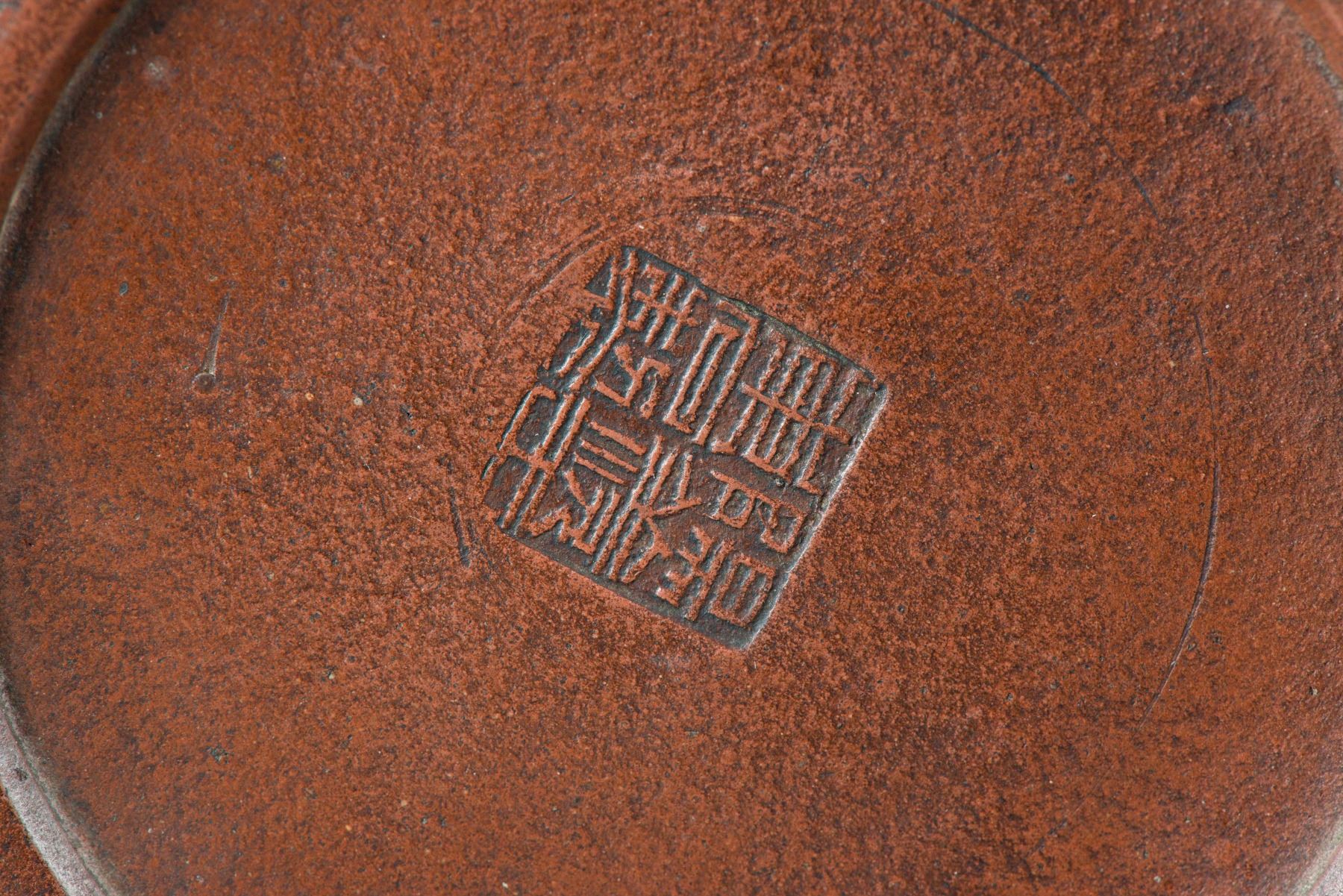 The rounded body flanked with a short spout and curved handle, the body marked Piu Shi, the bottom and under lid stamped with artist seal. H: 10 cm, W: 17 cm, 445 grams.