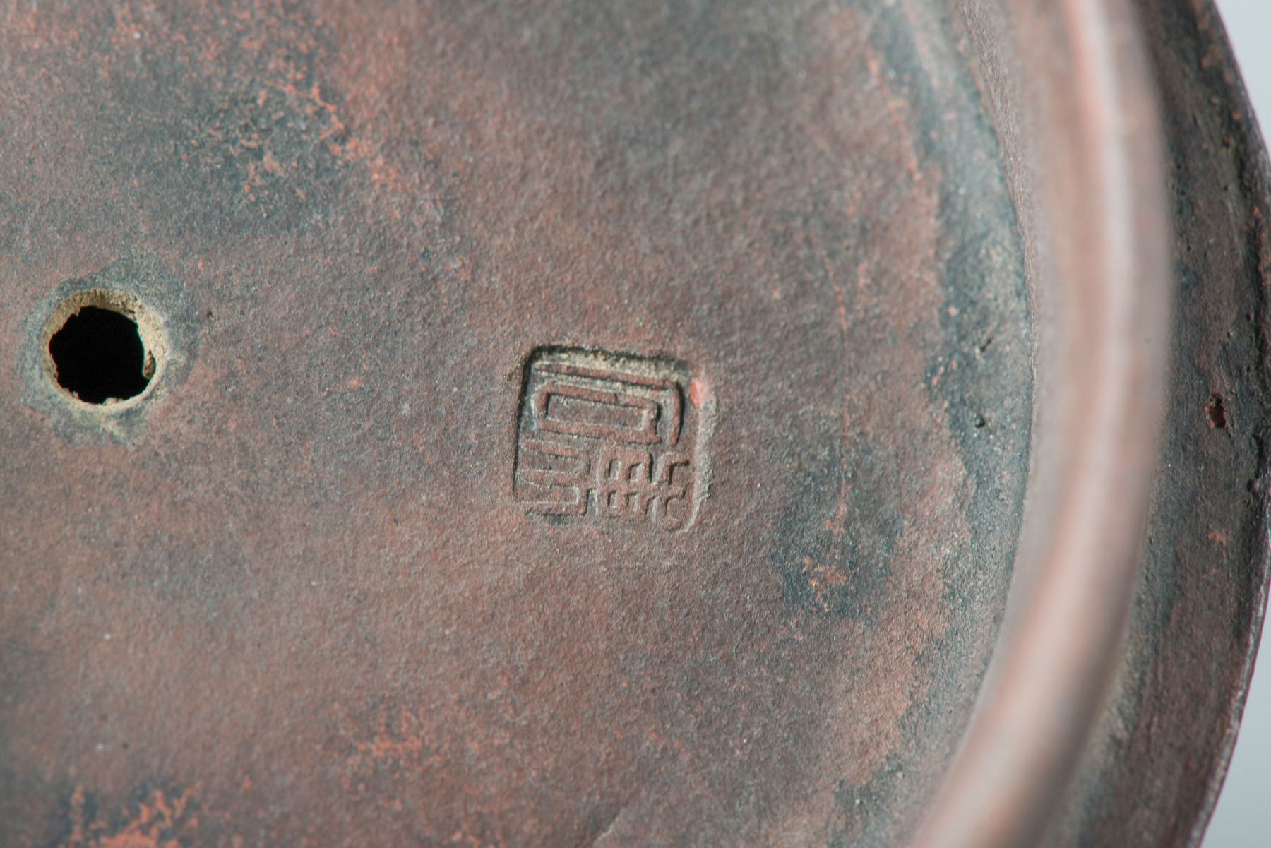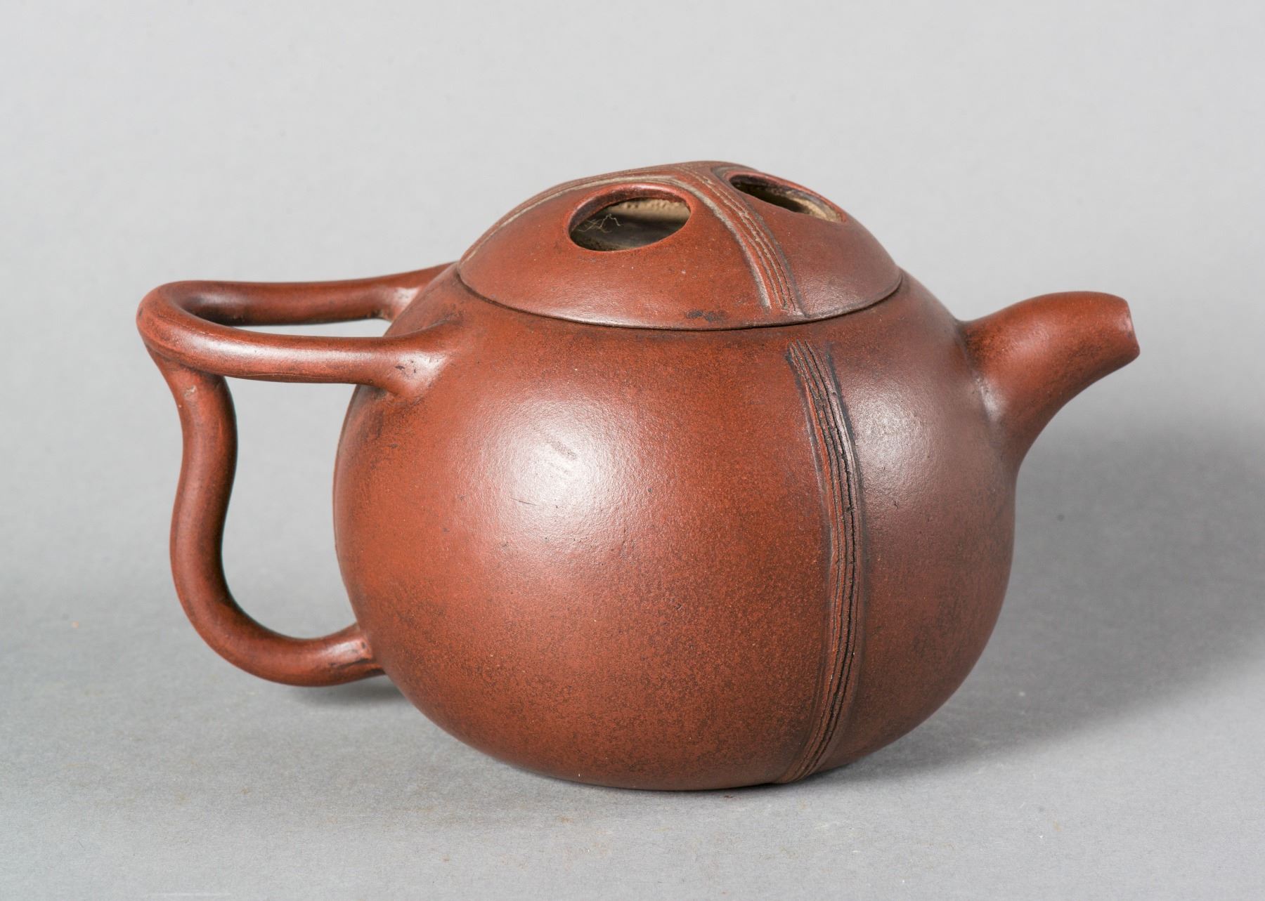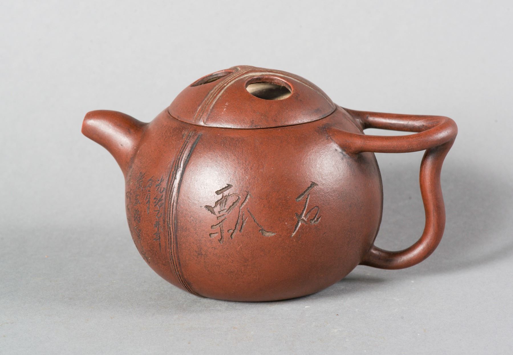 The rounded body flanked with a short spout and curved handle, the body marked Piu Shi, the bottom and under lid stamped with artist seal. H: 10 cm, W: 17 cm, 445 grams.