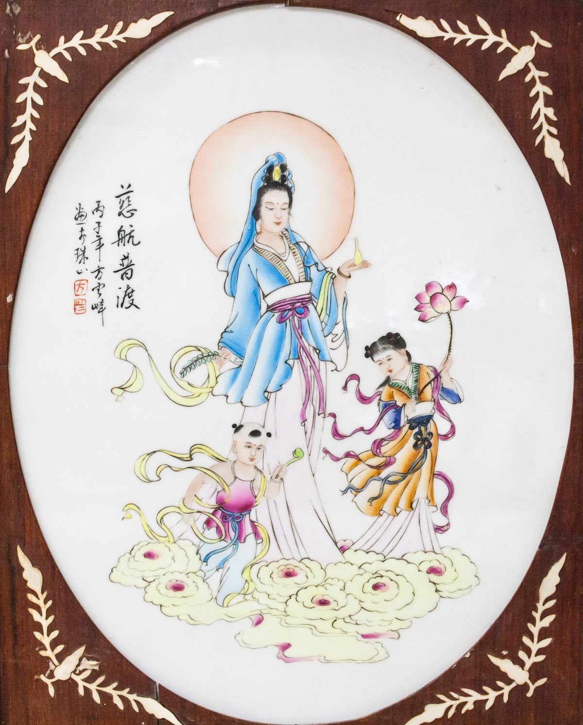 Chinese plaque painting with wooden screen frame. Featuring Guanyin with two children. Inscribed with two seals. 93 x 45 cm (36.5 x 18 inches)