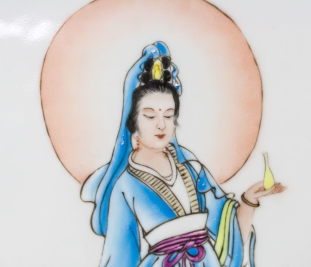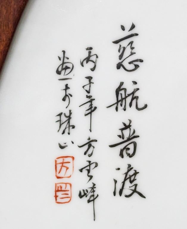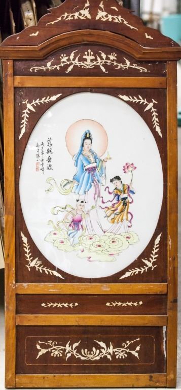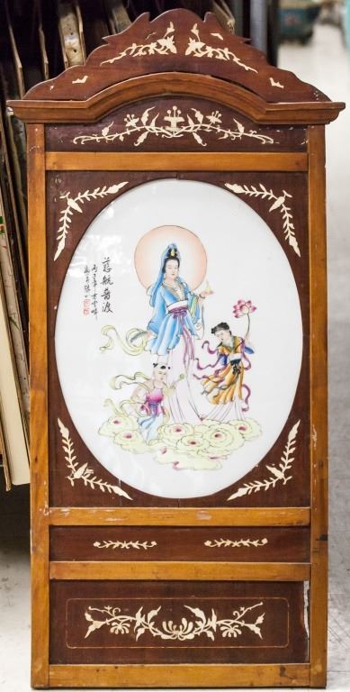 Chinese plaque painting with wooden screen frame. Featuring Guanyin with two children. Inscribed with two seals. 93 x 45 cm (36.5 x 18 inches)
