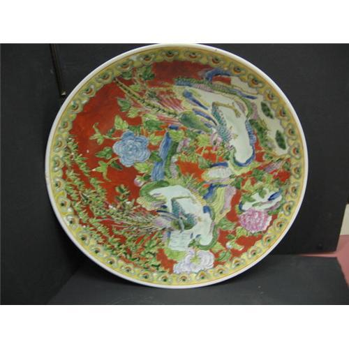 <table width="100%" border="0" cellspacing="0" cellpadding="4"><tr><td><em> Lovely Chinese decorative plate. Roosters are shown on a red background.</em></td></tr><tr> <td width="100%"> Lovely Chinese decorative plate. Roosters are shown on a red background. 17 3/4'Â? diameter and about 2Â? deep. Some worn areas in the paint but no cracks. Chinese stamps on the bottom. Great details and colors. Wonderful for decorating any room.