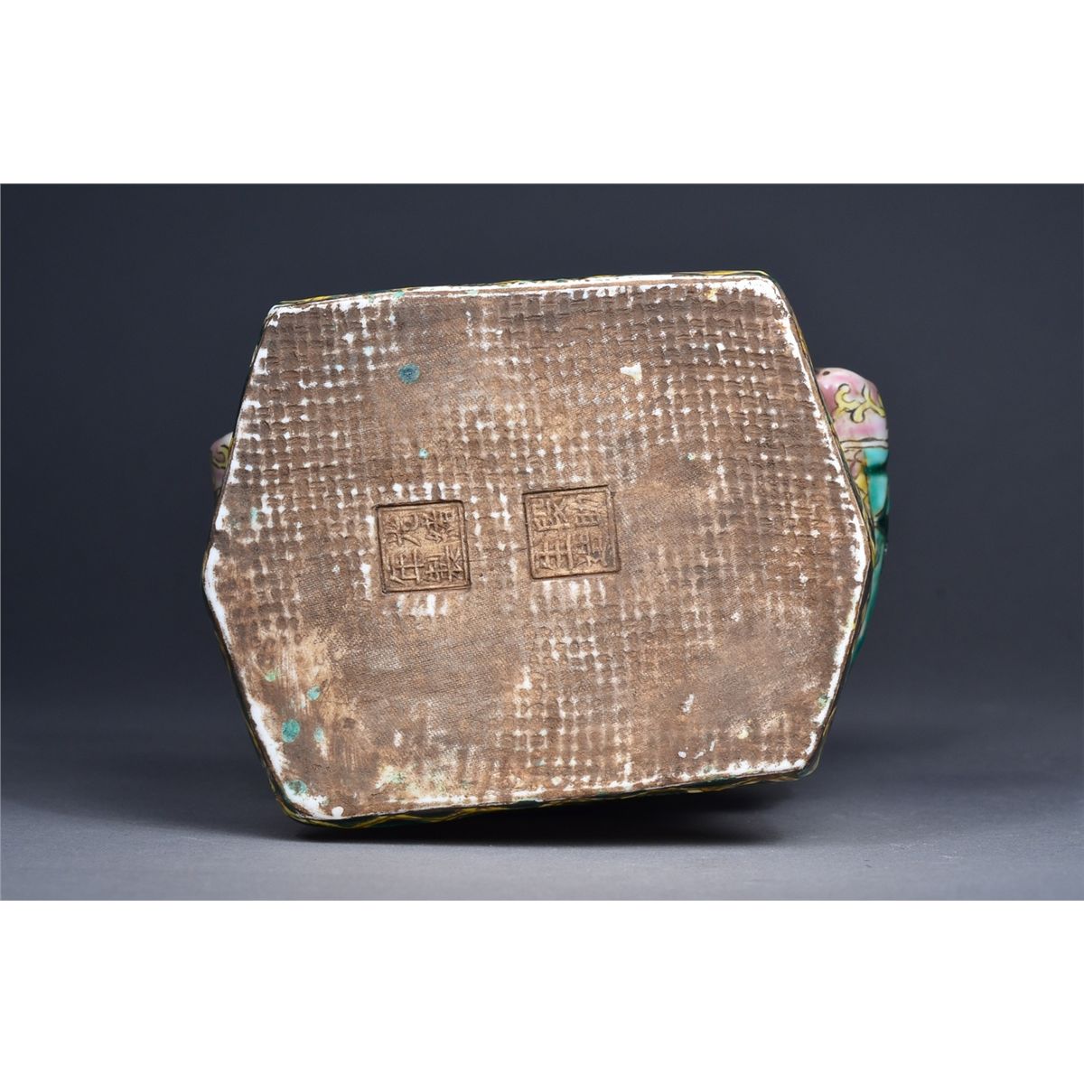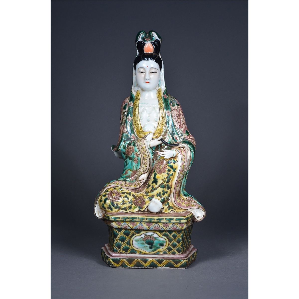 Chinese polychrome enameled Blanc de Chine porcelain figure; featuring Guanyin (two left hand fingers broken); two four-character Guangxu mark stamped on base; H: 29 cm, L: 12 cm, W: 14 cm