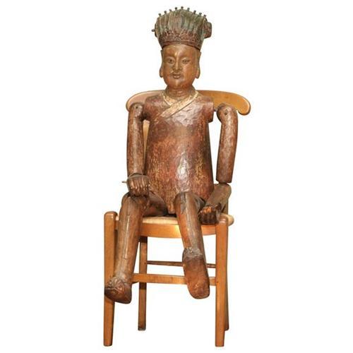 Very unusual large-scale Chinese polychromed wood figure of an ancestor, well carved with lifelike features and serene expression, with articulated joints, retaining its original removable headdress.