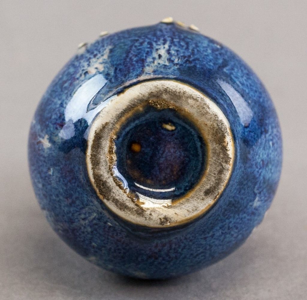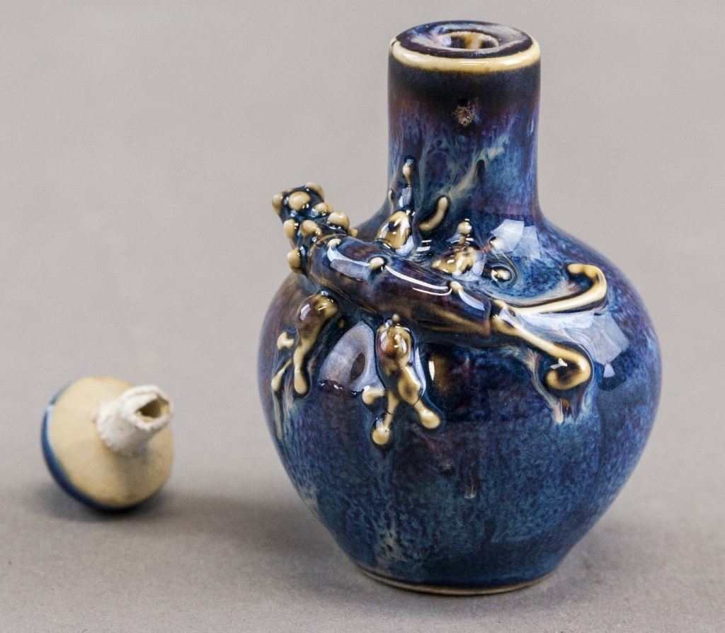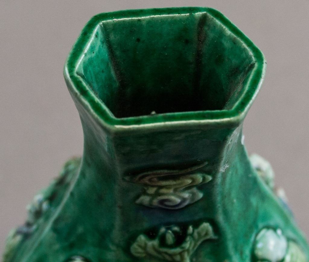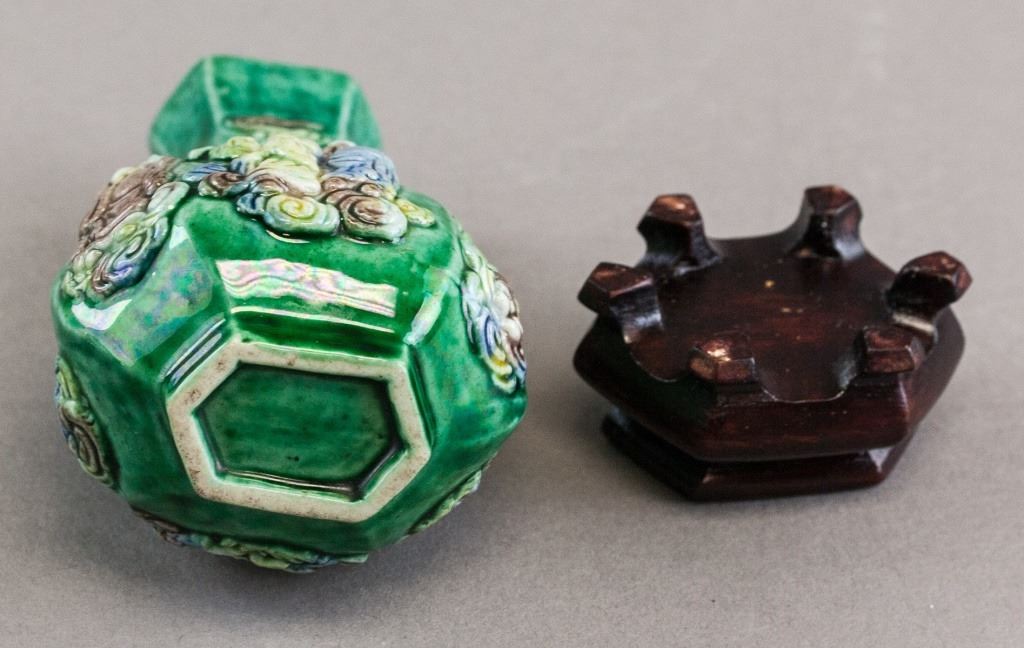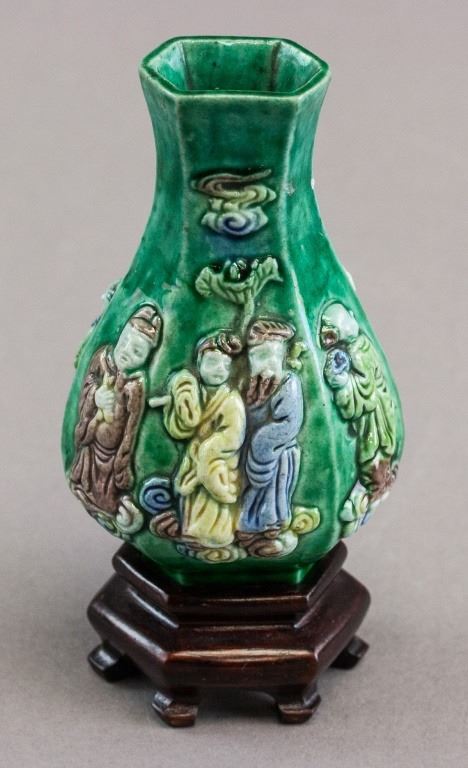 Chinese porcelain miniature vase with eight immortals carved in relief on turquoise hexagonal body. Accompanied with wood base. 10 x 6 cm. 100 grams