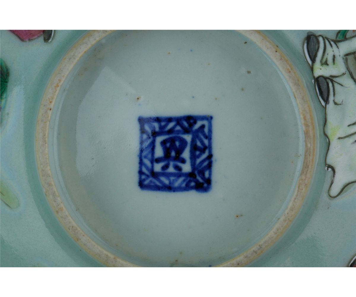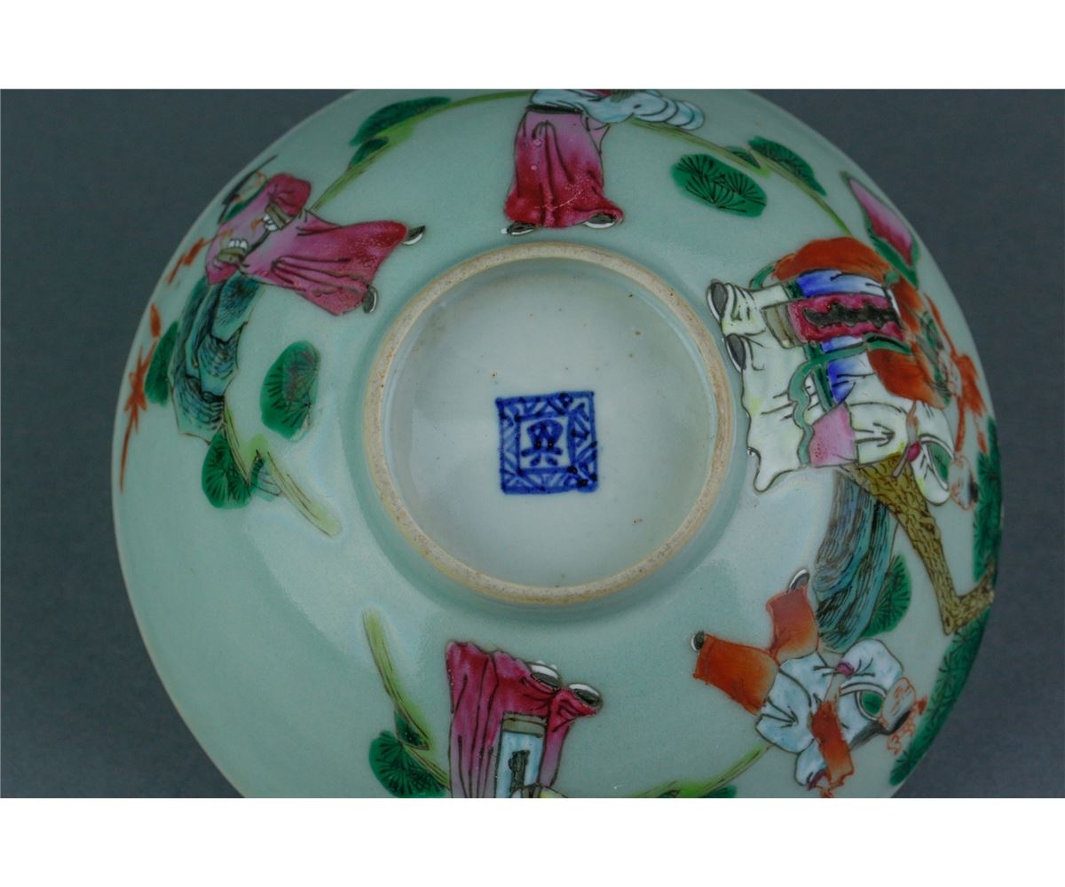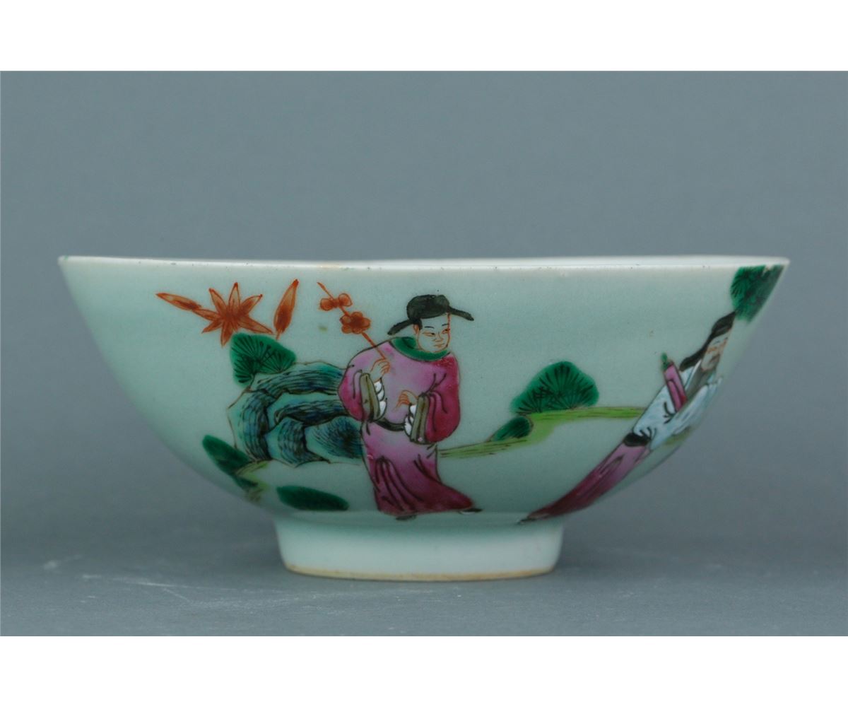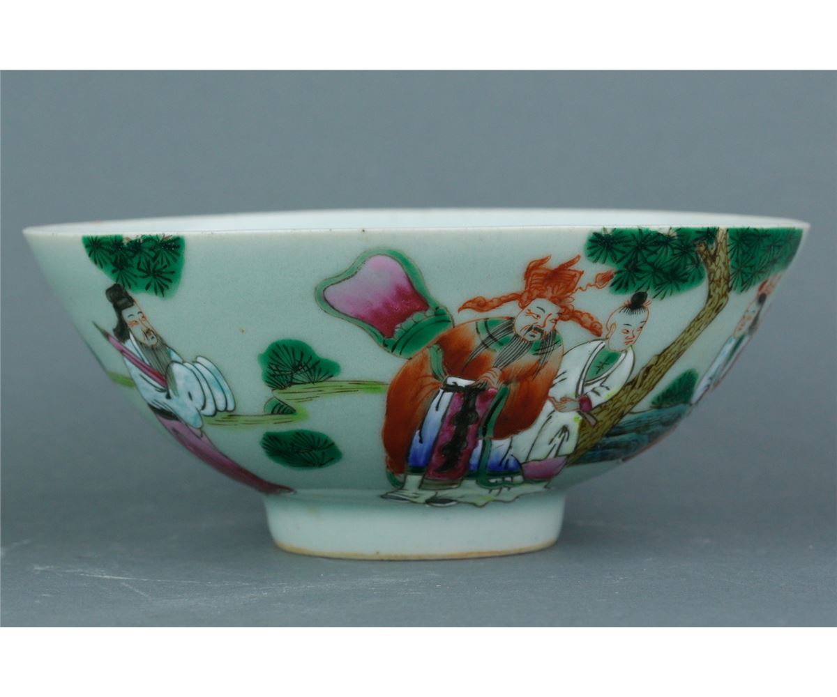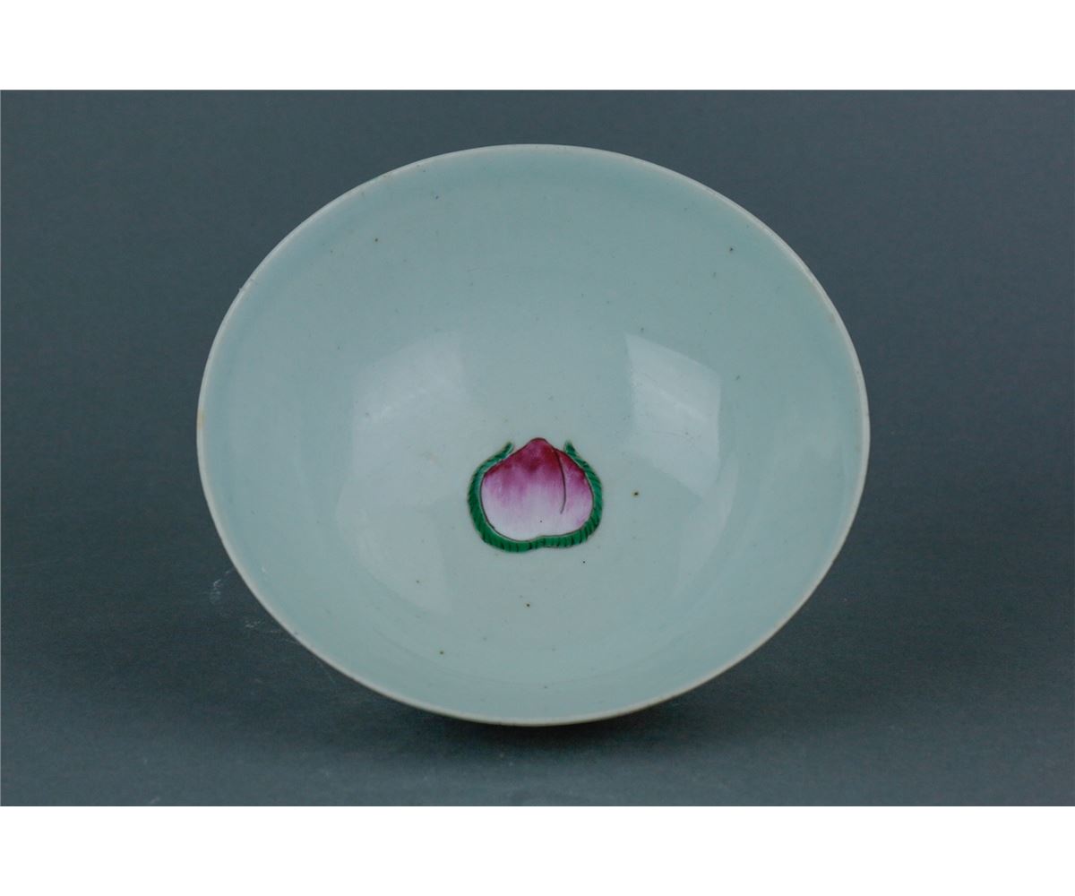 Chinese Famille Rose porcelain bowl; featuring immortals on body and a peach inside the bowl; one-character mark on base; 19th century; H: 7 cm, D: 16.5 cm, 289 grams