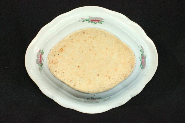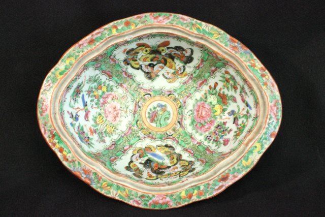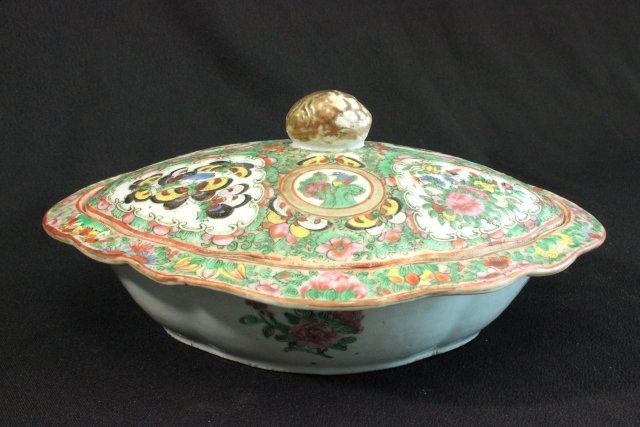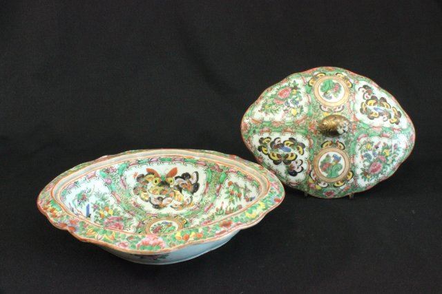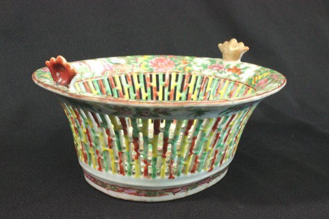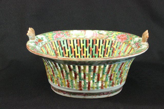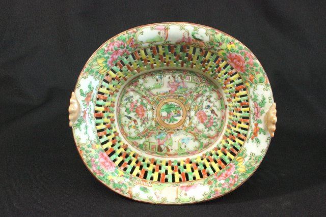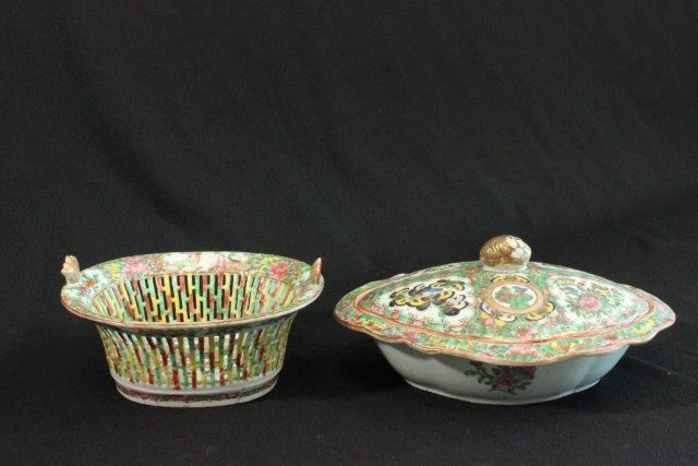 1 porcelain covered vegetable dish & 1 reticulated basket. Marked "Famille Rose". Dish approx. 5 1/2" H x 11" W. Basket approx. 4 1/2" H x 8 1/4" L x 7 3/4" W.