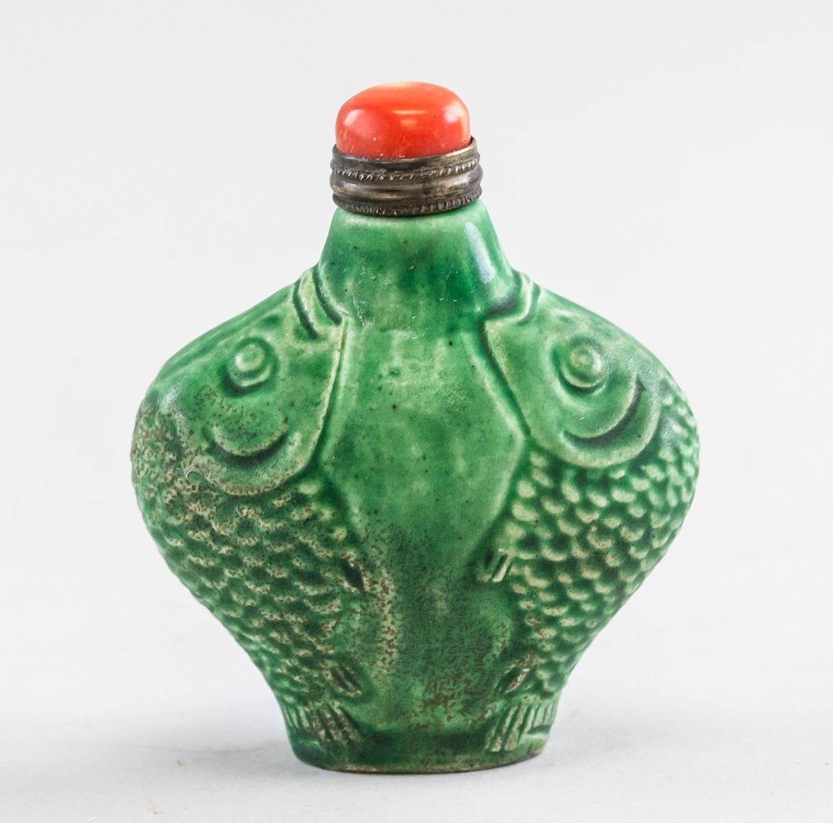 Chinese porcelain snuff bottle. Of green tone with red cap. Carved with double fish. 7 x 6 cm, 65 grams.
