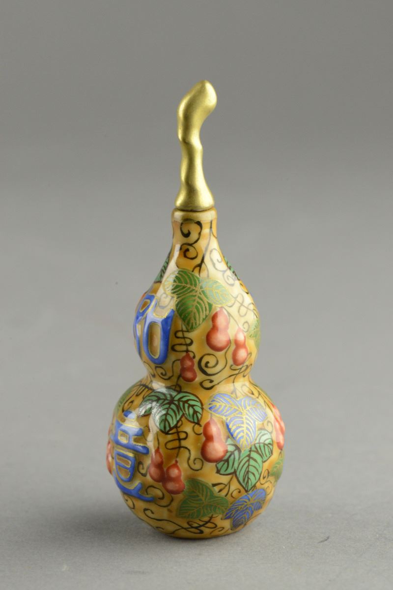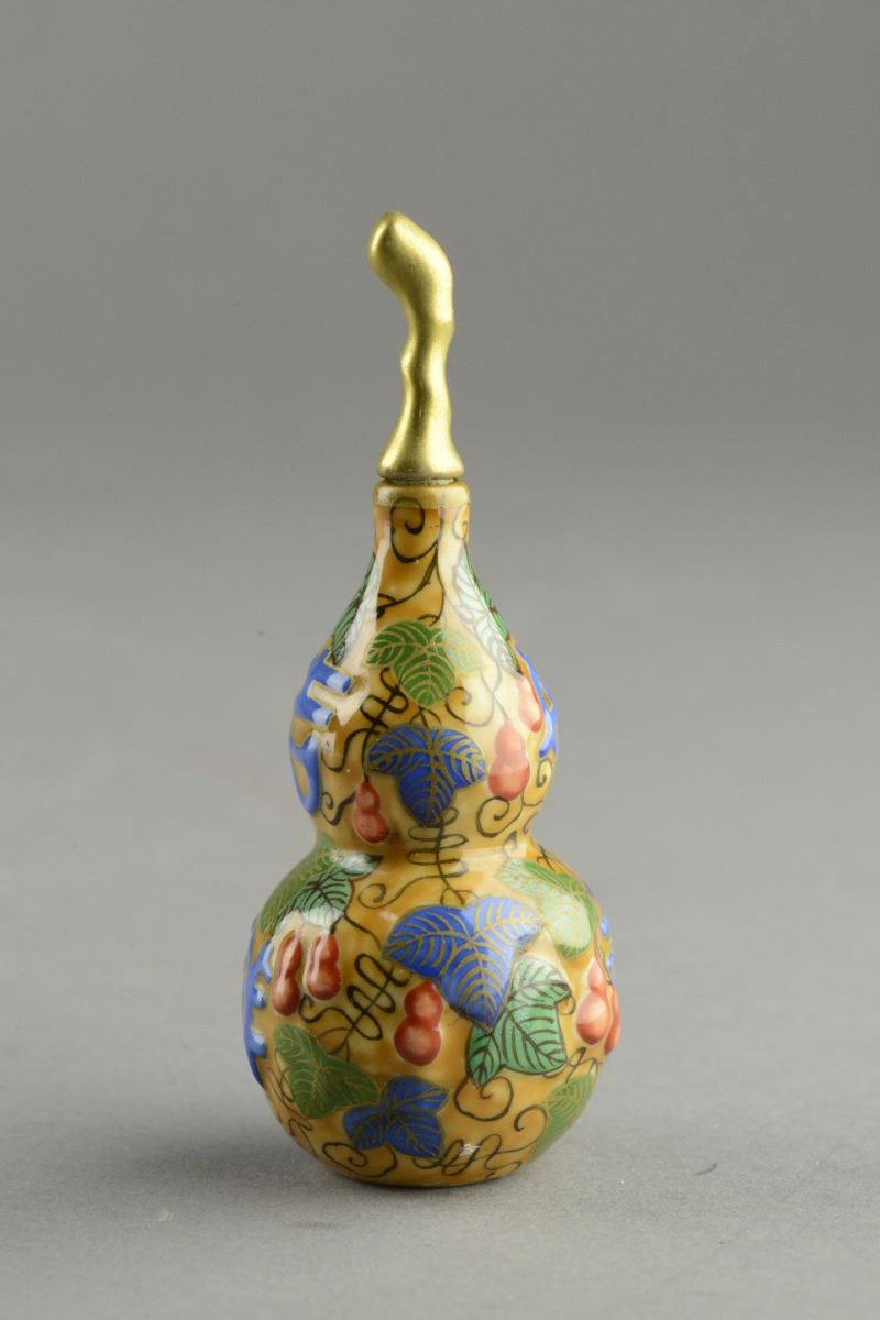 Of double gourd form, the porcelain snuff bottle is painted with double gourds and Ru Yi Ji Xiang Chinese characters; Base marked Qianlong; H: 9 cm, D: 3.5 cm, 42 grams; Provenance: T. Ng Collection, Toronto