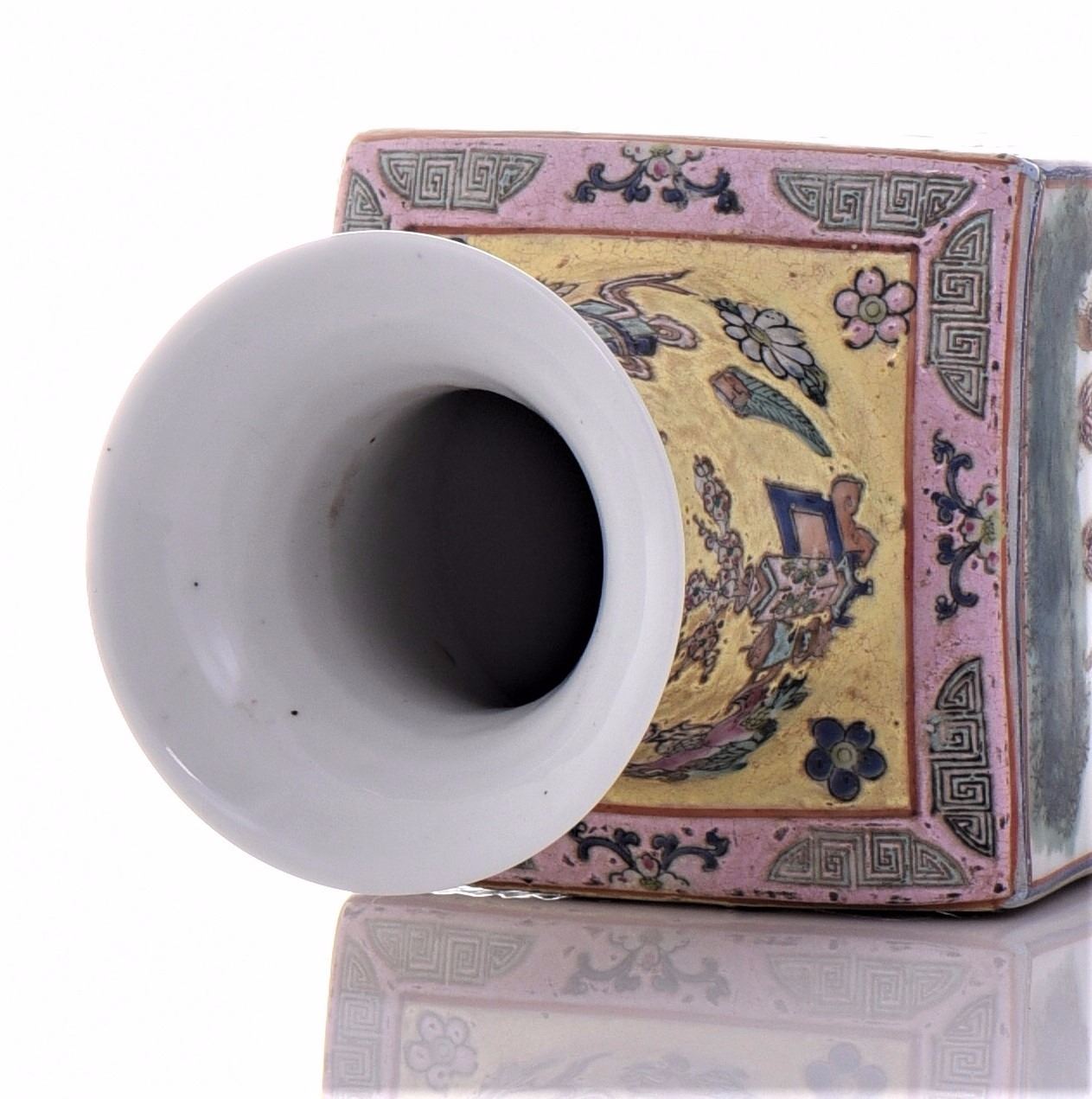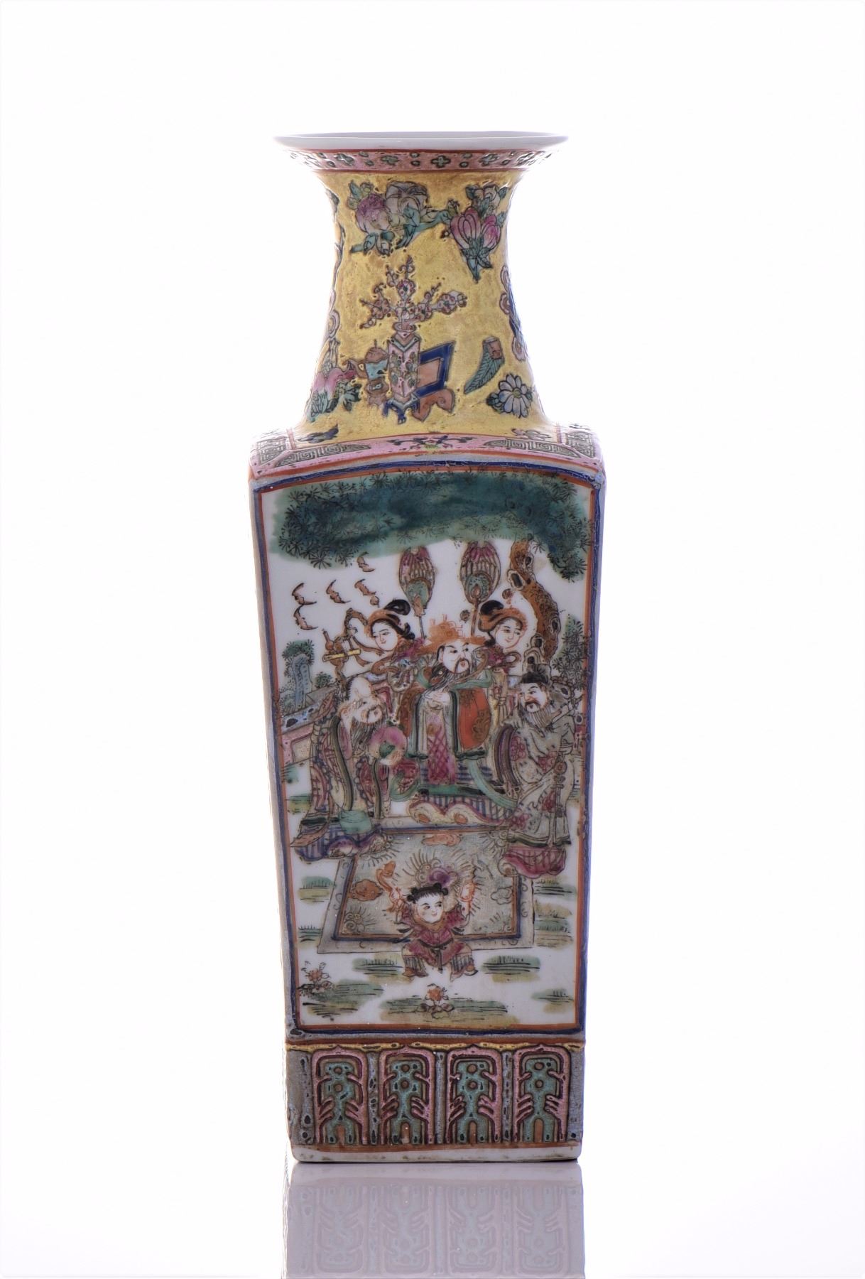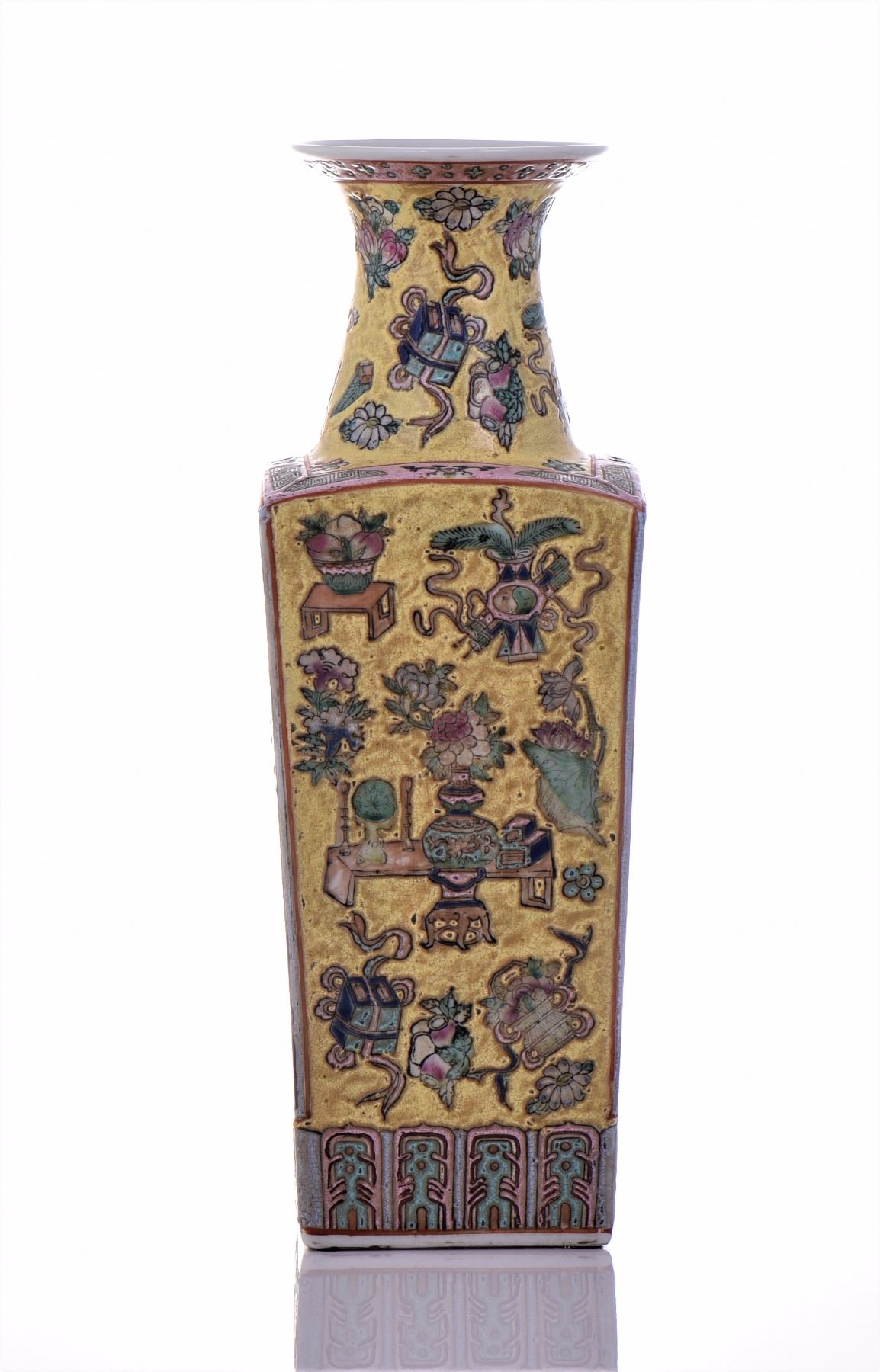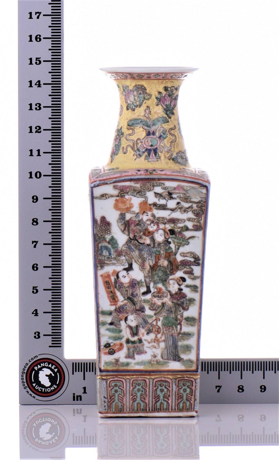Chinese Porcelain Enameled Vase With Yellow And White Background Family Scenes. Signed with Chinese Archaic Script Chop Marks On The Bottom. Possibly Daoguang Nian Zhi 1821-1850 or older than Quing Dynasty. This may be an 18th or 19th Century Vase or older. Provenance: Consignor purchased this vase in 1948 And Has Had it In a Collection since it was brought to the U.S. We have no further provenance to determine the exact age and origin of this beautiful vase. Note: We will update this lot description if we receive further information. We encourage bidders to obtain expert opinions as well. Estimated more than 50 yrs. old. Chinese art is visual art that, whether ancient or modern. Early "stone age art" dates back to 10,000 BC, mostly consisting of simple pottery and sculptures. Chinese art has arguably the oldest continuous tradition in the world. Traditional Chinese painting involves essentially the same techniques as Chinese calligraphy and is done with a brush dipped in black or colored ink. As with calligraphy, the most popular materials on which paintings are made of paper and silk. Chinese ritual sculptures from the Shang and Western Zhou Dynasties come from a period of over a thousand years from c. 1500 and were cast with complex patterns and zoomorphic decoration, but avoid the human figure. Smaller figures in pottery or wood were placed in tombs for many centuries afterwards, reaching a peak of quality in the Tang Dynasty. Small Buddhist figures and groups were produced to a very high quality in a range of media, as was relief decoration of all sorts of objects, especially in metalwork and jade. Sculptors of all sorts were regarded as artisans and very few names are recorded. Chinese ceramic ware shows a continuous development since the pre-dynastic periods, and is one of the most significant forms of Chinese art. Most later Chinese ceramics, even of the finest quality, were made on an industrial scale, thus very few individual potters or painters are known. Many of the most renowned workshops were owned by or reserved for the Emperor, and large quantities of ceramics were exported as diplomatic gifts or for trade from an early date. (Wikipedia) Size and/or Weight: See Measurement Photo. (Photos Represent The Lot Condition, Pangaea Auctions)