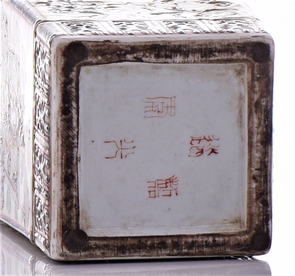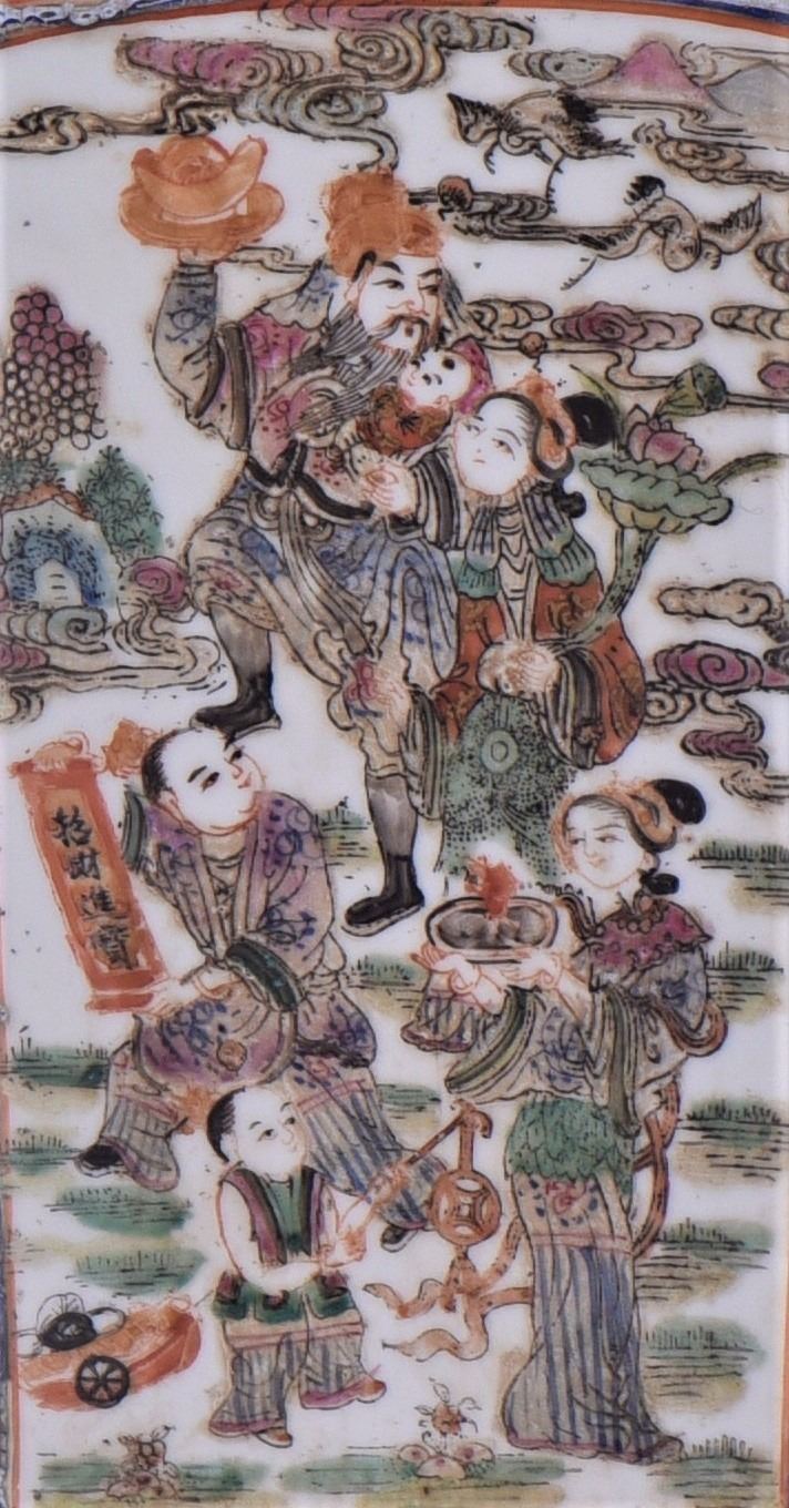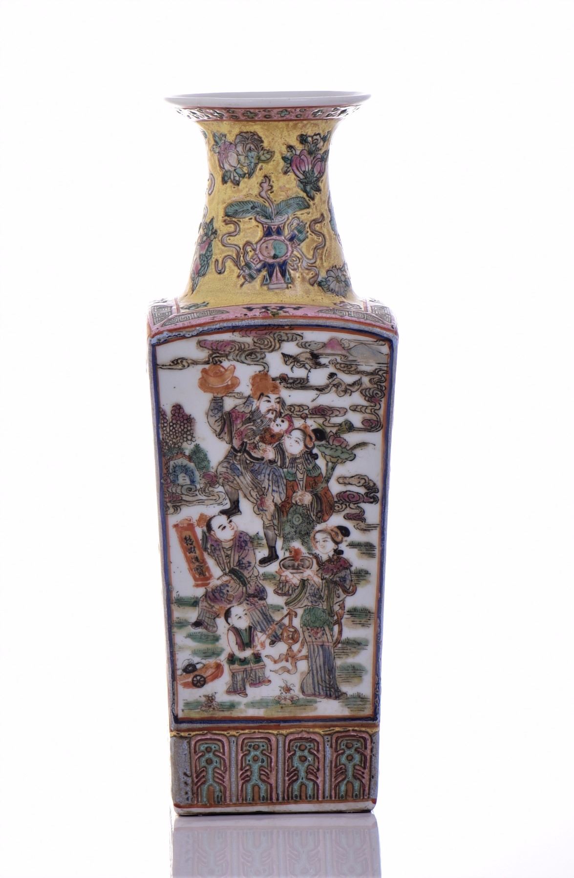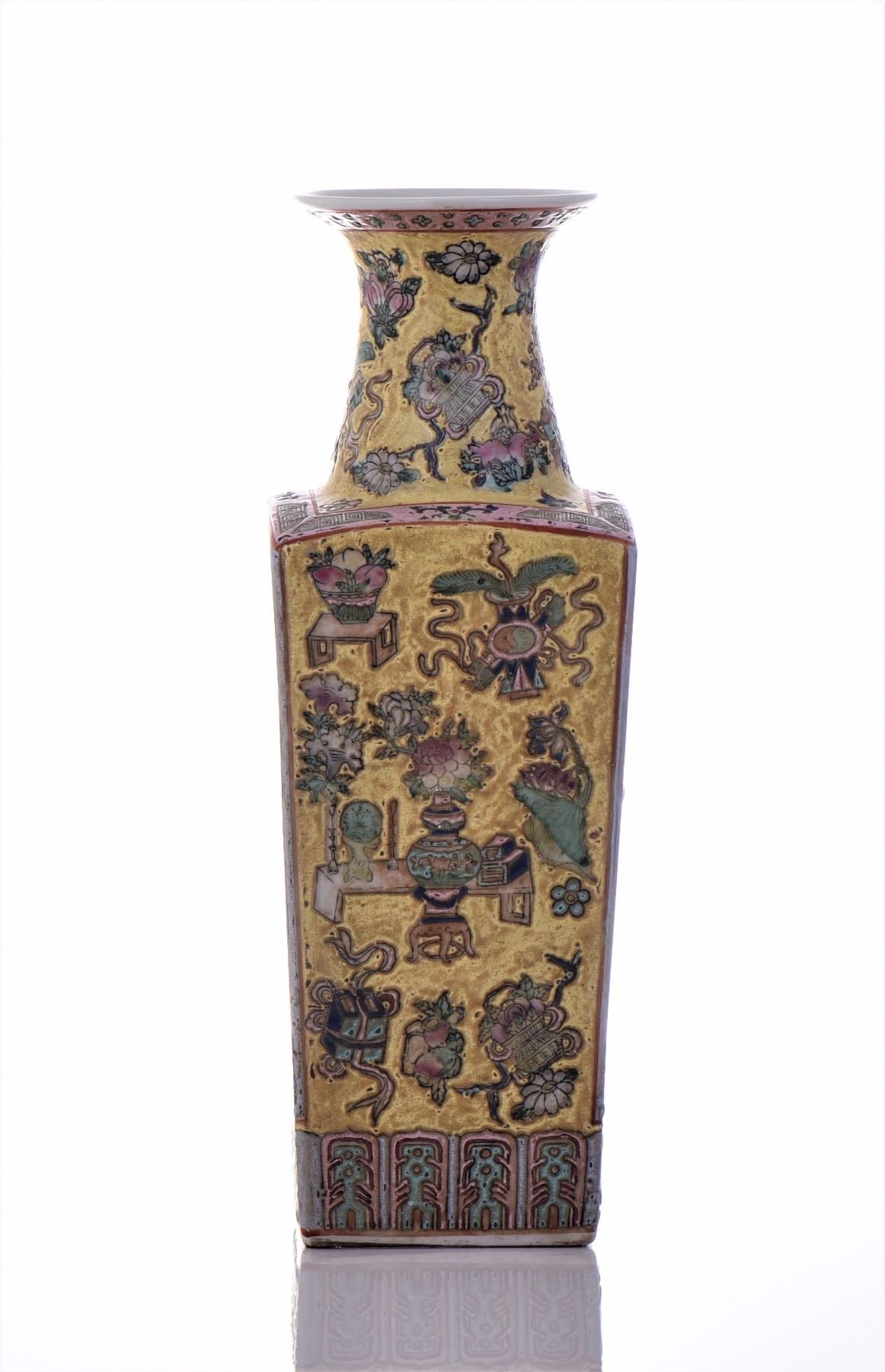 Chinese Porcelain Enameled Vase With Yellow And White Background Family Scenes. Signed with Chinese Archaic Script Chop Marks On The Bottom. Possibly Daoguang Nian Zhi 1821-1850 or older than Quing Dynasty. This may be an 18th or 19th Century Vase or older. Provenance: Consignor purchased this vase in 1948 And Has Had it In a Collection since it was brought to the U.S. We have no further provenance to determine the exact age and origin of this beautiful vase. Note: We will update this lot description if we receive further information. We encourage bidders to obtain expert opinions as well. Estimated more than 50 yrs. old. Chinese art is visual art that, whether ancient or modern. Early "stone age art" dates back to 10,000 BC, mostly consisting of simple pottery and sculptures. Chinese art has arguably the oldest continuous tradition in the world. Traditional Chinese painting involves essentially the same techniques as Chinese calligraphy and is done with a brush dipped in black or colored ink. As with calligraphy, the most popular materials on which paintings are made of paper and silk. Chinese ritual sculptures from the Shang and Western Zhou Dynasties come from a period of over a thousand years from c. 1500 and were cast with complex patterns and zoomorphic decoration, but avoid the human figure. Smaller figures in pottery or wood were placed in tombs for many centuries afterwards, reaching a peak of quality in the Tang Dynasty. Small Buddhist figures and groups were produced to a very high quality in a range of media, as was relief decoration of all sorts of objects, especially in metalwork and jade. Sculptors of all sorts were regarded as artisans and very few names are recorded. Chinese ceramic ware shows a continuous development since the pre-dynastic periods, and is one of the most significant forms of Chinese art. Most later Chinese ceramics, even of the finest quality, were made on an industrial scale, thus very few individual potters or painters are known. Many of the most renowned workshops were owned by or reserved for the Emperor, and large quantities of ceramics were exported as diplomatic gifts or for trade from an early date. (Wikipedia) Size and/or Weight: See Measurement Photo. (Photos Represent The Lot Condition, Pangaea Auctions)