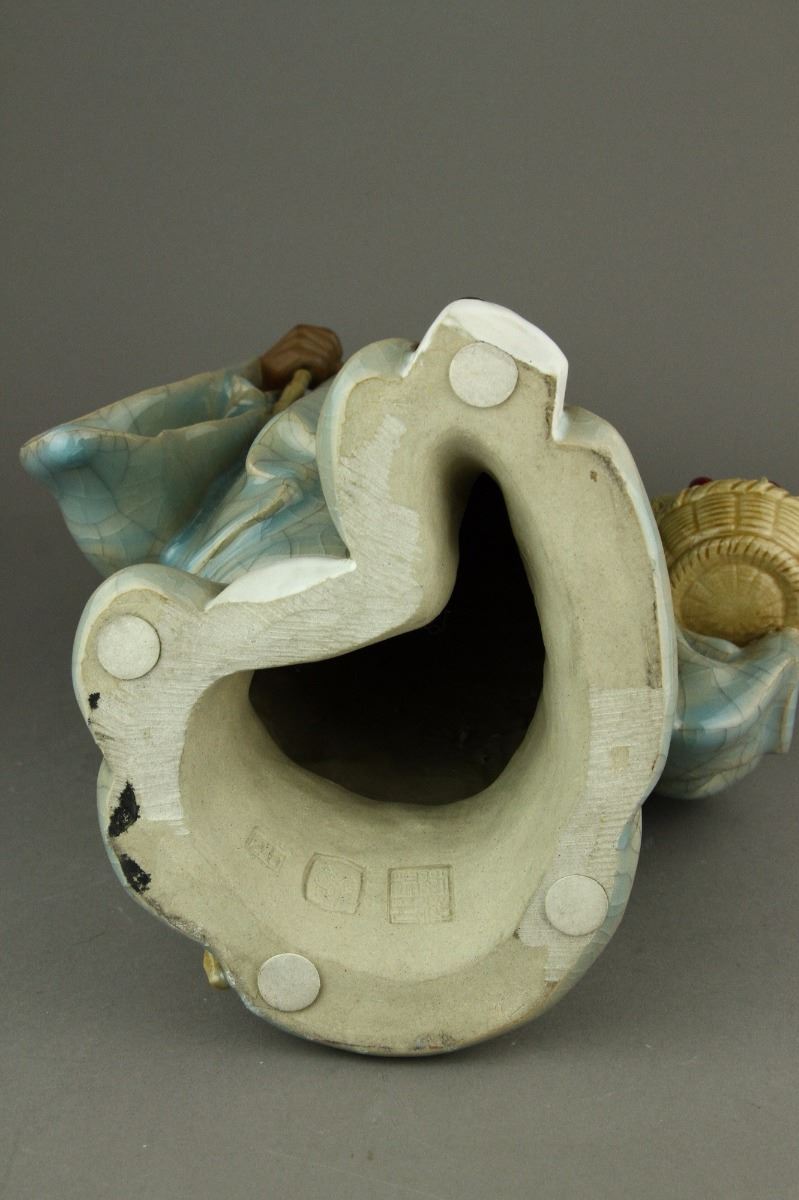 Chinese porcelain figure; featuring scholar Su Dongpo carrying a basket of cherry; covered in crackle celadon glaze; accompanied with artist certificate; H: 52 cm, W: 24 cm, 6.5 kg