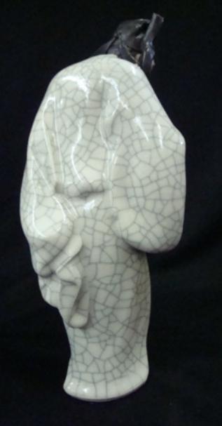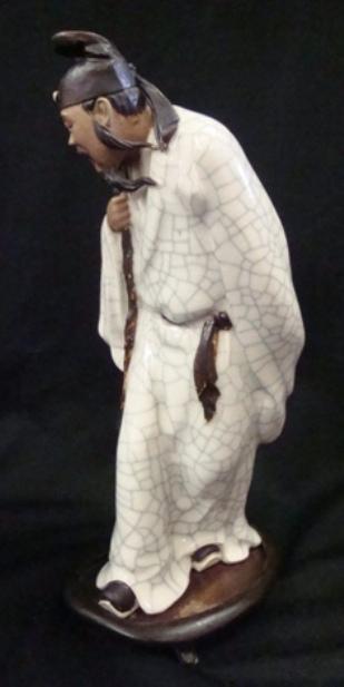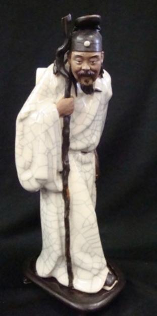 Desirable mid-20th c. Chinese porcelain figurine of a man with a walking stick. Comes with wood base. 11" tall. Detailed and well done.