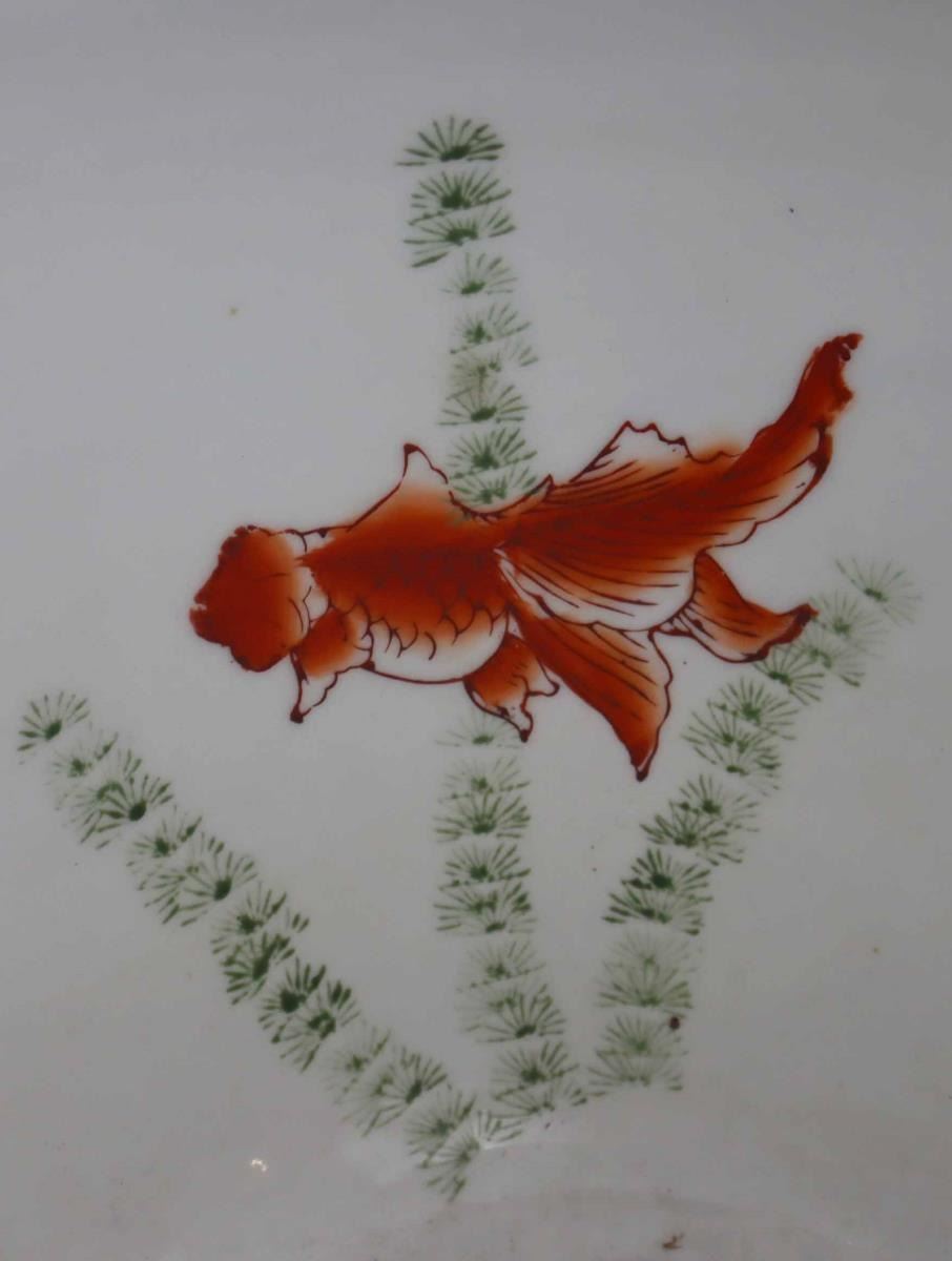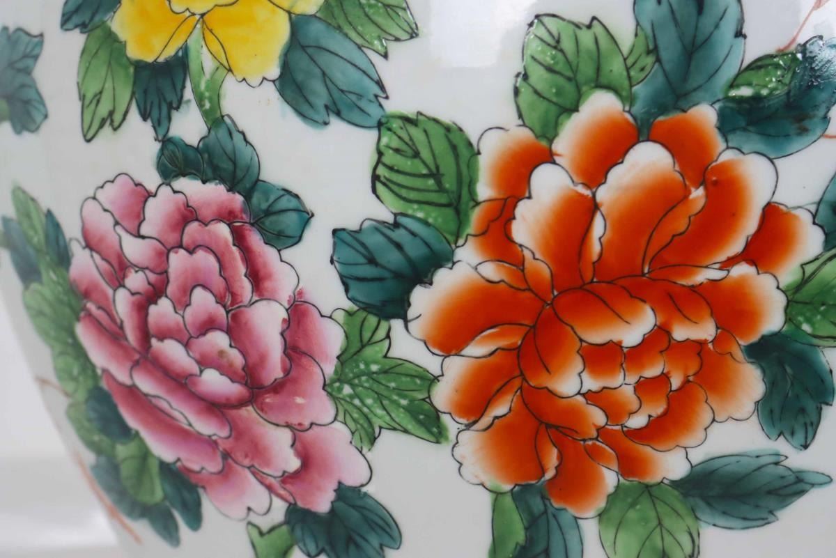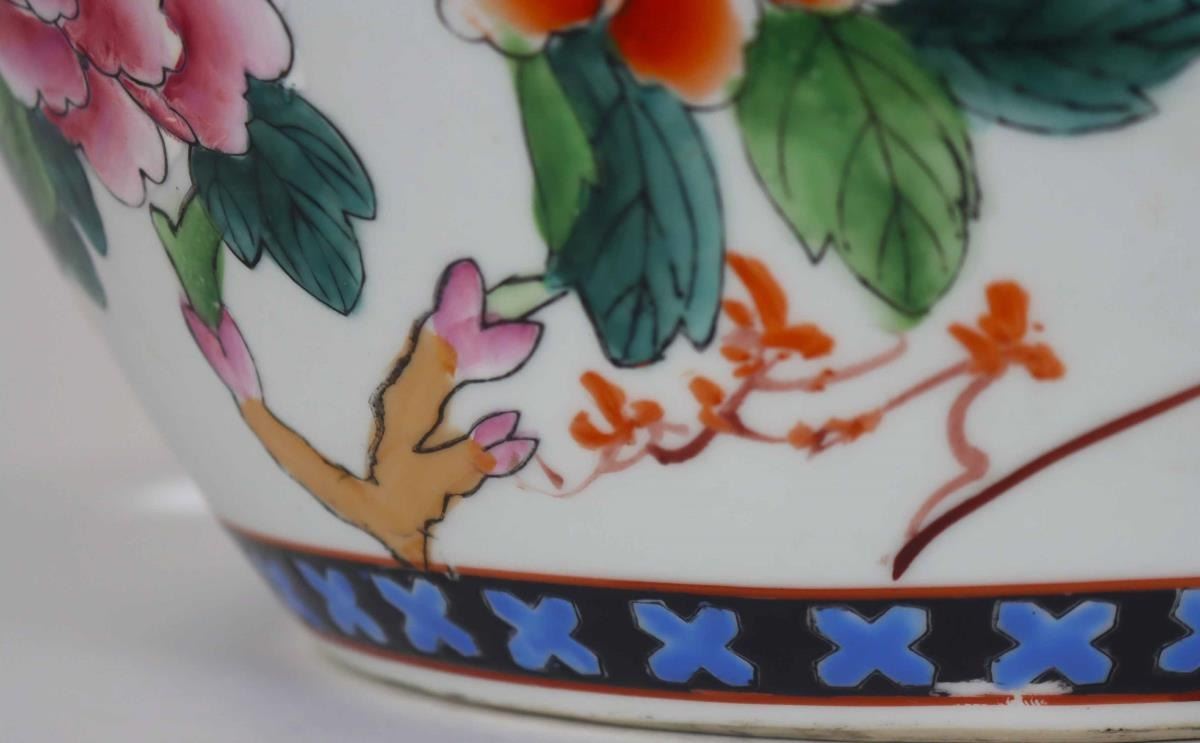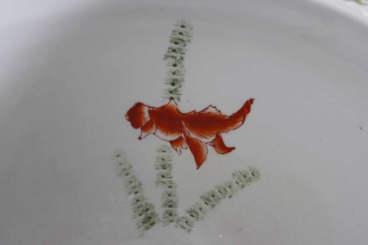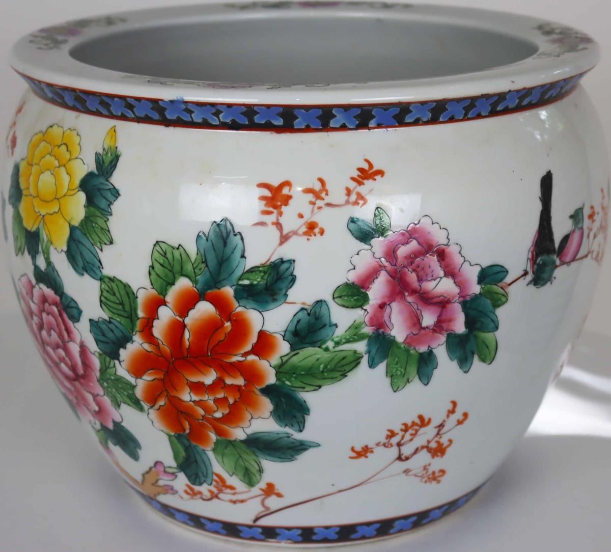 Chinese hand-painted fish bowl with floral design and blue trimmed rim, this bowl has an interior design consisting of three goldfish. Chinese fish bowls were originally used in palaces and temples to display lucky goldfish in Ming dynasty era China. They now often serve as elegant planter pots and jardinieres.