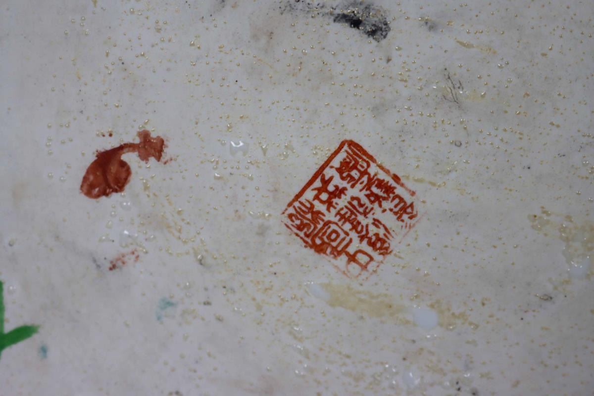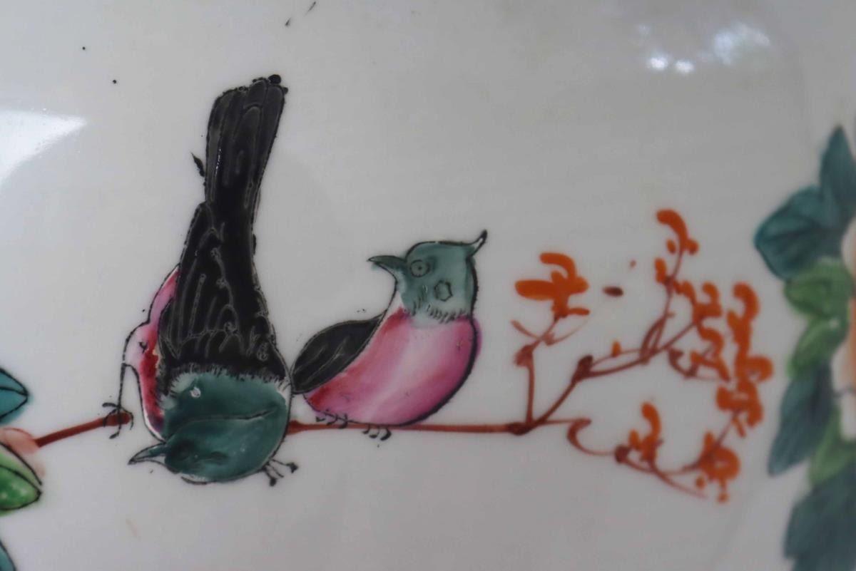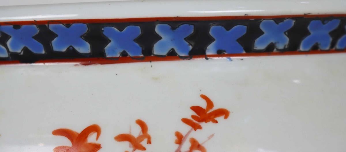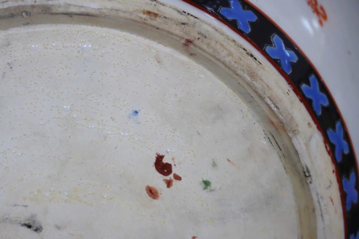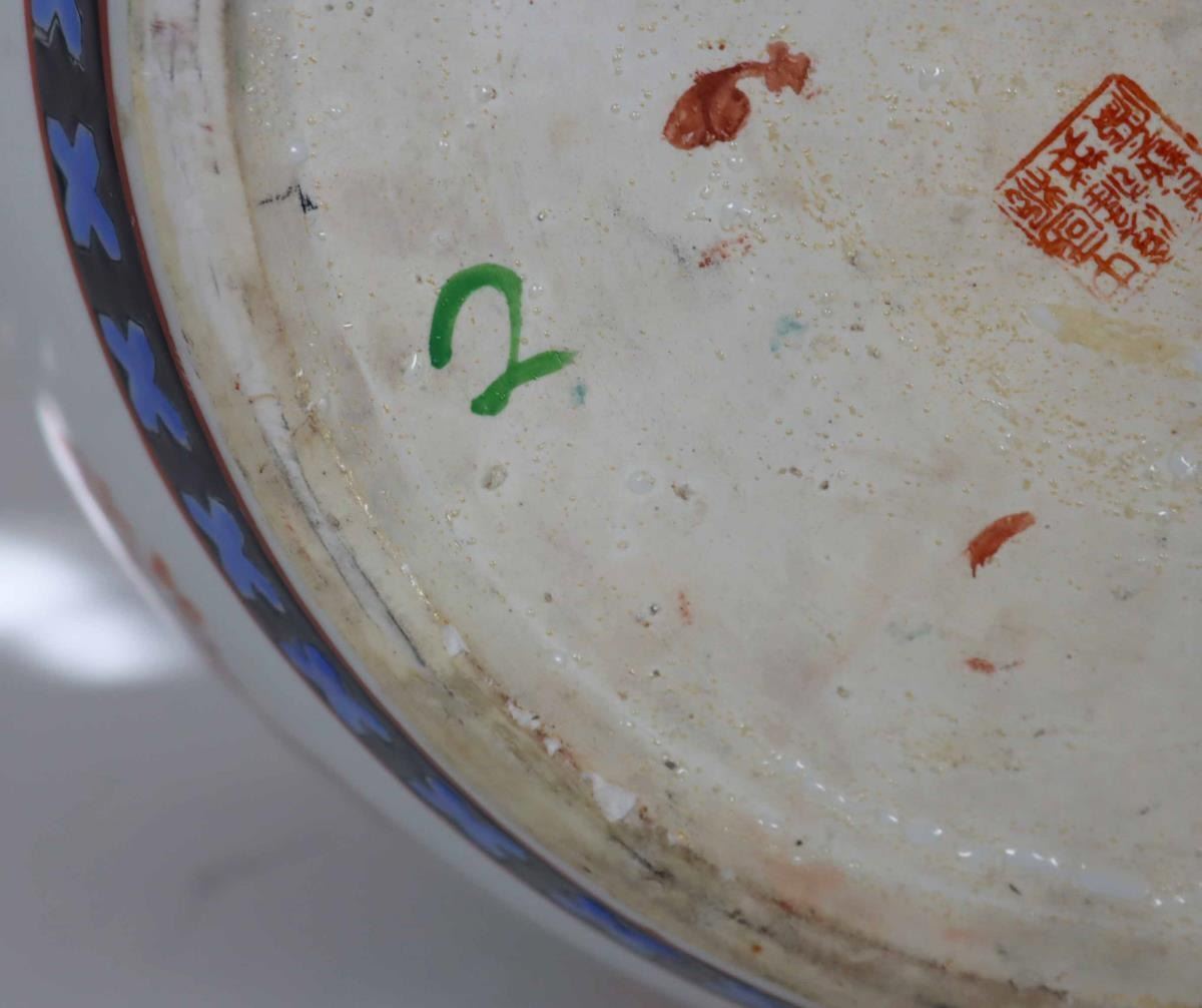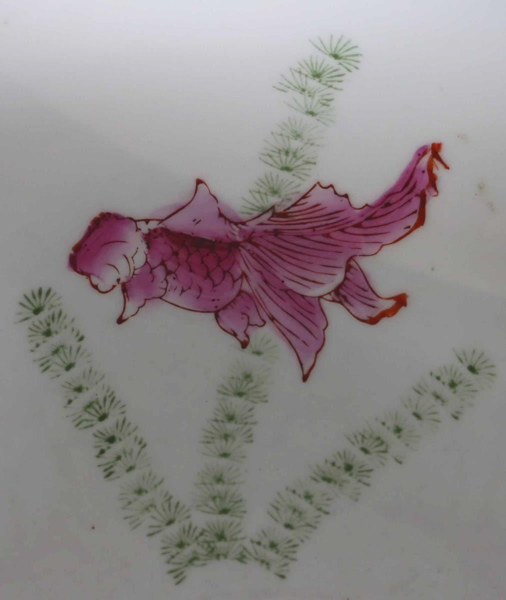 Chinese hand-painted fish bowl with floral design and blue trimmed rim, this bowl has an interior design consisting of three goldfish. Chinese fish bowls were originally used in palaces and temples to display lucky goldfish in Ming dynasty era China. They now often serve as elegant planter pots and jardinieres.