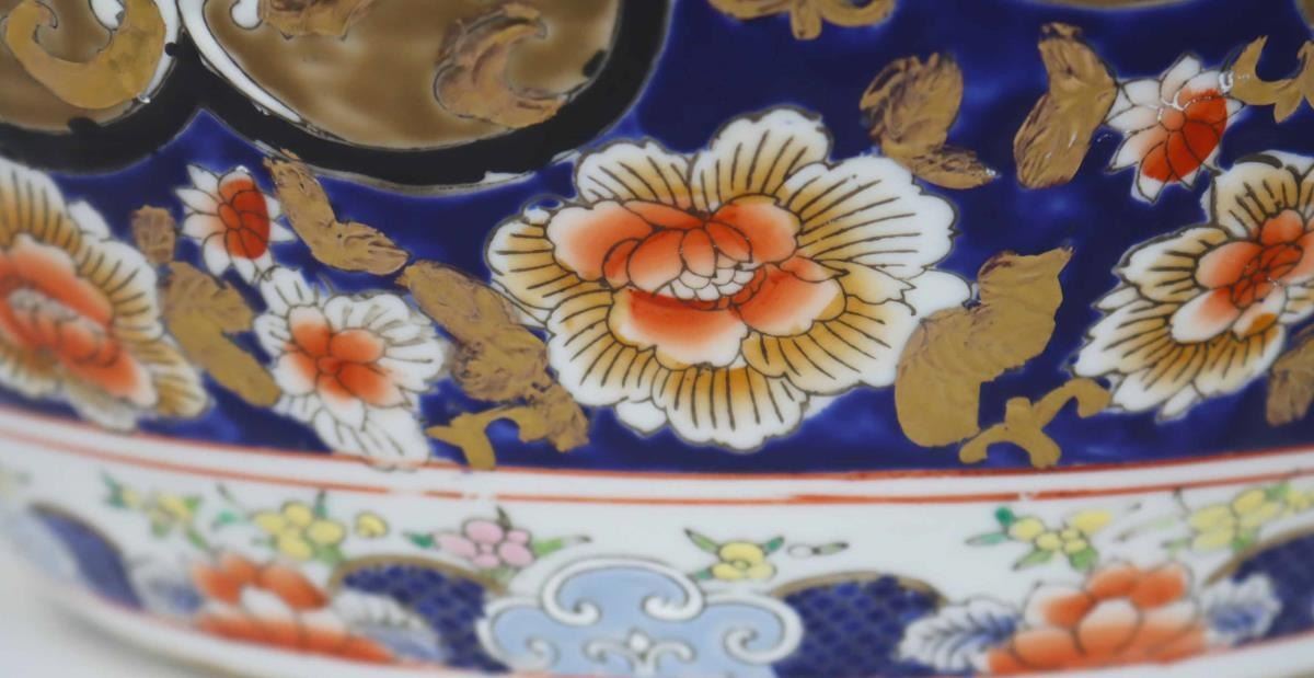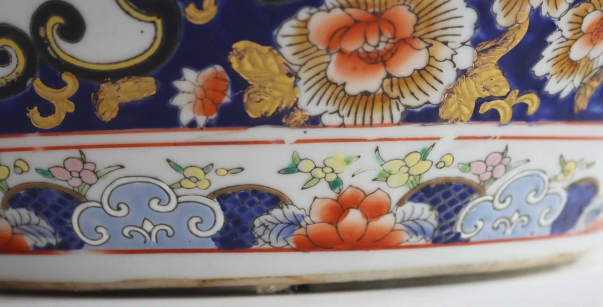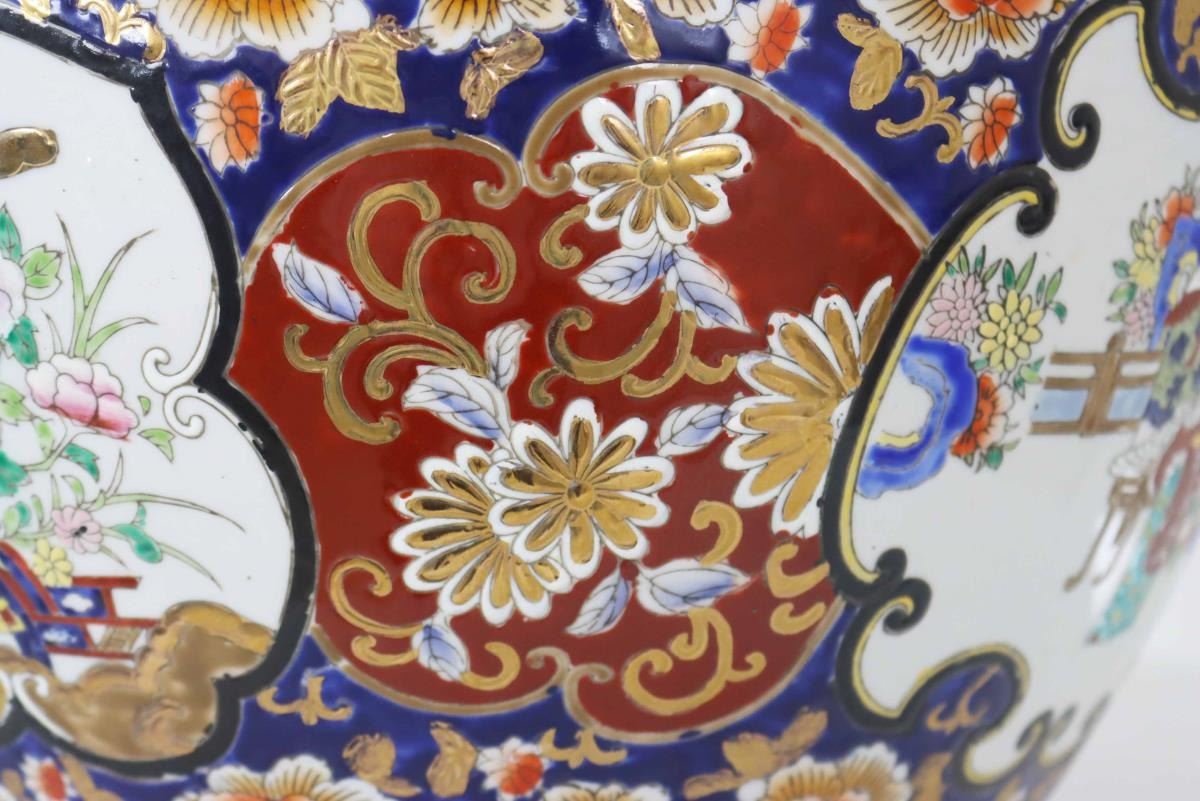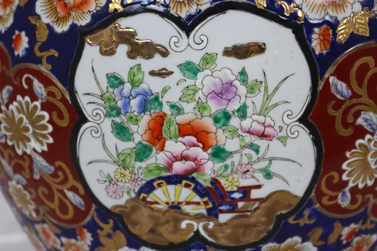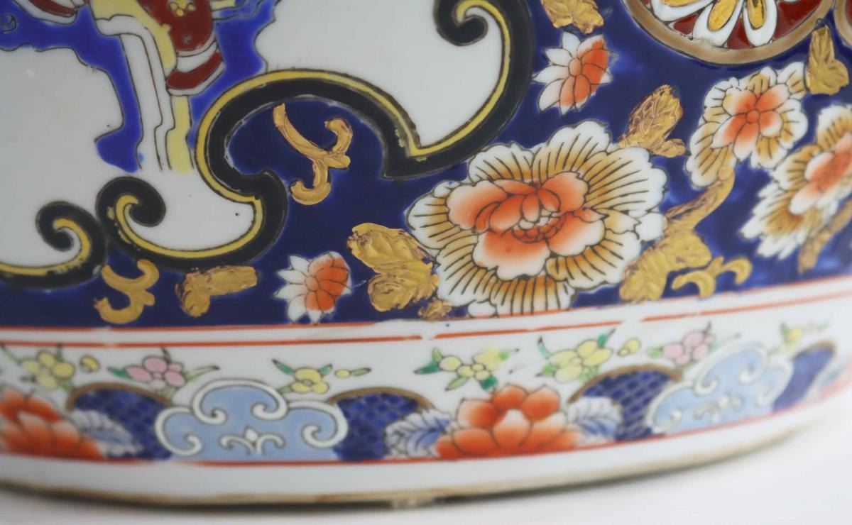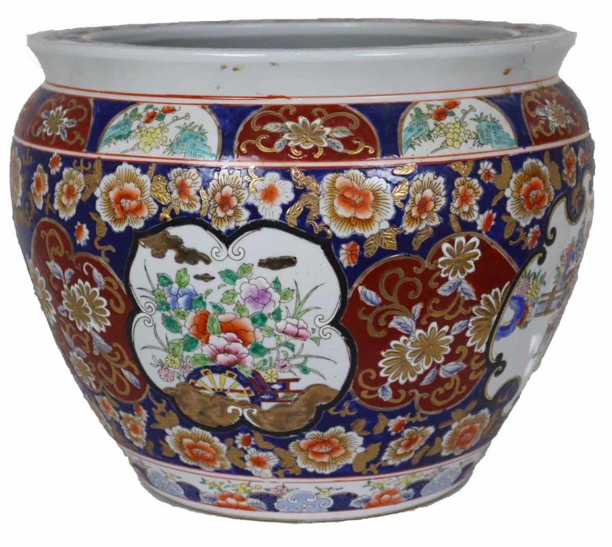 Richly patterned Chinese fish bowl with blue and orange and gold highlights. Chinese fish bowls were originally used in palaces and temples to display lucky goldfish in Ming dynasty era China. They now often serve as elegant planter pots and jardinieres.