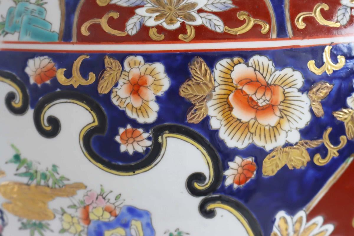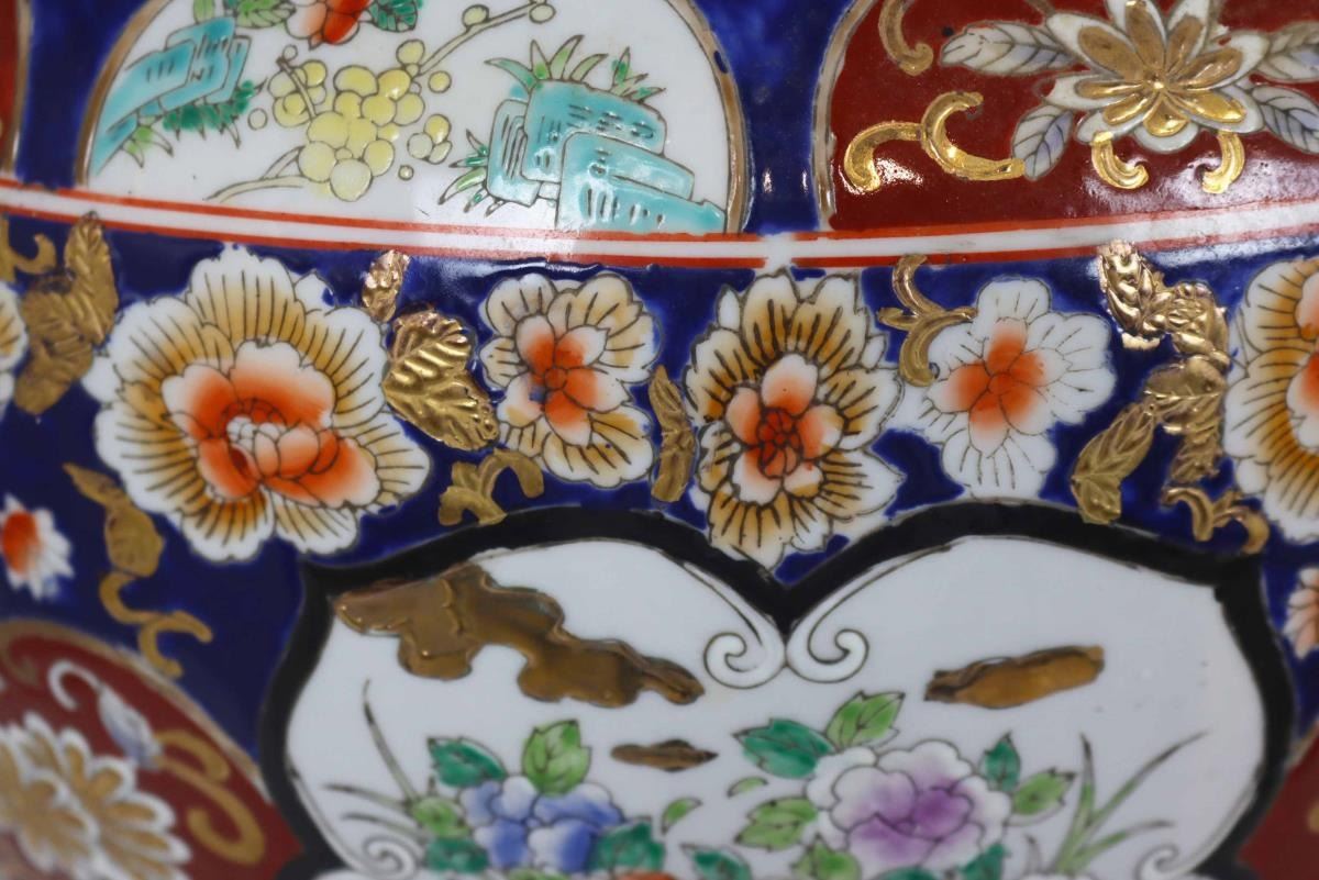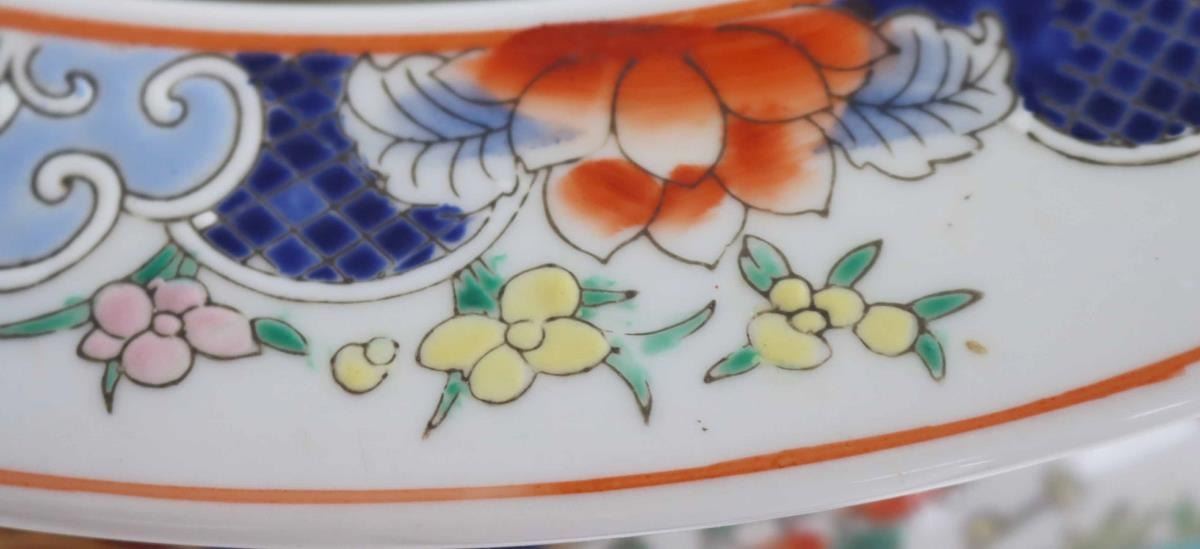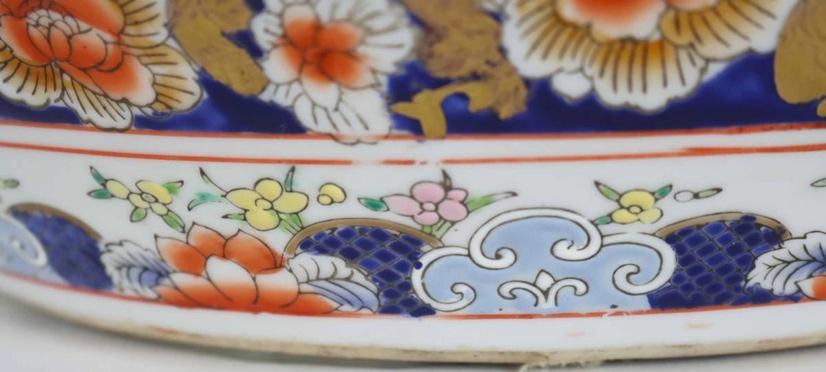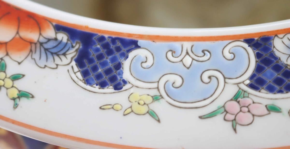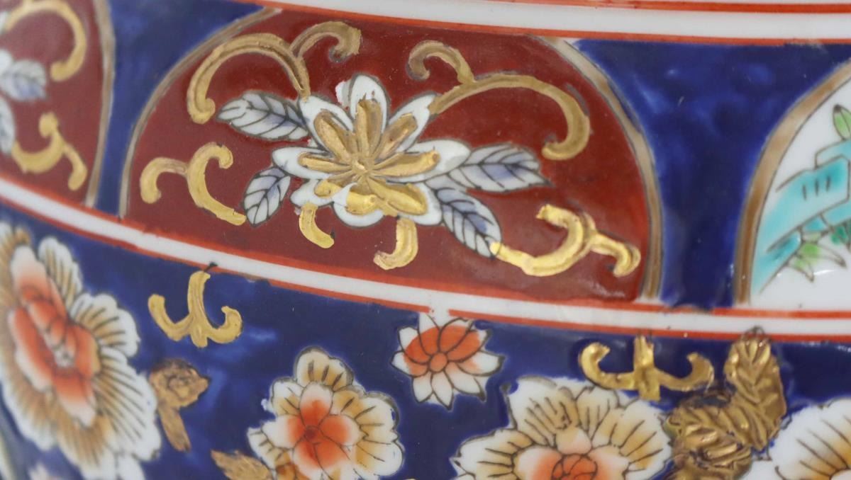 Richly patterned Chinese fish bowl with blue and orange and gold highlights. Chinese fish bowls were originally used in palaces and temples to display lucky goldfish in Ming dynasty era China. They now often serve as elegant planter pots and jardinieres.