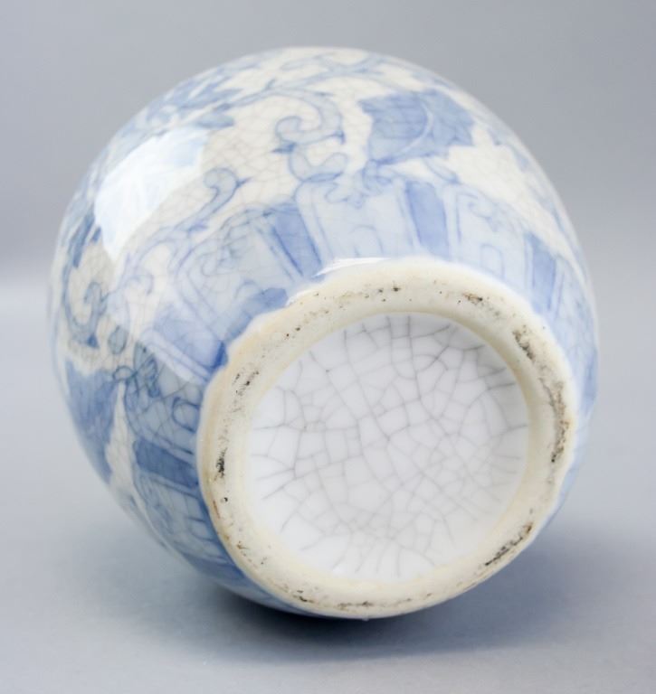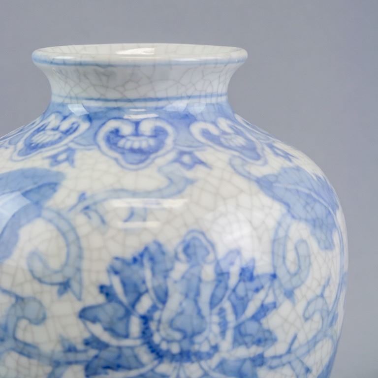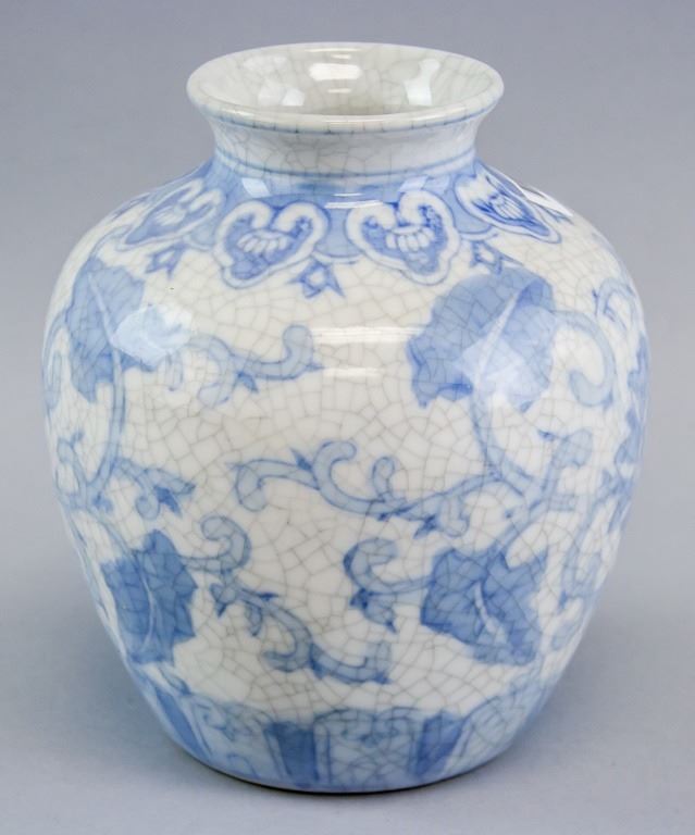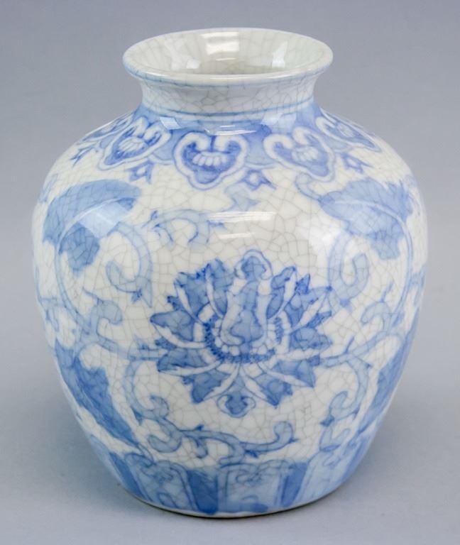 Chinese ceramic jar. Of blue and white tone. With crazing throughout. With slightly overturned lip, short neck, and round body. Decorated with plants. 14 x 15 cm. 626 grams.