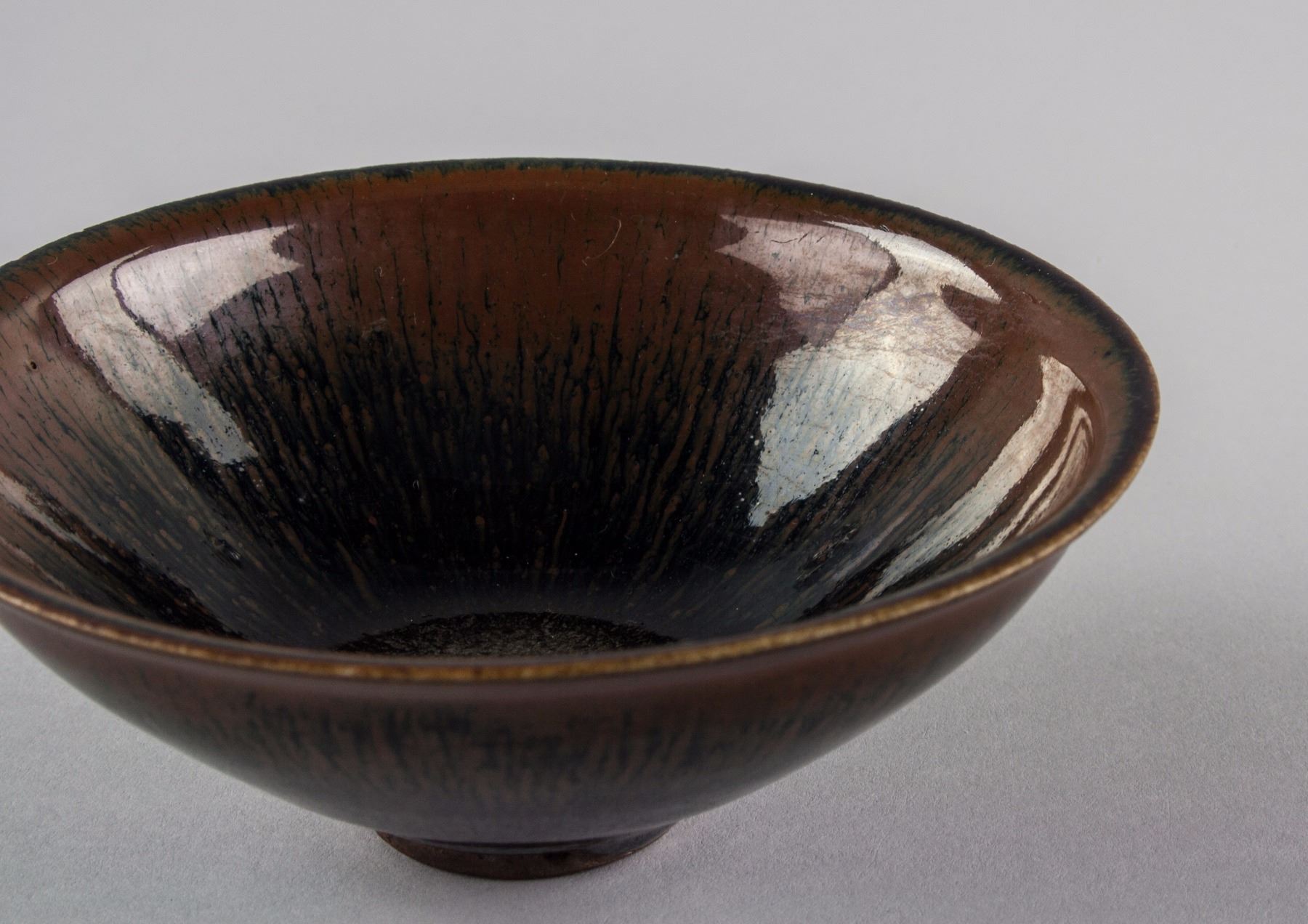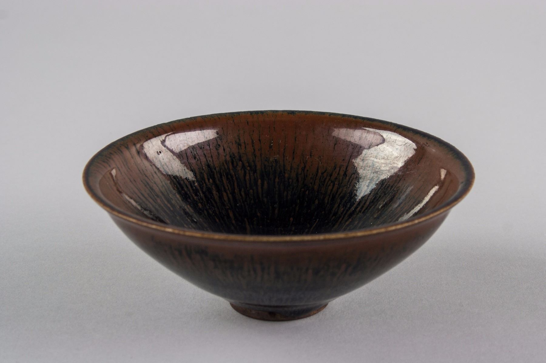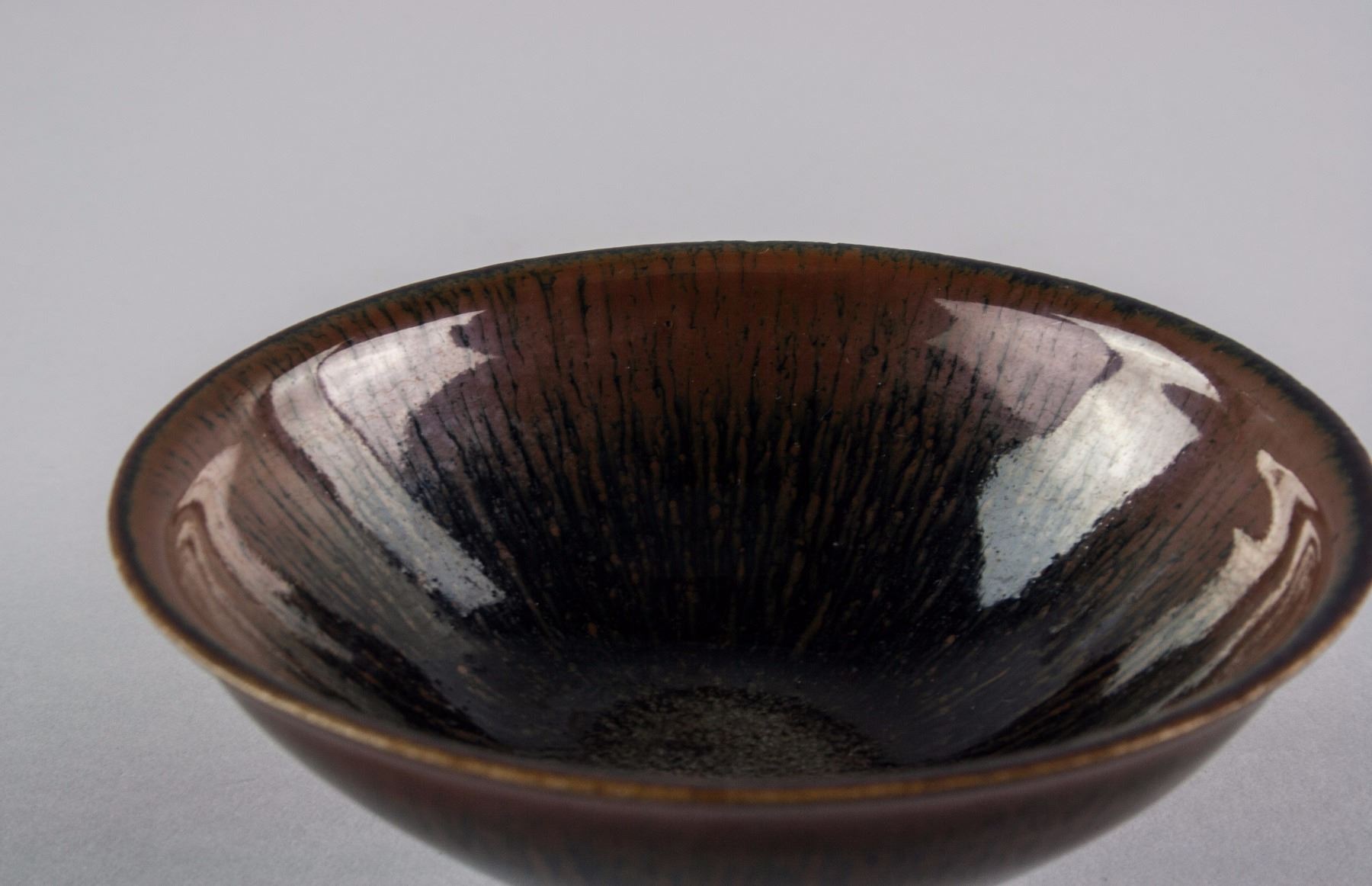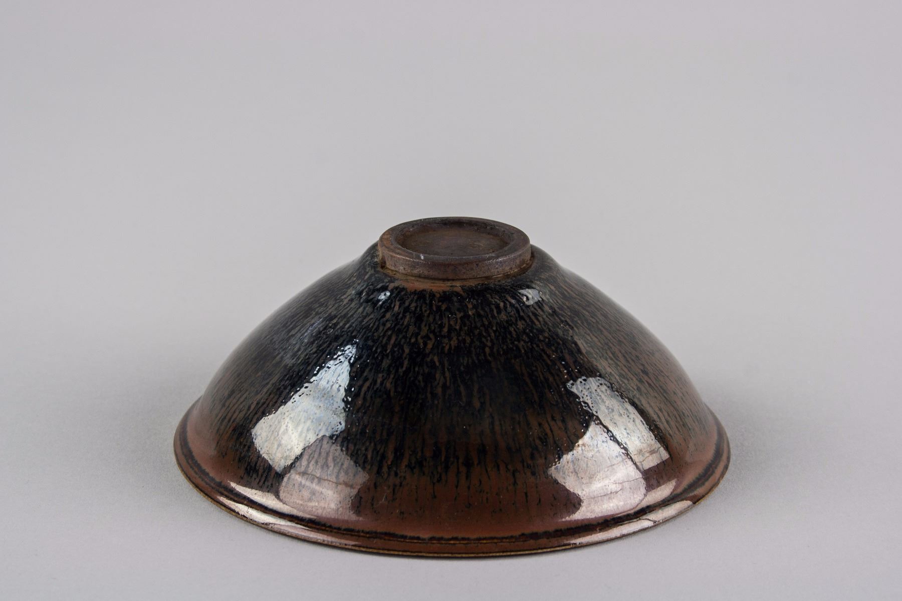 Chinese Jianyao style porcelain Jianzhan cup; of rounded edge, tapering to bottom; supported on small short foot rim; covered by tear pattern glaze; 5 cm x 13 cm, 185 grams
