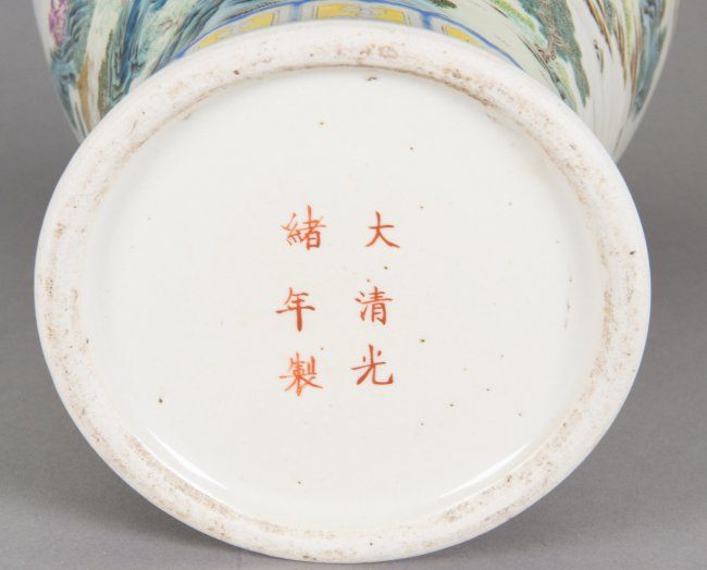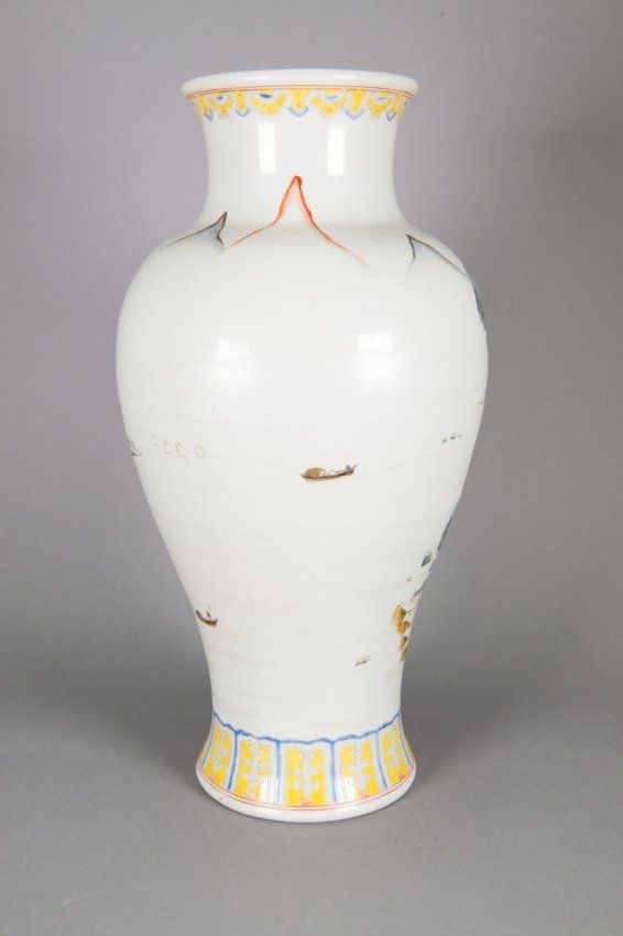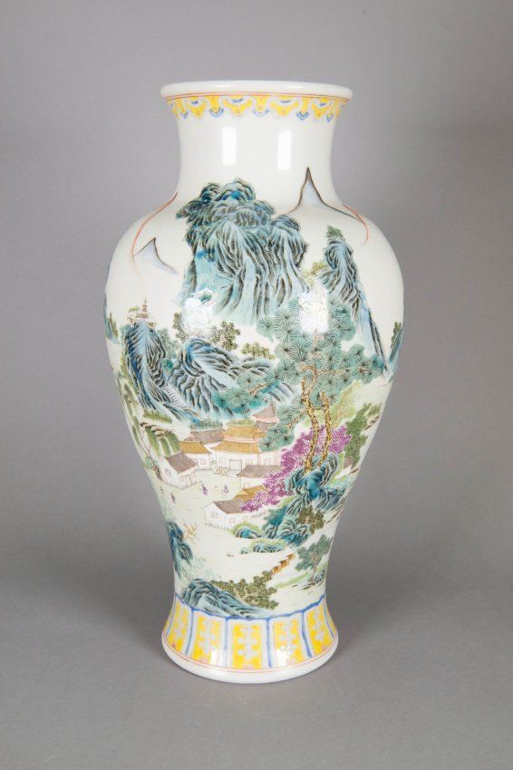 Chinese porcelain vase; slender plum form body featuring continuous landscape scene; six-character Mark on base; H: 43 cm, D: 13 cm, 3.5 kg