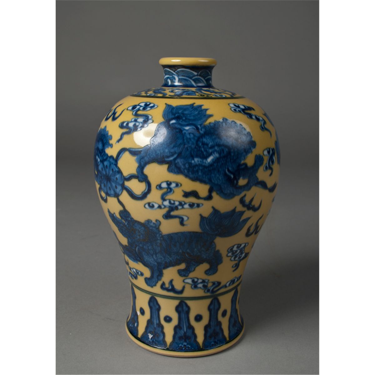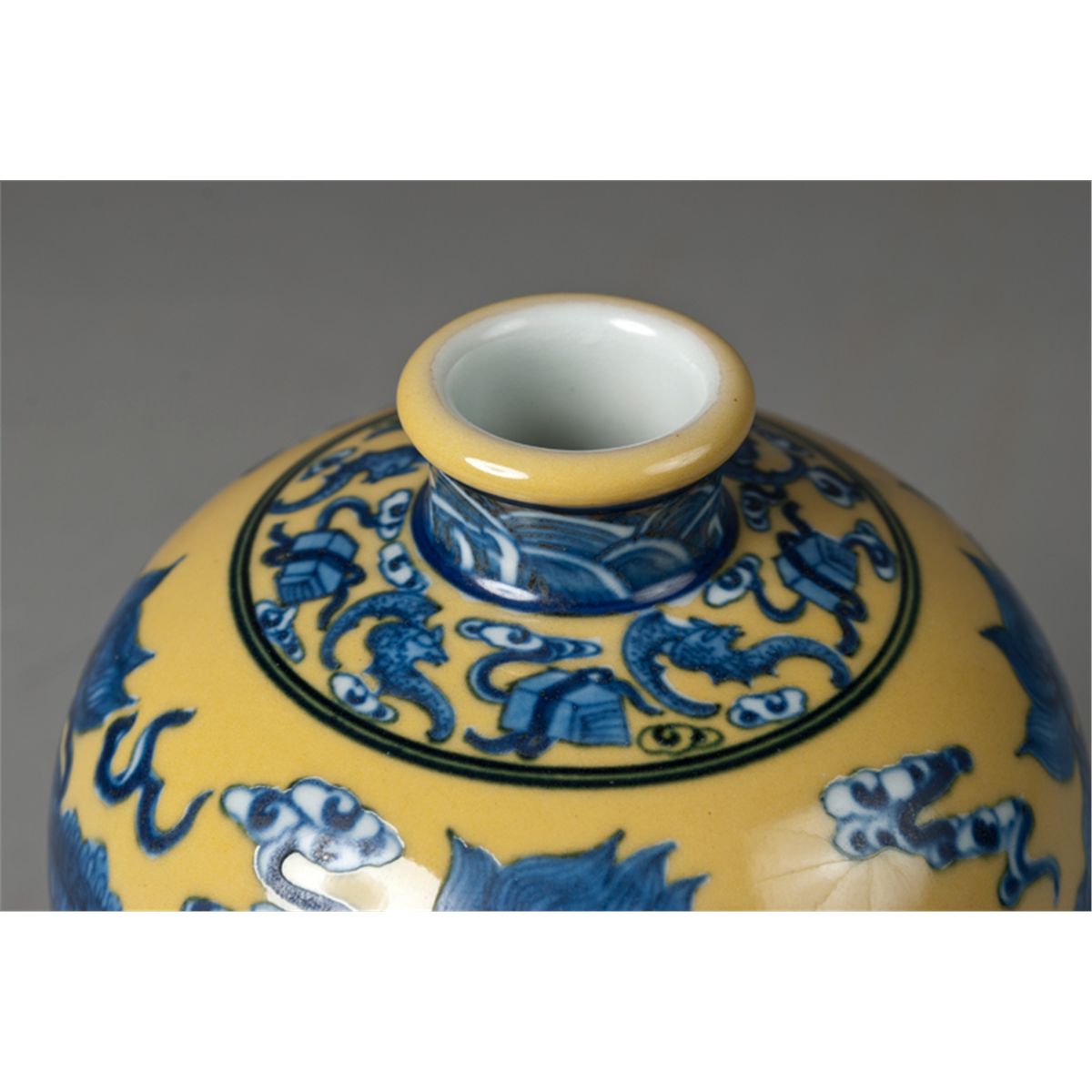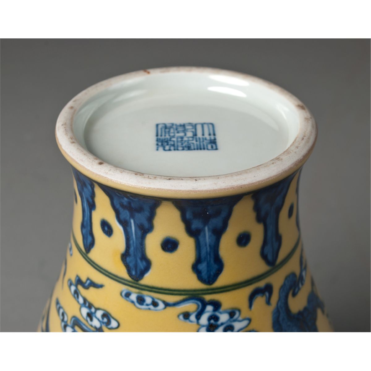 In yellow and blue, decorated with mythical beasts amid ruyi, stiff petals and bats. Six character mark in underglaze blue for Great Qing Qianlong Production on underside. 8 & 1/8" H, circa 20th century. Private collection Rochester Hills, MI.