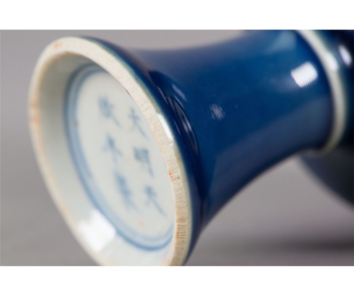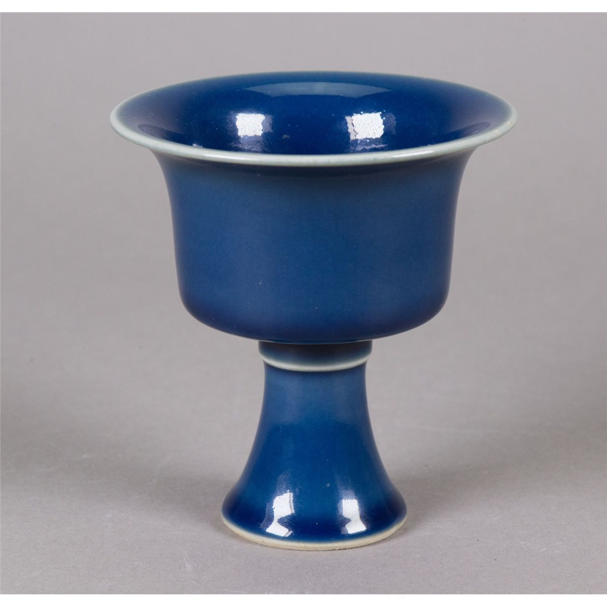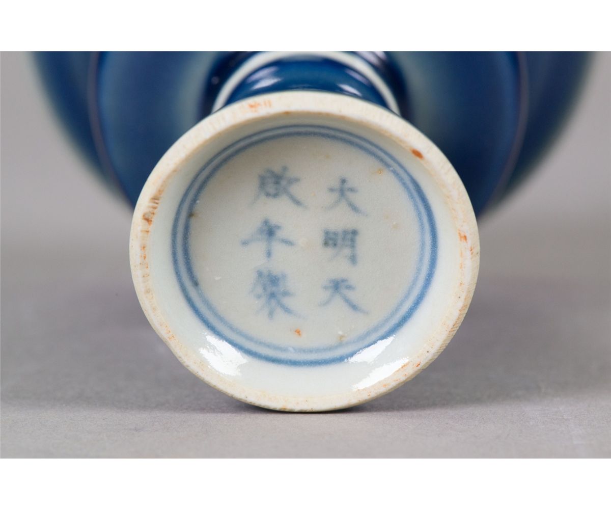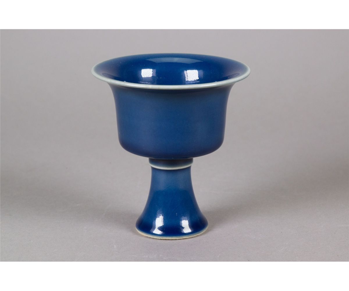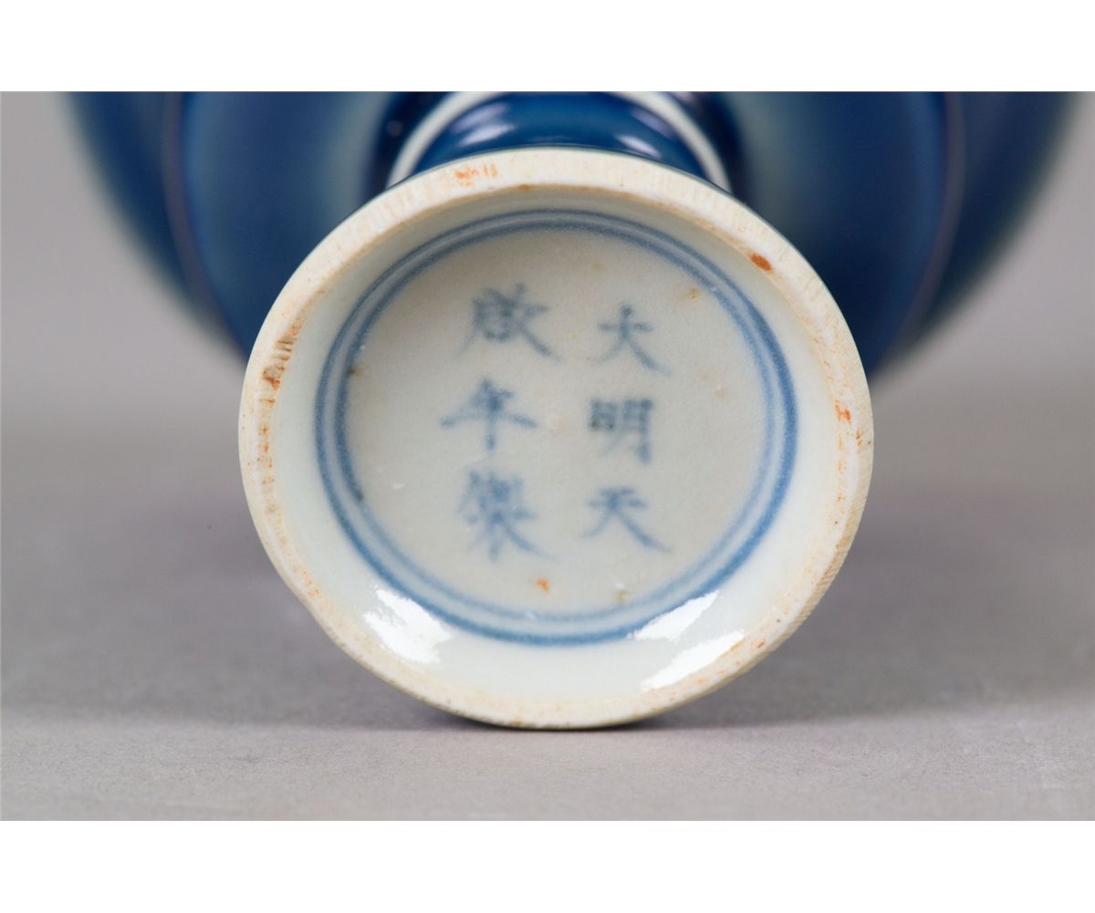 Chinese porcelain monochrome blue stem cup; supported on everted foot rim; six-character Ming Tianqi mark on base; H: 9.5 cm, D: 11 cm, 225 grams