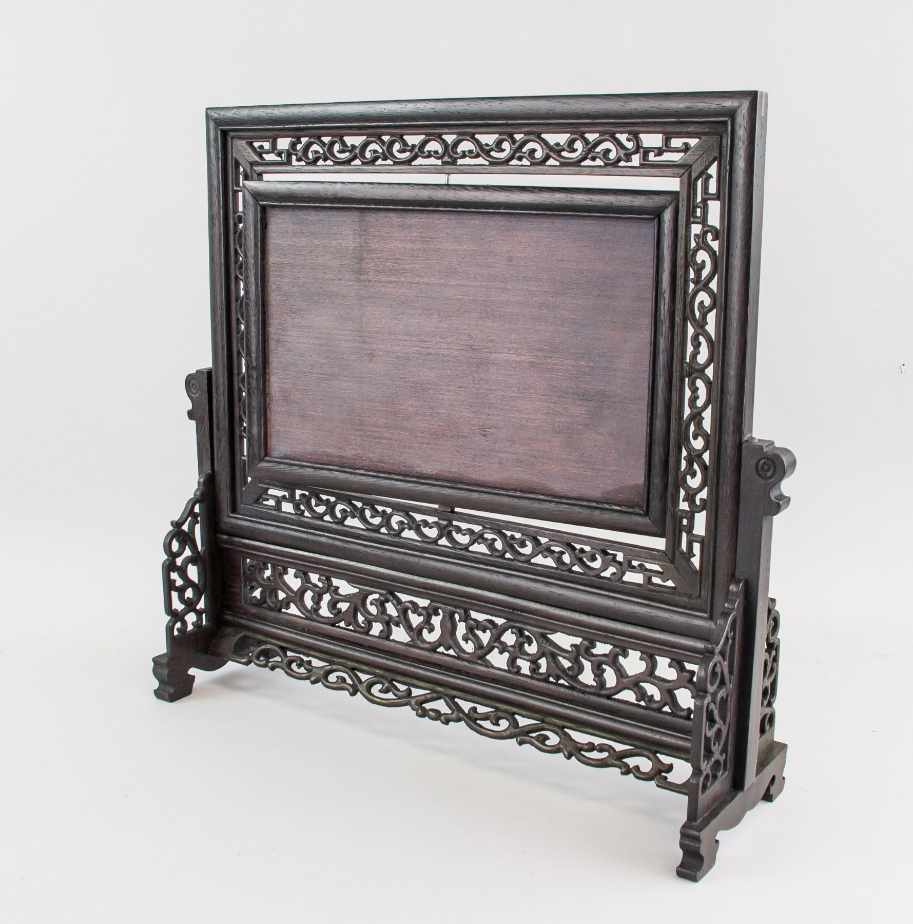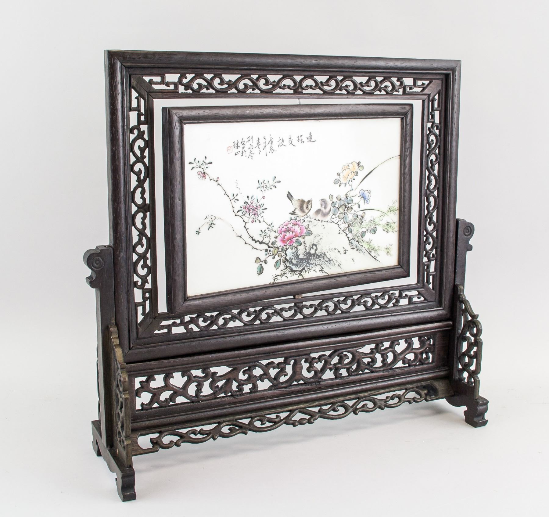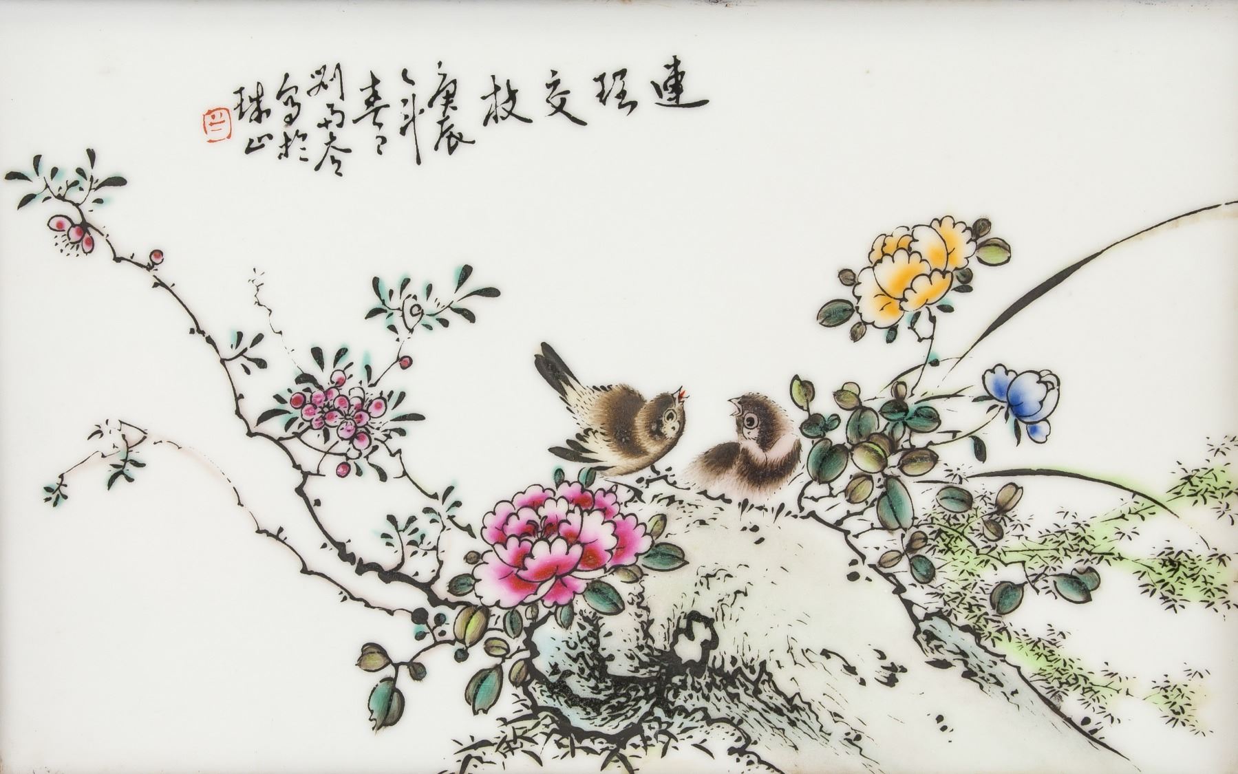 Chinese porcelain plaque painting screen, painted with flowers and birds, signed Liu Yucen (1904-1969), inscribed with 1 artist seal, with wood carving stand, stand with open working carving of floral pattern, 38 x 40 cm; 1400 grams