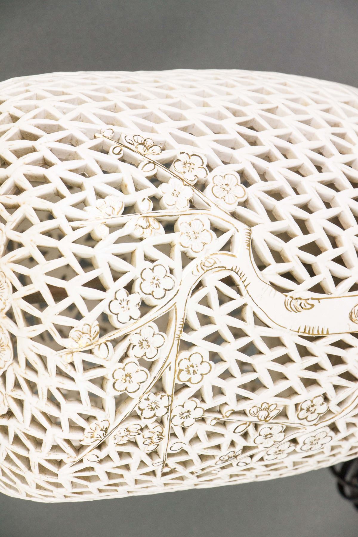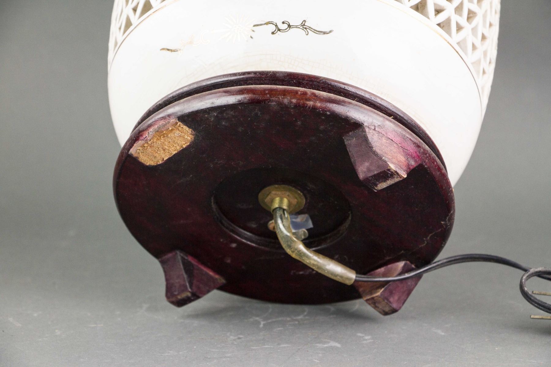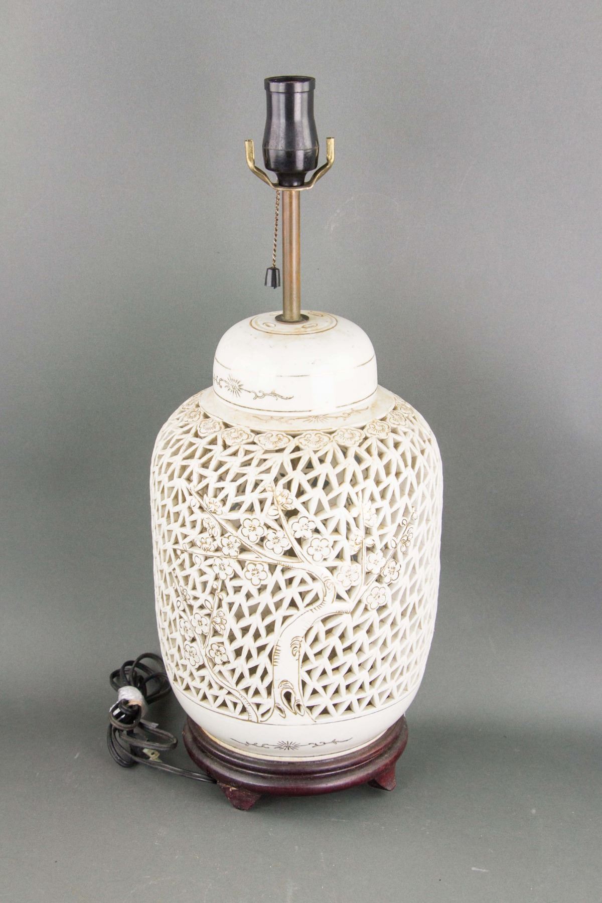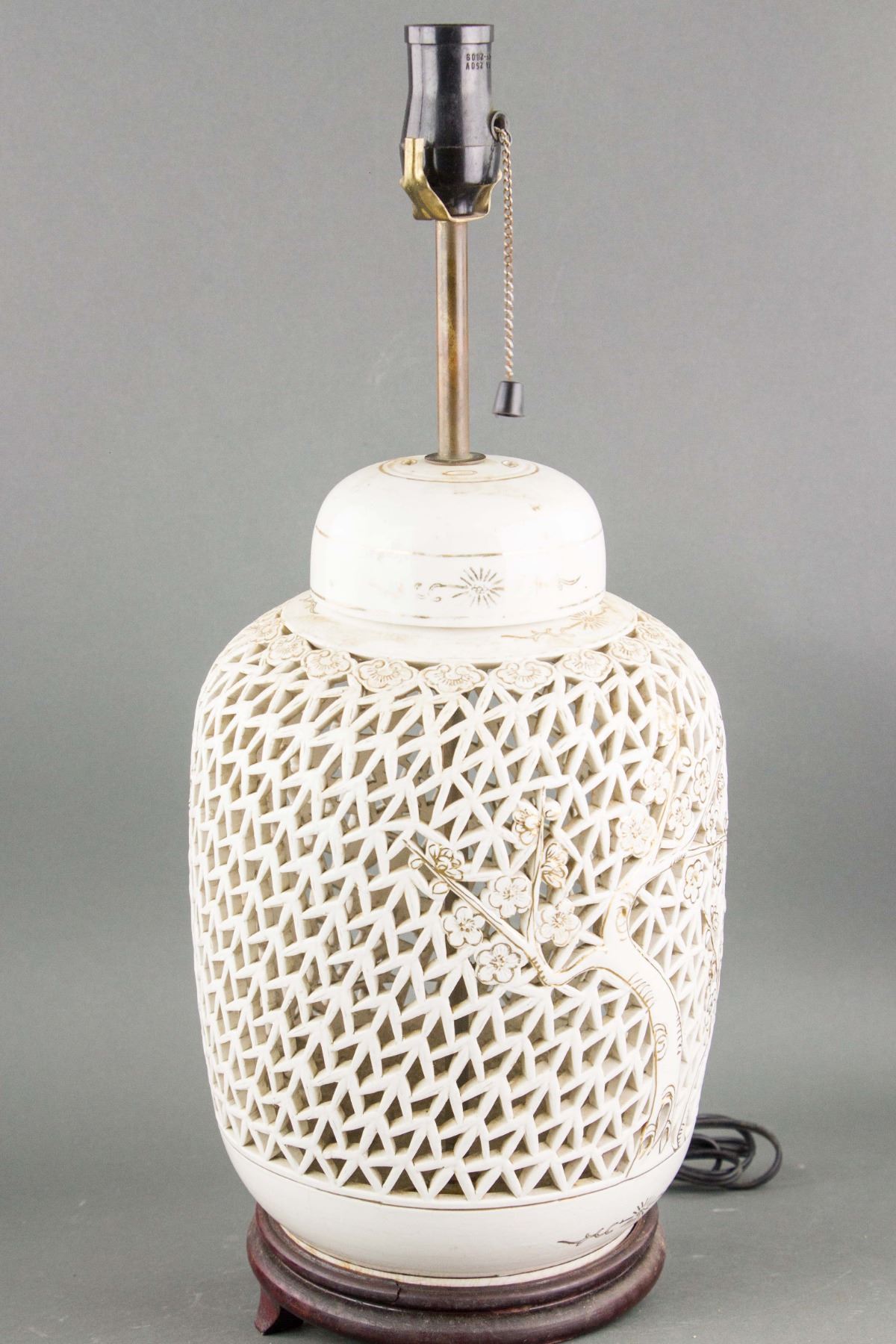 Chinese white porcelain lamp; comprised of a white porcelain case form body with open work reticulate carving decoration and lamp; with wood stand; H: 51 cm, D: 19 cm, 2606 grams