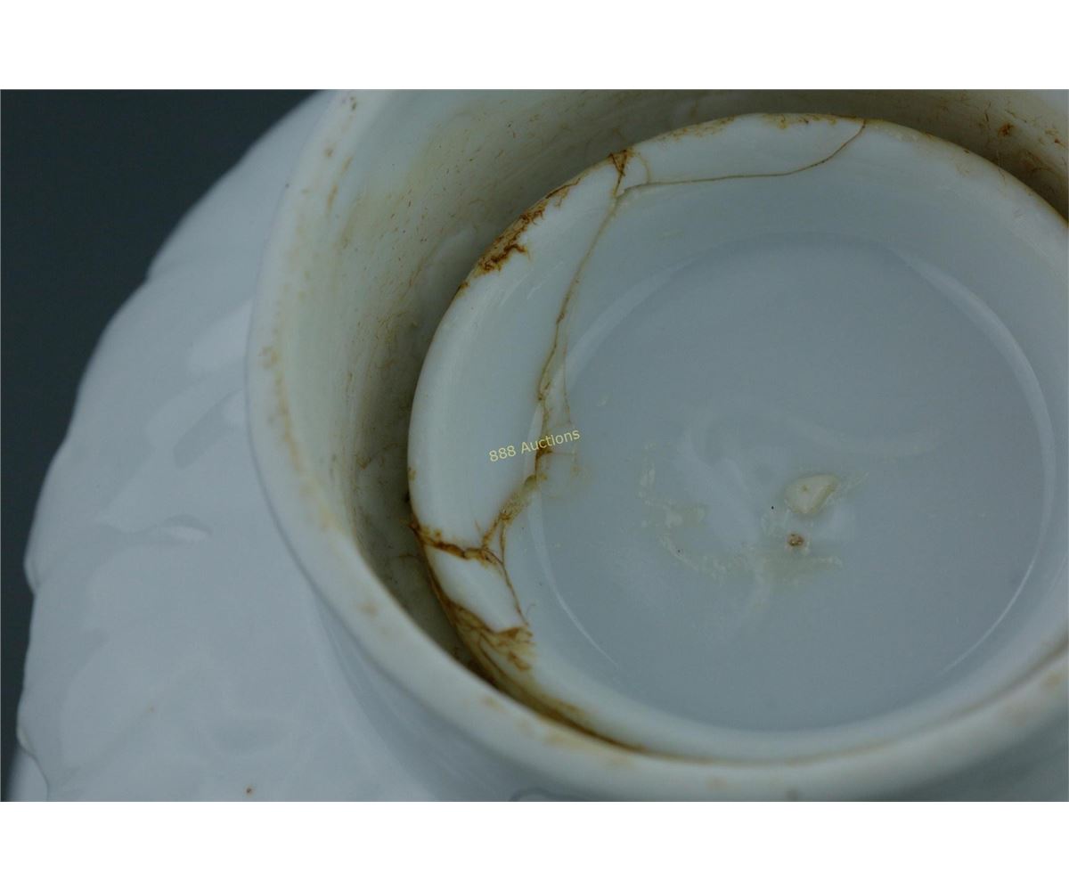Chinese porcelain revolving stem cup; deep form with slightly flared rim; featuring molded designs of lotus scroll (chip repair at base), 19th/20th Century; D: 13 cm, H: 9 cm