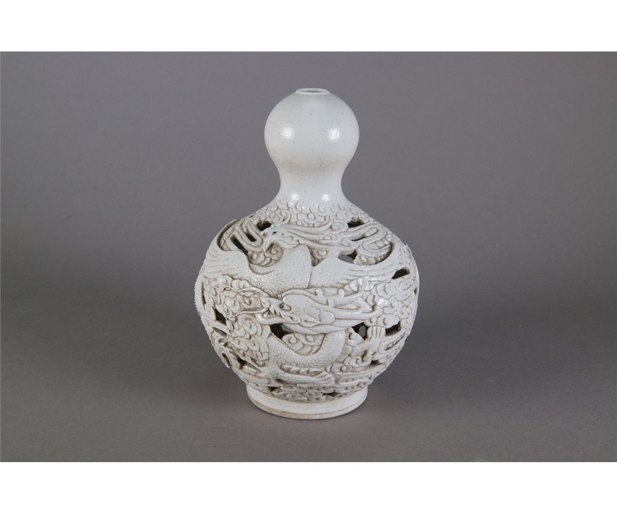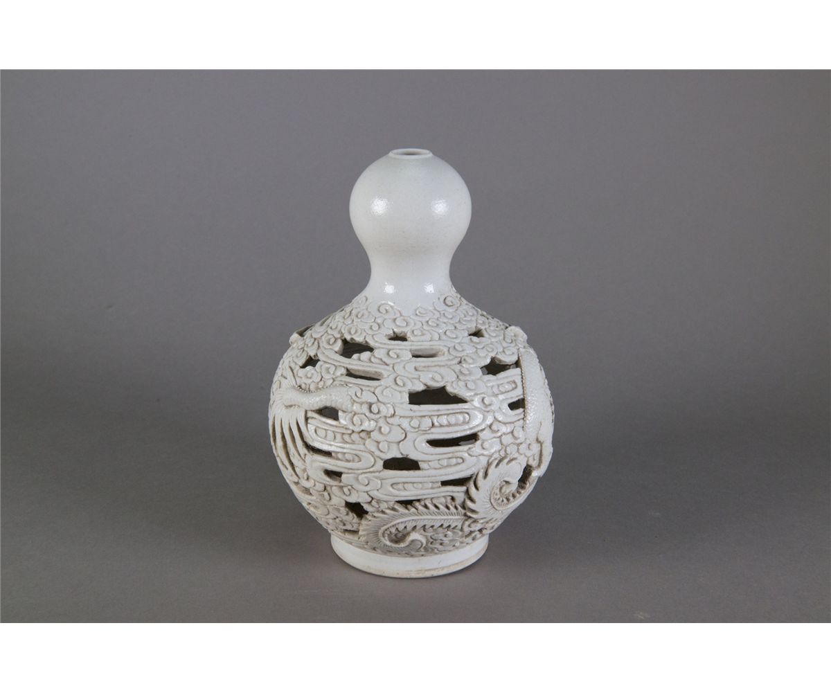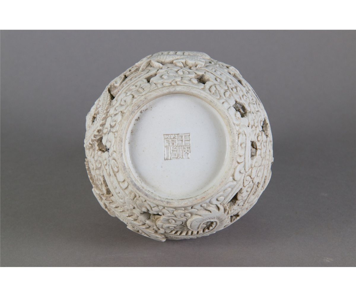 Chinese porcelain round vase; of globular body with a rounded opening; featuring openwork carvings of dragon and phoenix; four-character Wang Bingrong mark on base; 636 grams