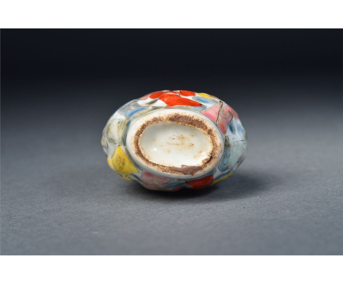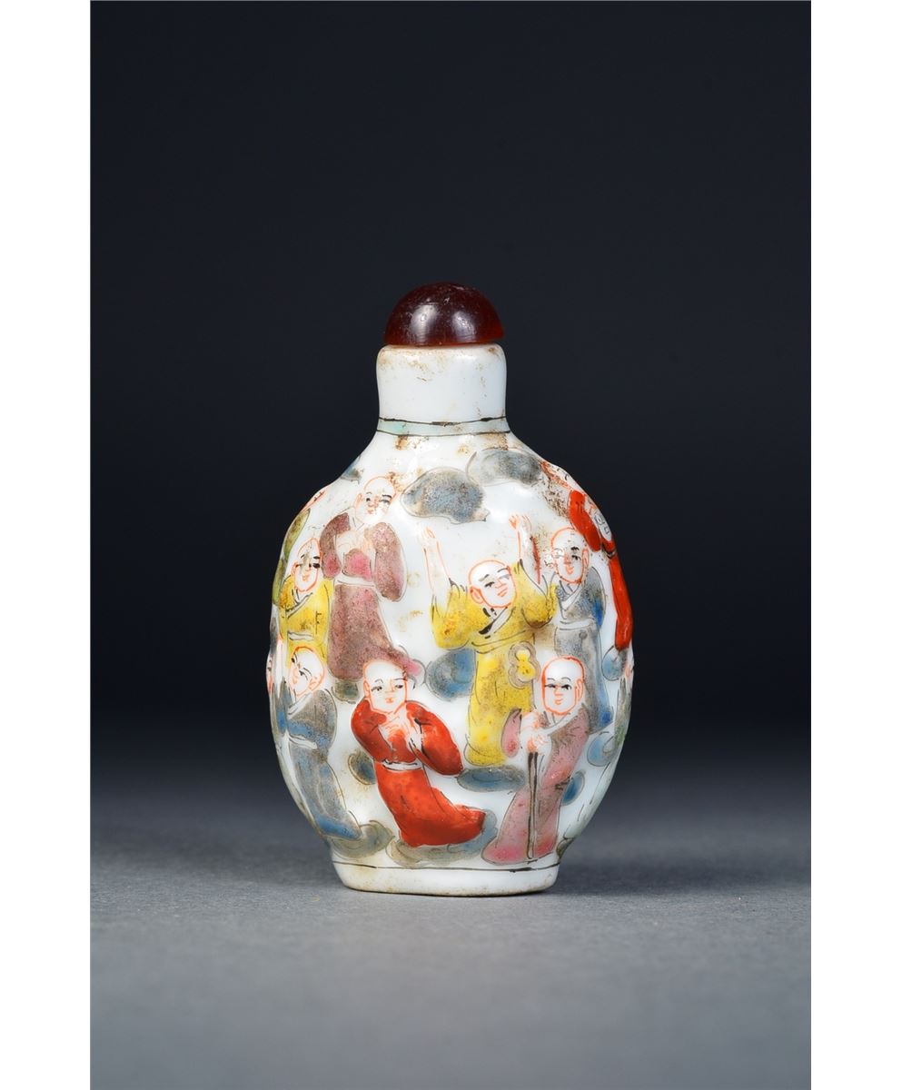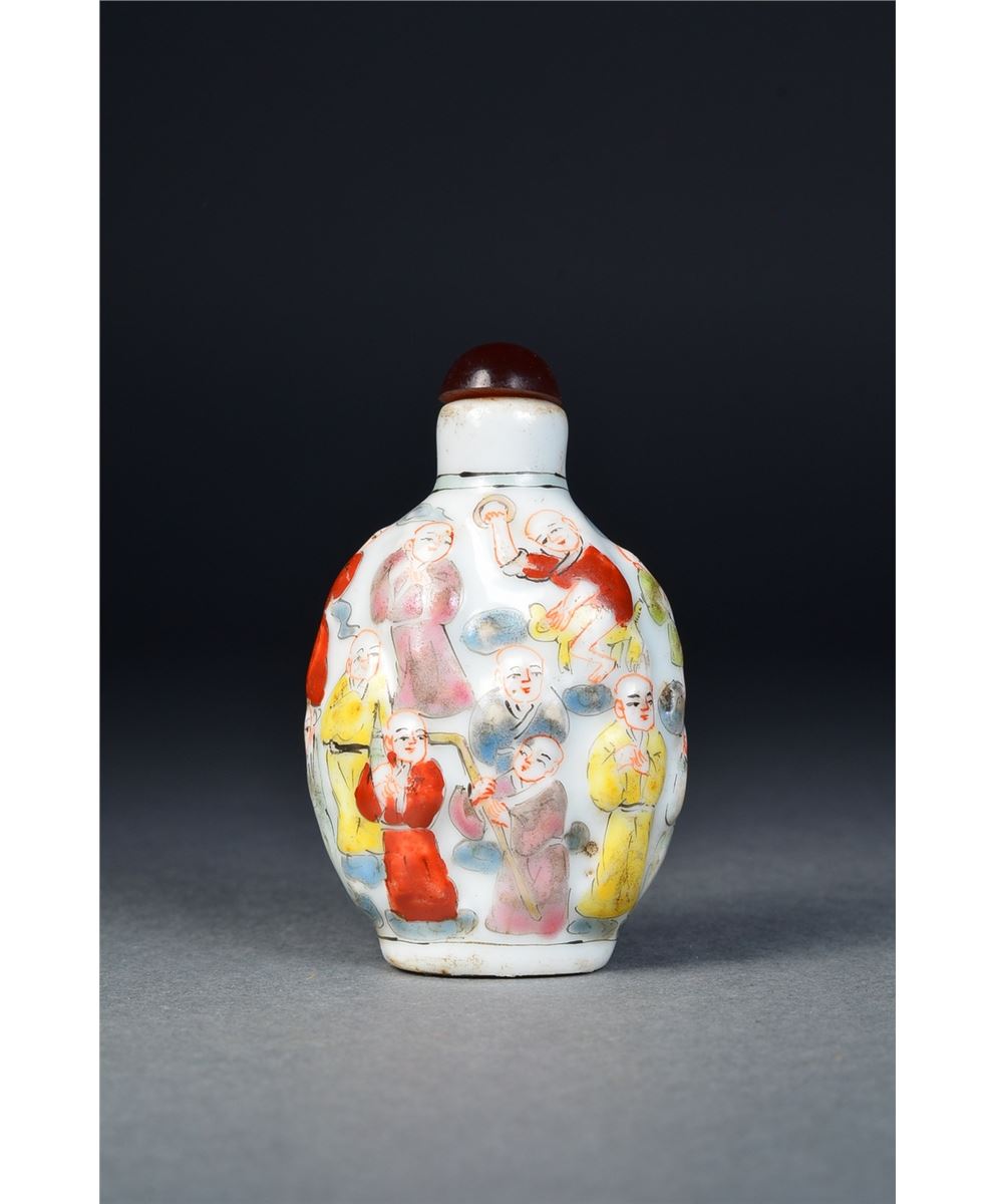 Chinese porcelain snuff bottle; flattened ovoid body featuring continuous figural scene of 100 Children carved in relief, matching stopper; H: 7 cm, W: 5 cm