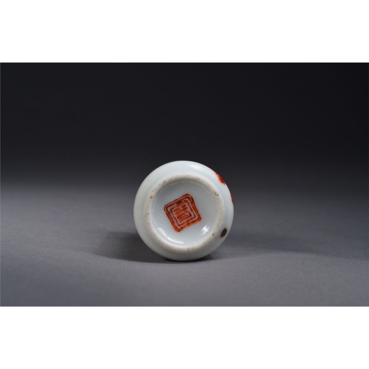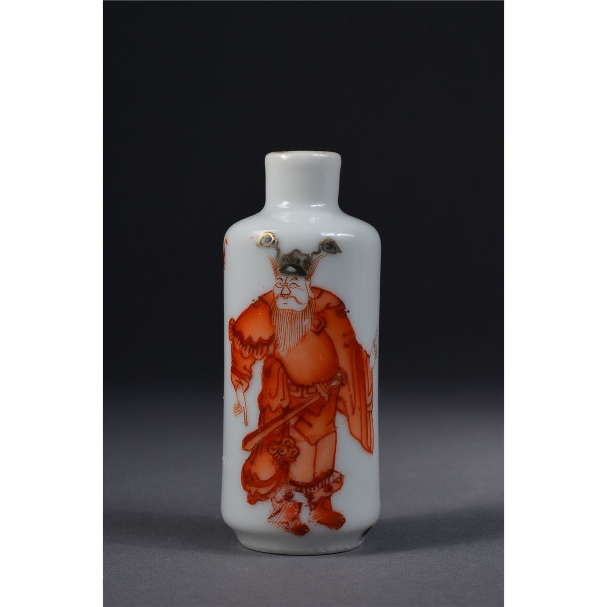 Chinese porcelain snuff bottle; cylindrical body featuring immortal; iron-red mark on base; H: 7 cm, D: 2.5 cm