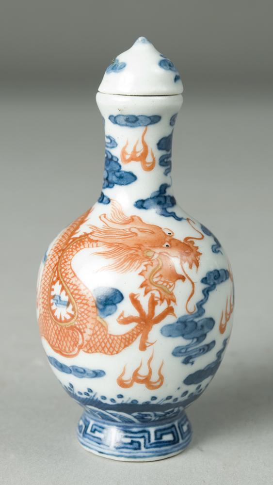 Finely decorated to depict 5-claw dragon in iron red chasing a flaming pearl, amid blue ruyi clouds with gilt highlights and Greek key border on bottom. Six character mark for Great Kangxi mark in blue underglaze on bottom. 3 & 1/8" H. 20th Century.