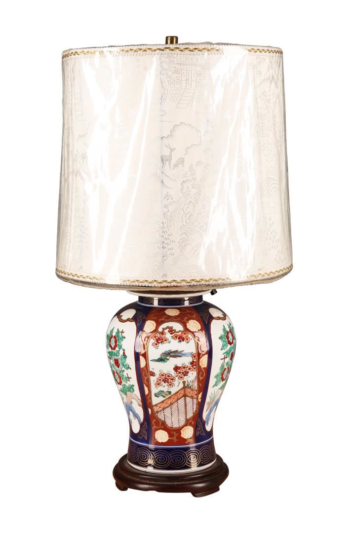 One Chinese porcelain ceramic table lamp featuring a beautiful Chinese painting on the body and shade of the lamp. No bulb, unknown if working. Dimensions: 23" tall, 11.5" Diameter shade.