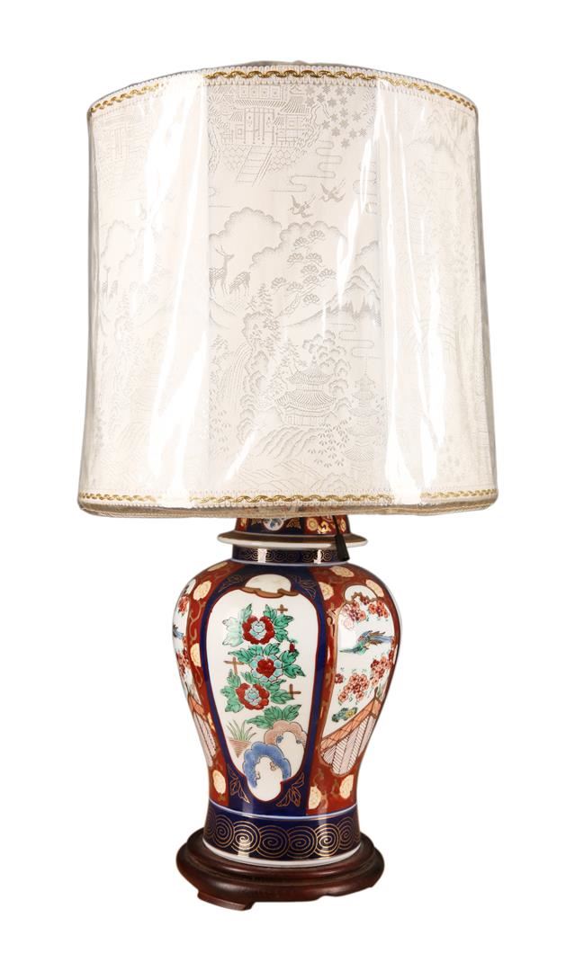 One Chinese porcelain ceramic table lamp featuring a beautiful Chinese painting on the body and shade of the lamp. No bulb, unknown if working. Dimensions: 23" tall, 11.5" Diameter shade.