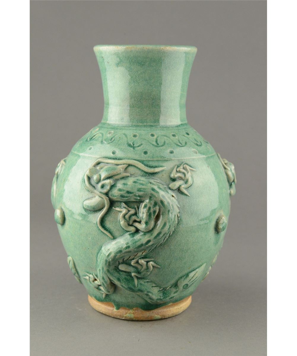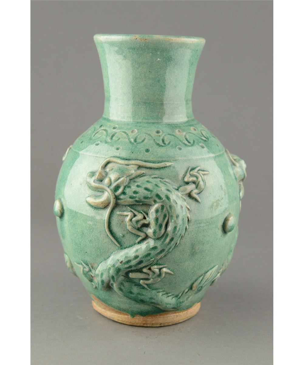 Of ovoid form, the pottery vase is decorated with three bulging dragons below stylized scroll and glazed with turquoise. H: 20 cm, D: 12 cm, 1020 grams. Provenance: T. Ng Collection, Toronto.