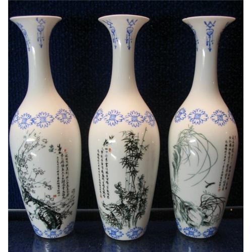 Fabulous trio of hand painted Chinese porcelain vases. They are exquisitely delicate, light, and seem as thin as eggshells. In perfect condition with no defects. Carefully decorated in blue, green red and black. A prize to treasure.