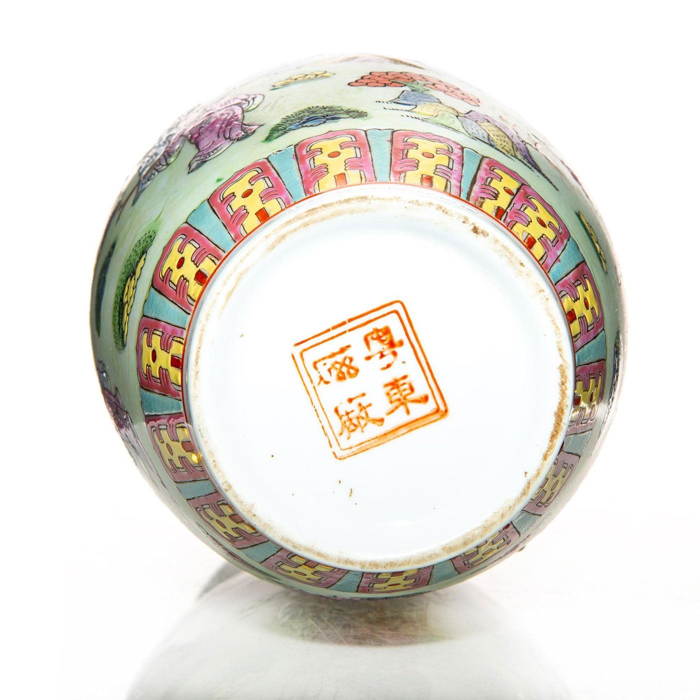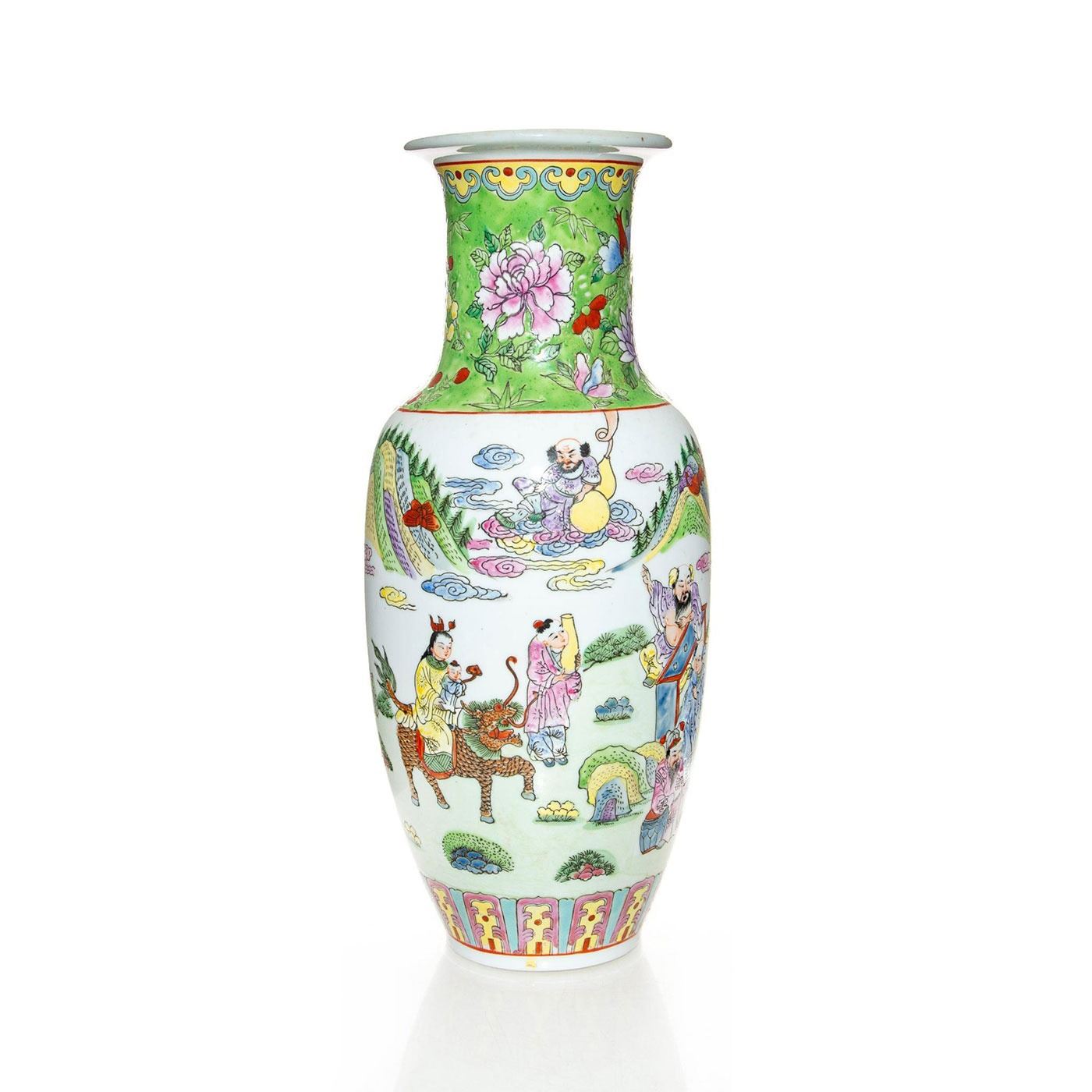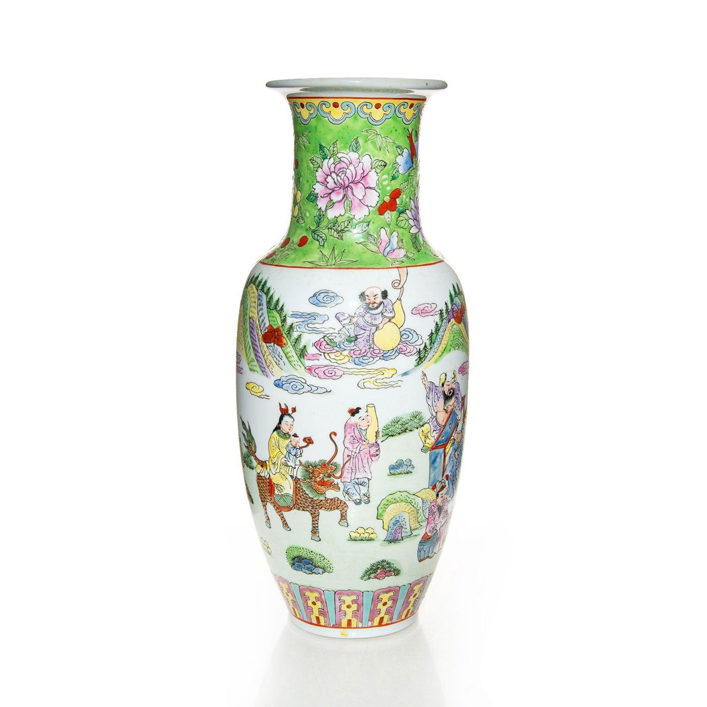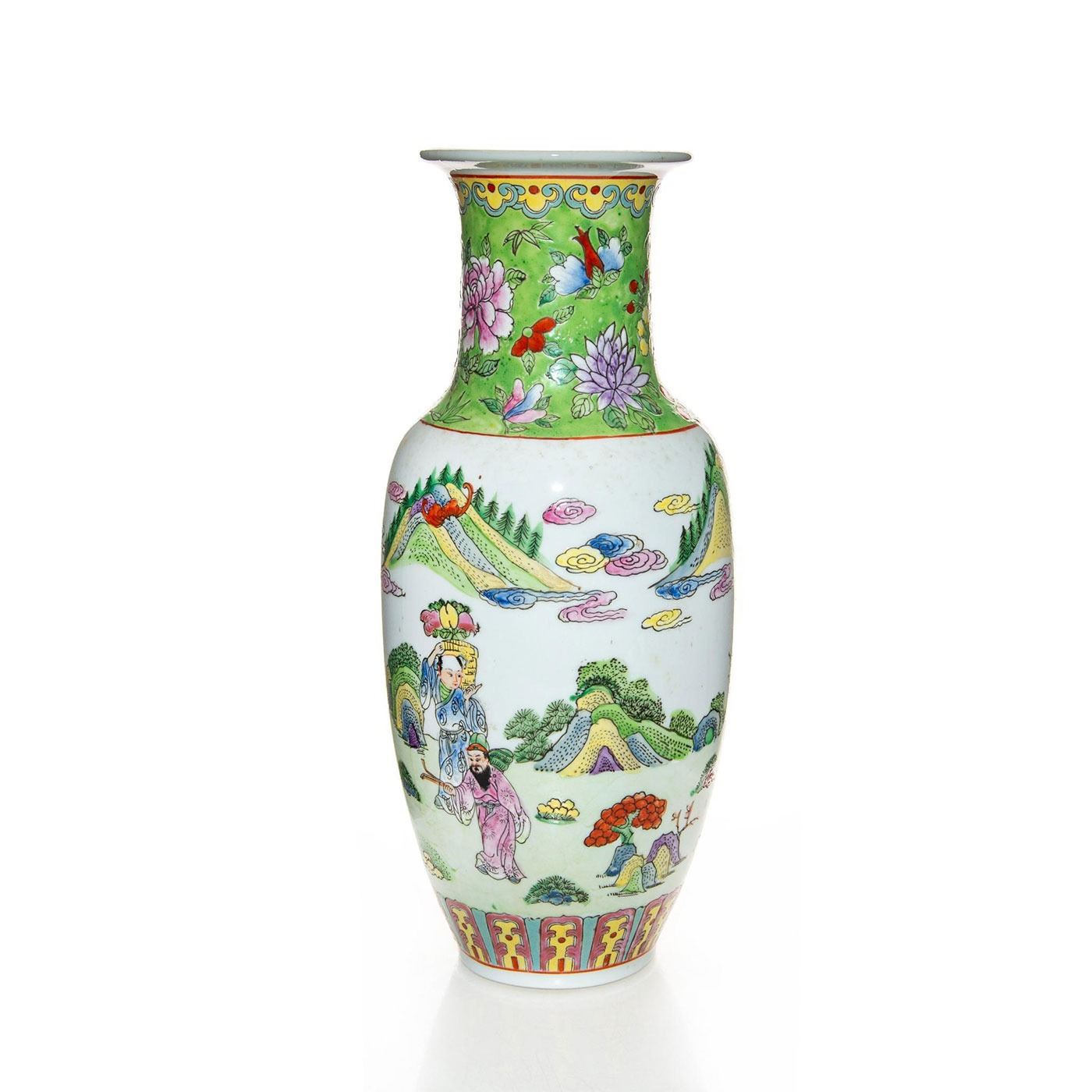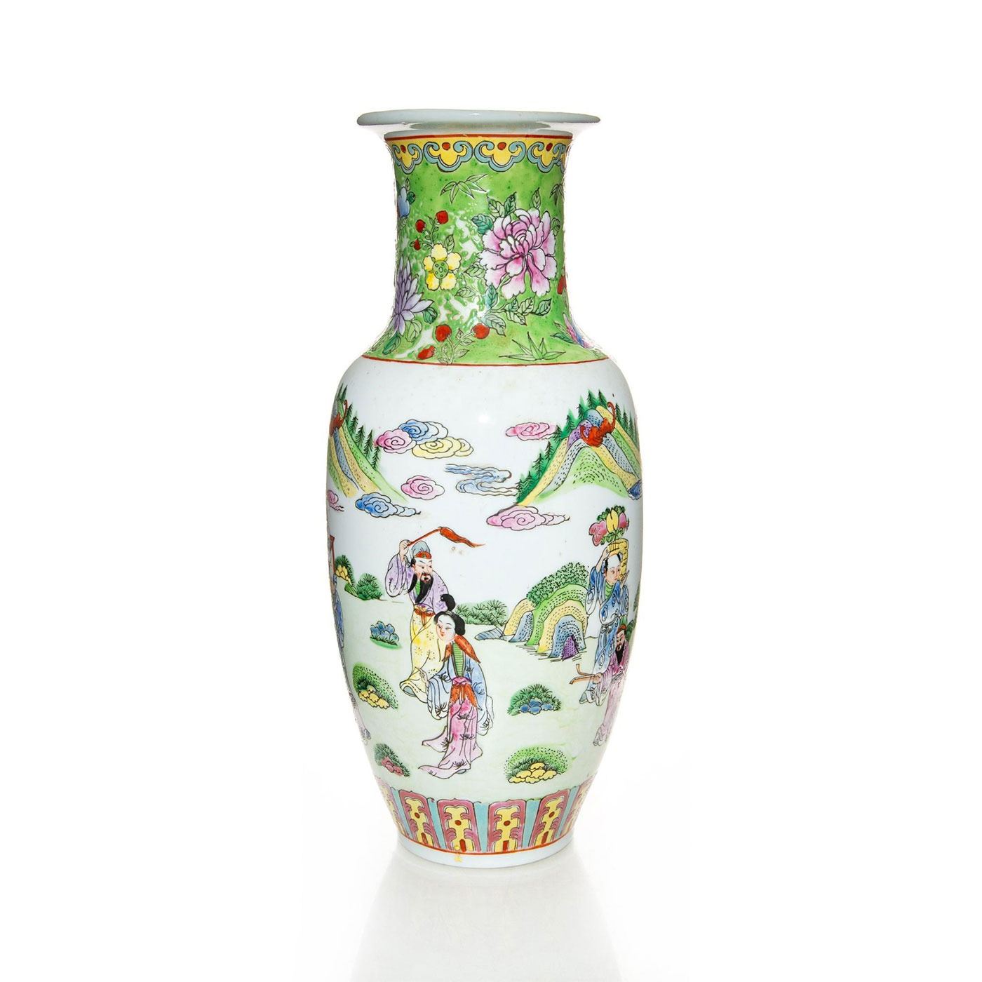 Porcelain Chinese vase with vivid colorful images. Stamp on bottom.