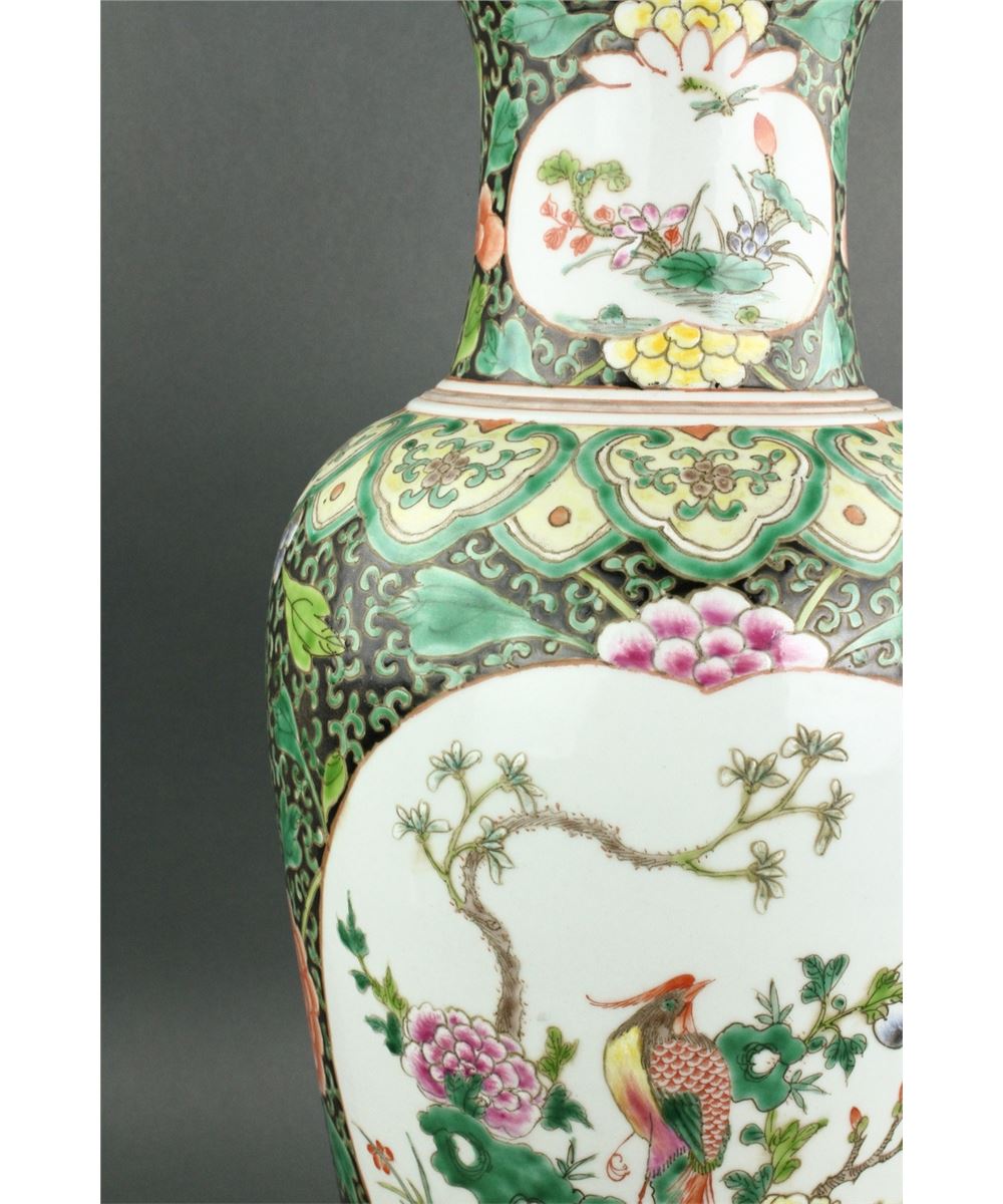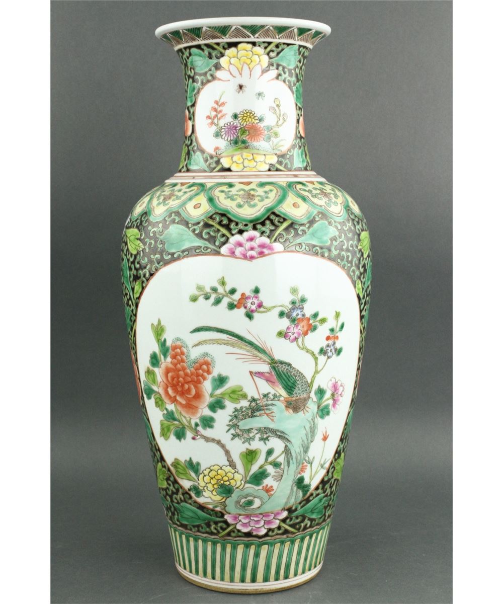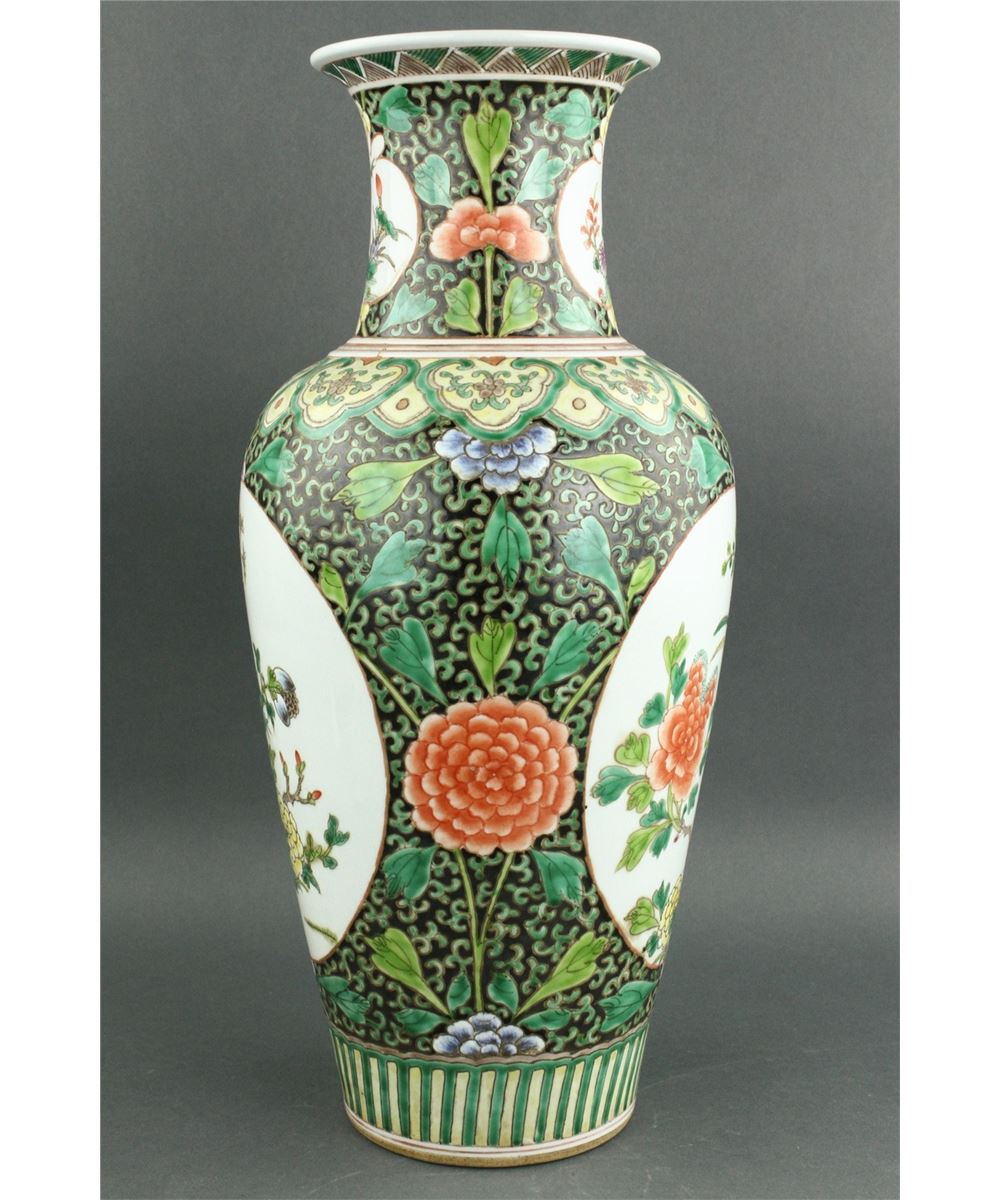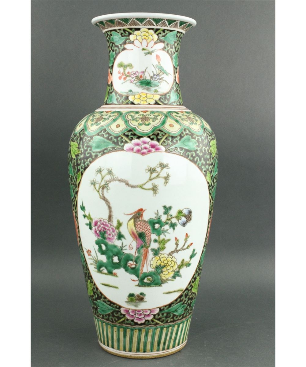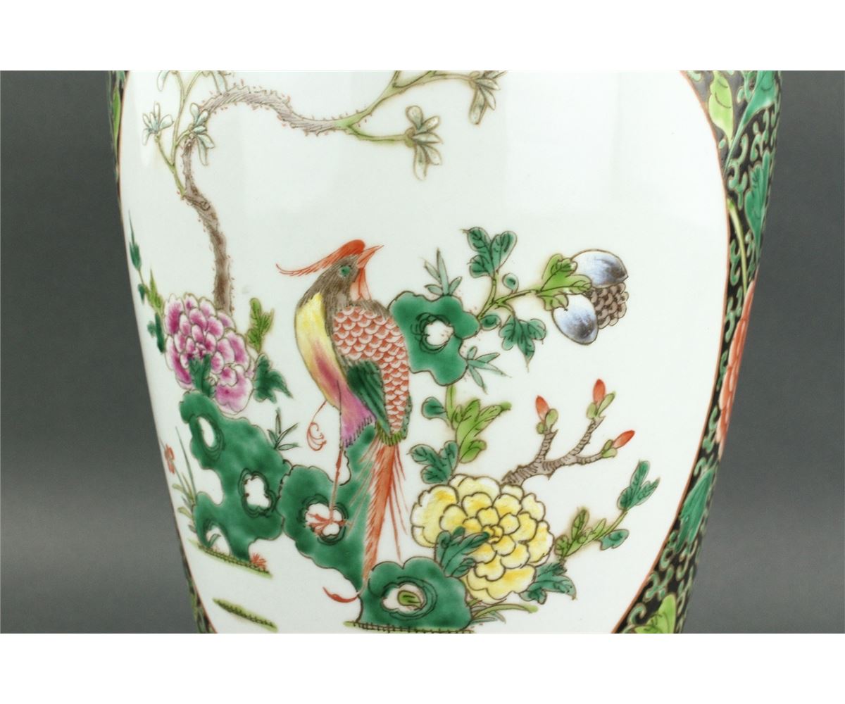 Chinese Famille Verte porcelain vase; Kangxi style; of baluster form with everted rim; featuring medallions of flowers and bird on floral scrollwork ground; six-character Kangxi mark on base; H: 40 cm, D: 18 cm, 2641 grams