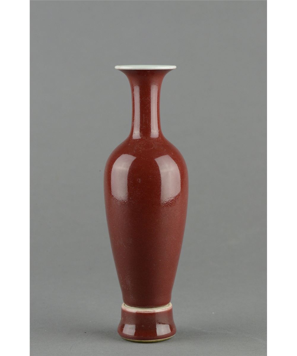Of elongated ovoid form, the copper red glazed vase with detachable ring as footing. Bottom marked six characters Kangxi mark. H: 18 cm, D: 6 cm, 232 grams.